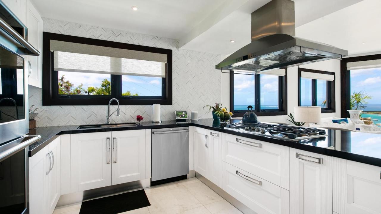 Agave Villa is a newly updated property that features a stunning kitchen and open-plan living and dining area that opens to a patio overlooking Sandy Ground Bay.