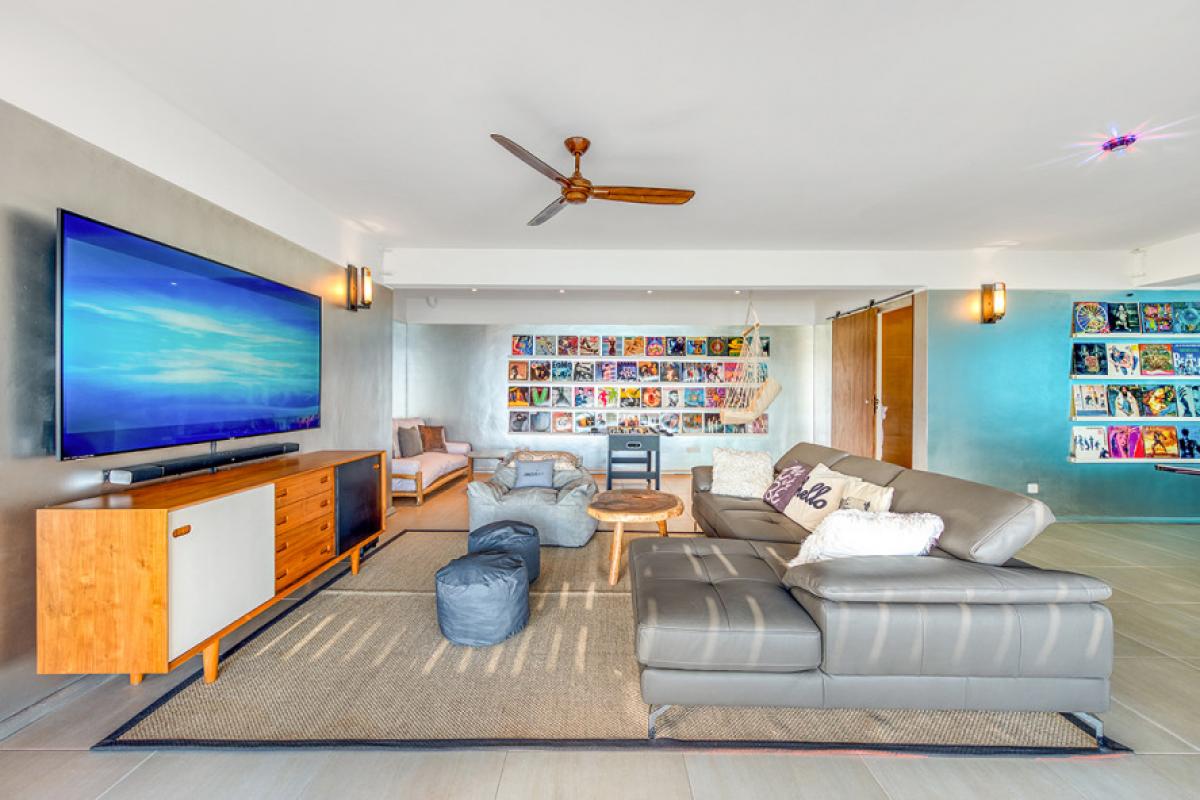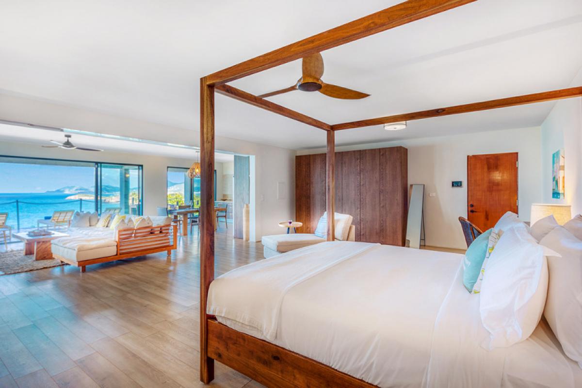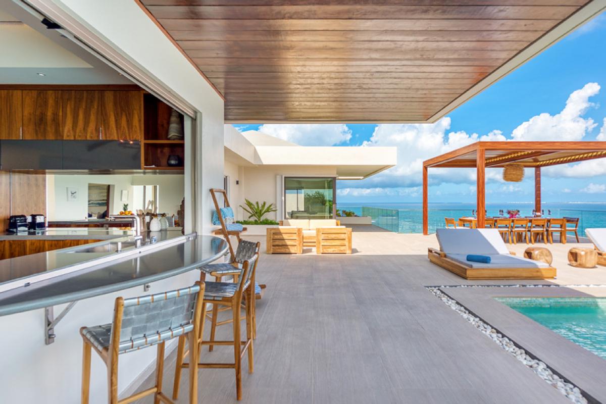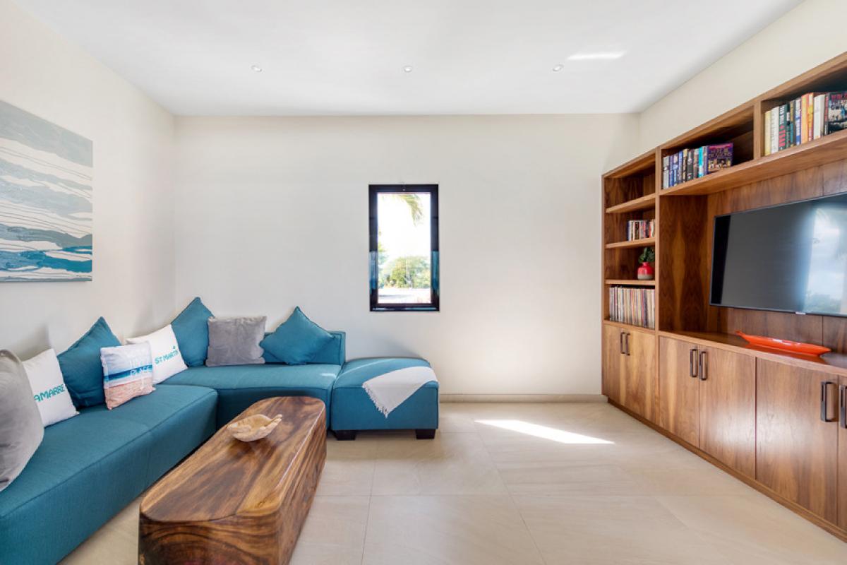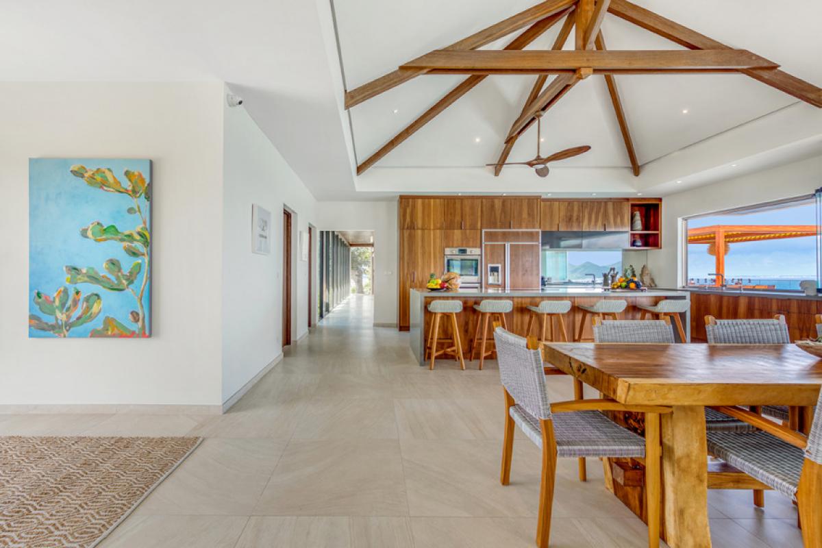 The interiors take full advantage of the view and outdoors. The great room is open and airy with a unique beamed ceiling, more like art than architecture. It is a stylish space with sleek contemporary lines blended with exotic touches; teak and rattan furniture are adorn with neutral fabrics and interesting art and décor. The interior layout makes this villa perfect for multi-generational families. The expansive great room seamless blends the lounging and dining areas with a beautiful modern kitchen in elegant woods, upscale appliances and a view.