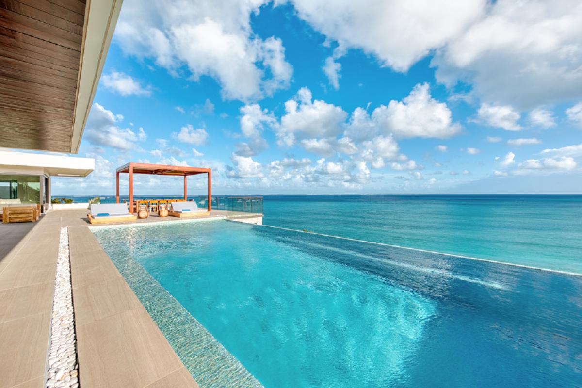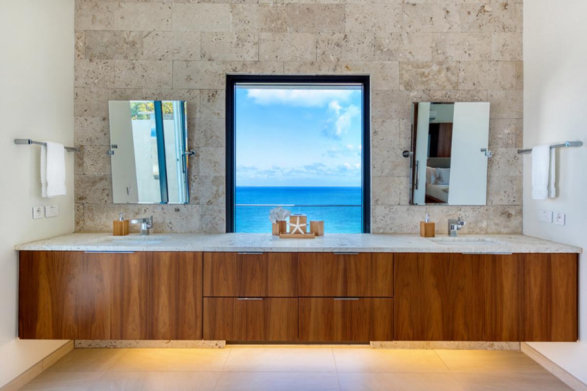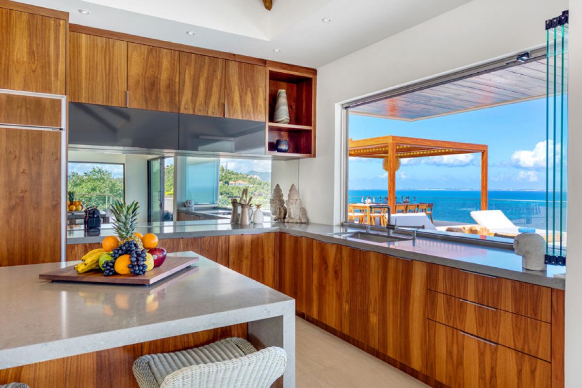 Amandara’s elegant gate opens to a long drive meandering past tropical plantings and decorative grasses. Arriving in the spacious courtyard, the minimalist façade and dramatic entrance dazzles with its stylish mix of exotic materials that continue into the interiors; soft cream travertine, dark woods and glass are used to perfection. Through solid glass doors, the stunning view greets you. Inside, panoramic vistas spans the great room like a master painting. The turquoise mosaic lined infinity pool creates a seamless visual transition from the interiors out to the sapphire sea, green mountains, Baie Rouge Beach and onto Marigot, Pic Paradis and the edge of Grand Case. It is a perfect place to watch the ever changing tropical sky.