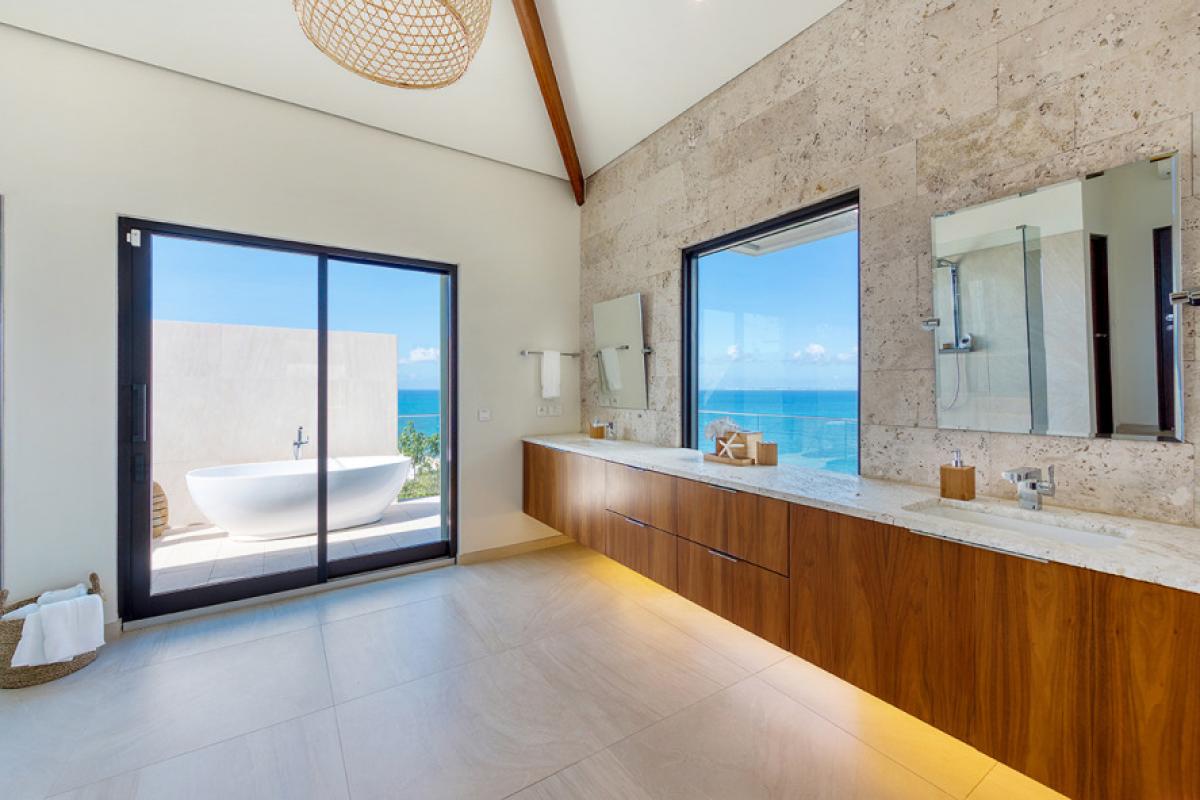 Four bedrooms, two masters and two smaller rooms, are all under one roof, each with a brilliant view and serene décor in white with gentle pops of color. The en-suite bathrooms exude a beautiful spa style attitude. The two masters have fabulous outdoor showers and tubes open to the sky. The fifth bedroom is a huge apartment on the lower level with an interior and exterior entrance plus kitchenette and large private terrace.