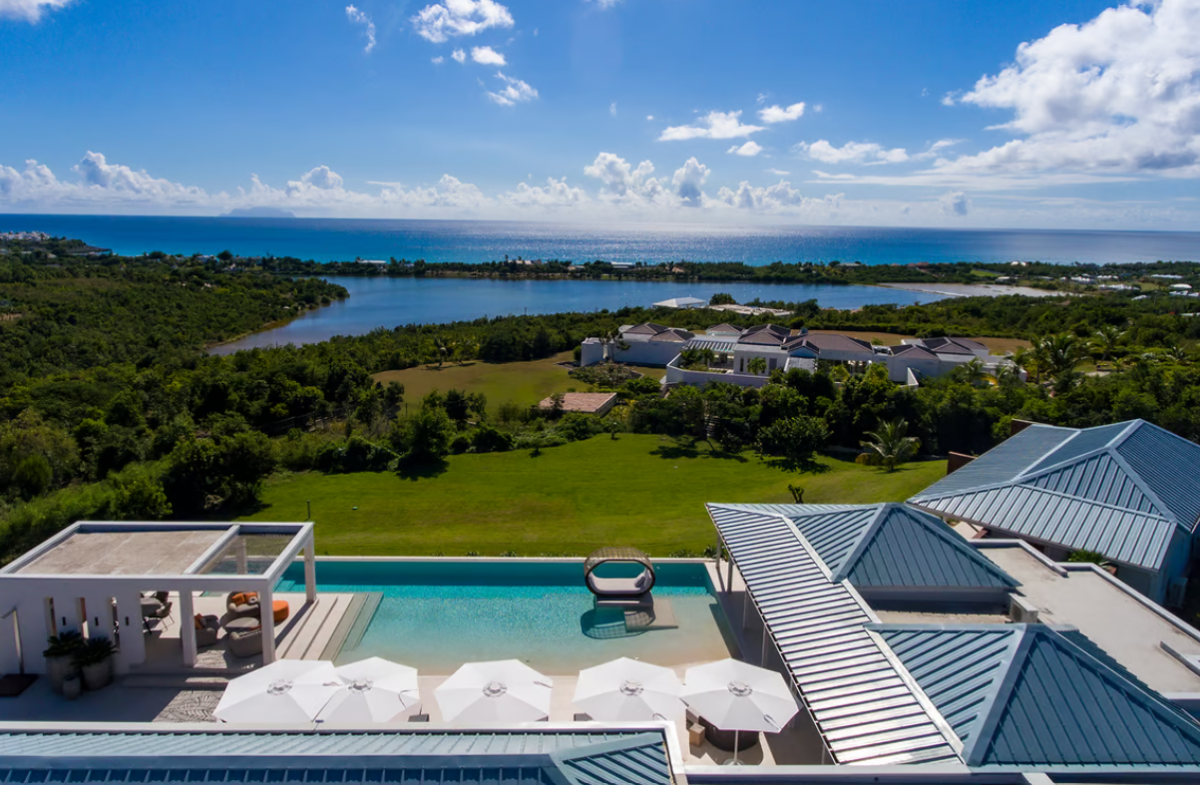 Experience the epitome of luxury at Avanti, a five-bedroom St Martin villa in Terres Basses that welcomes you with a palm tree-lined, gated driveway and stone fountains. The home features breathtaking 180-degree ocean views, a lush lawn, and an L-shaped saltwater pool with a built-in table, seating area, and "island" daybed.