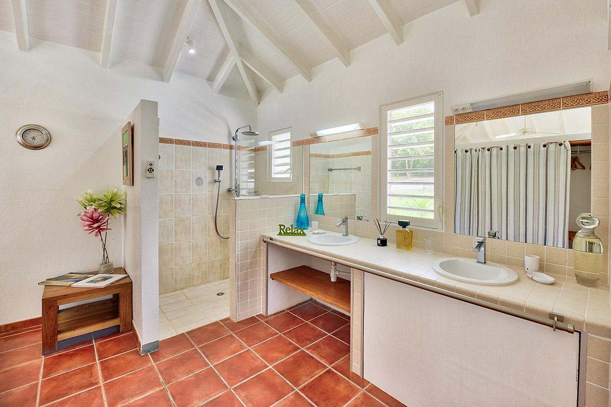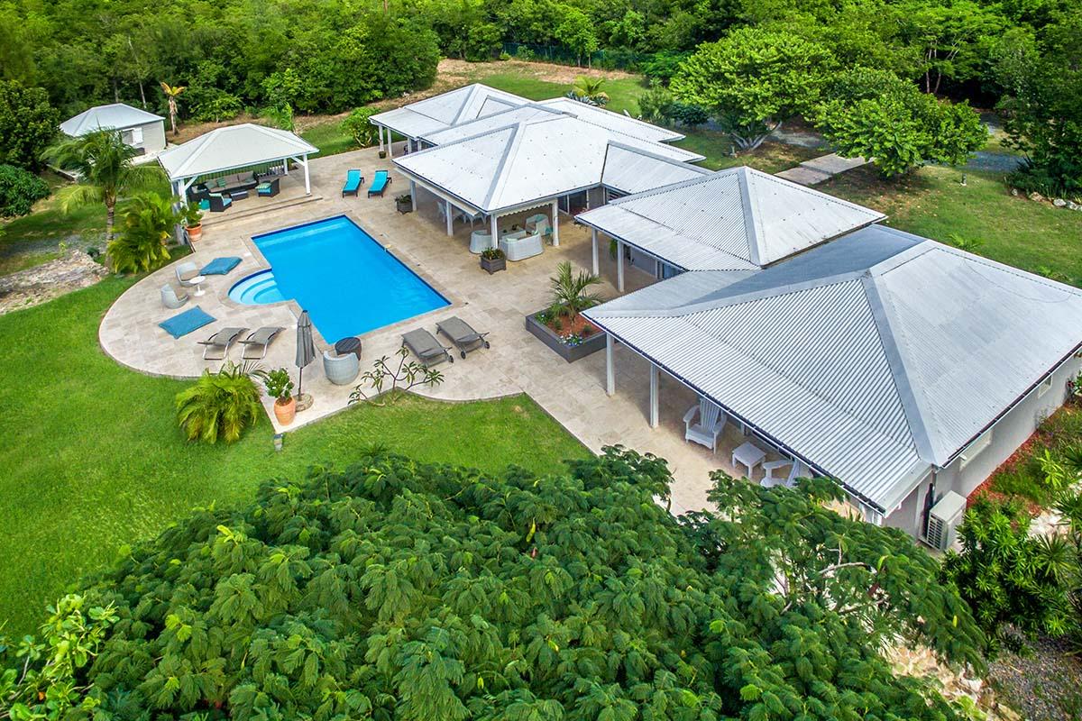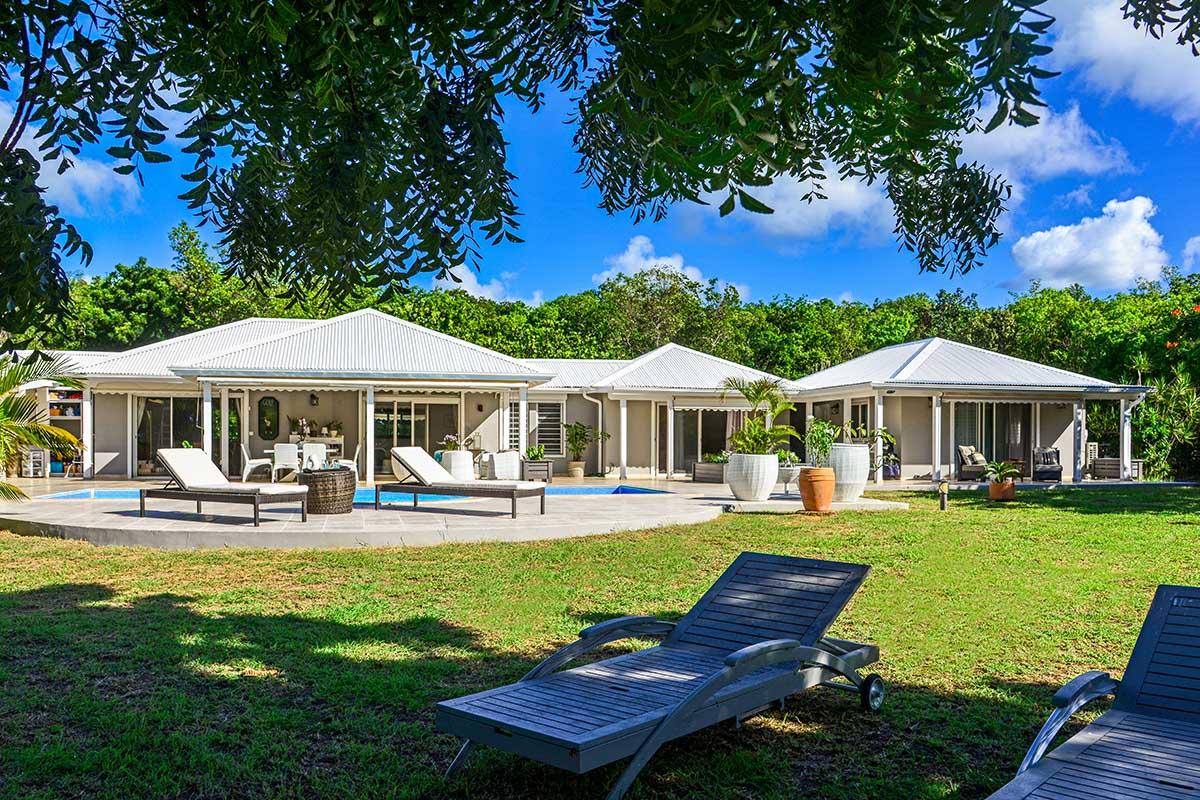 The main house is filled with charming Caribbean touches with a contemporary twist. The exterior’s soft grey and white colors and Creole flourishes well suit the tropical green setting. It is a very well curated villa, both inside and outside, filled with interesting colors, textures and décor. The overall mood is serene. The terraces are defined with travertine tiles. A large pool sits at the edge of the terrace and lawn. A spacious gazebo and deep verandahs provide generous covered spaces for dining and lounging. Stylish white wick furniture, adorned with interesting fabrics and colors, invite you to relax.