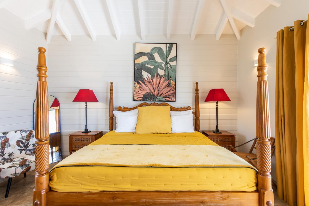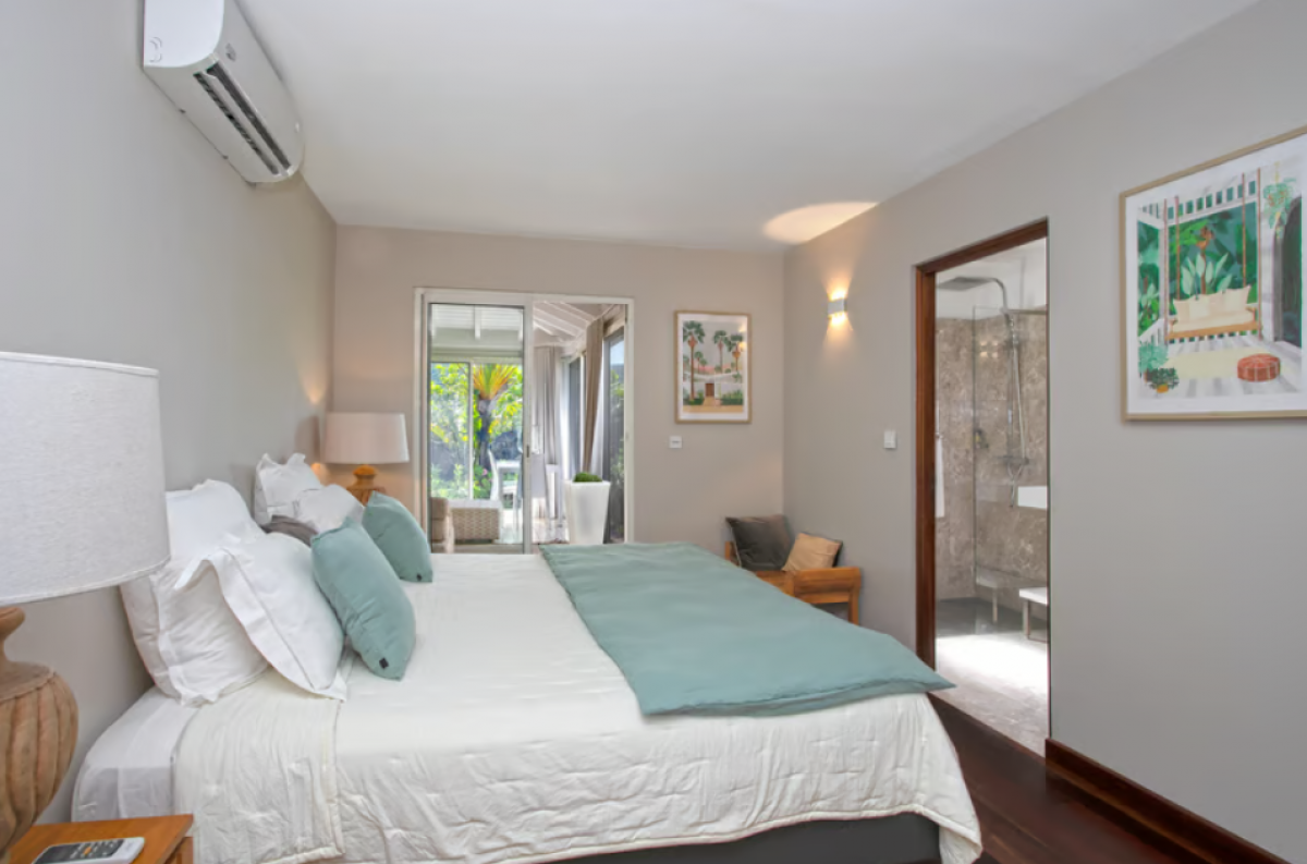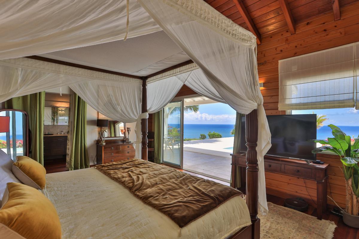 Bedroom 5: King-sized bed, an ocean view, a fan, and air conditioning. This room also has an ensuite bathroom.