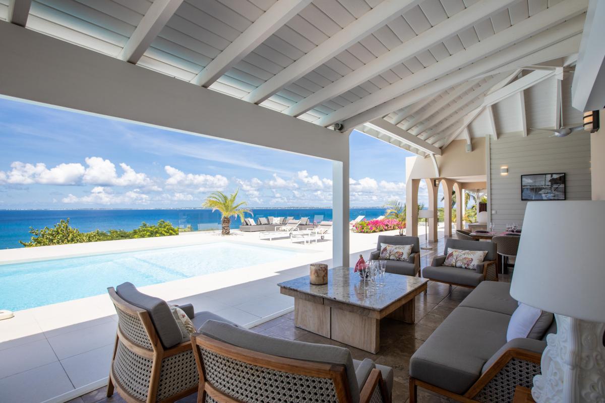 This contemporary yet exotic villa provides the best of stylish indoor and outdoor living. Expansive terraces, in sand color stone inset with tropical plants, create a perfect flow from indoor out to the sea. Center stage is the large main pool accented with an encased Jacuzzi. A smaller plunge pool creates a private little oasis. Covered terraces filled with elegant teak furniture provide comfortable spaces to gather for lounging and dining.
