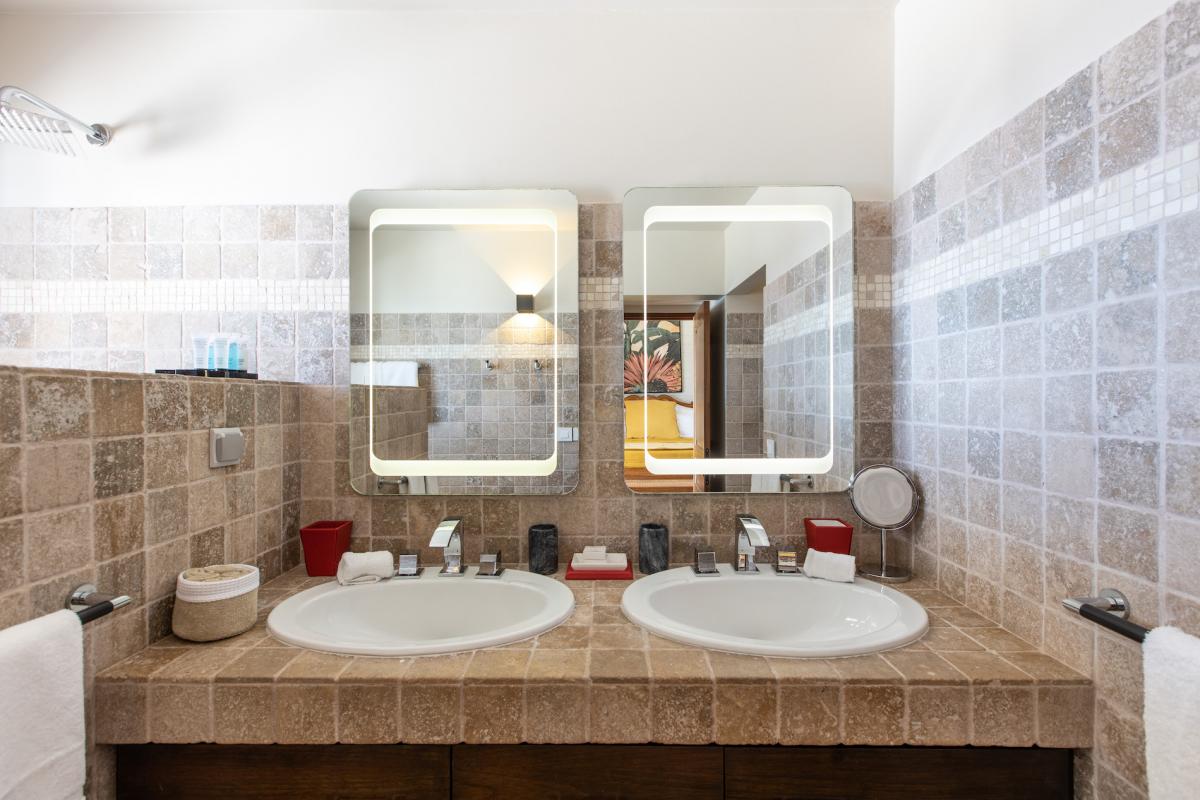 The villa also has a beautiful fully equipped gym/spa housed in a wood walled space that opens to the views. The five bedrooms have private en-suite bathrooms. Each is beautifully and colorfully decorated, reminiscent of a house in Bali. Each bedroom has a unique color scheme blending naturals with rich shades all accented by teak or exotic painted furnishings. The fourth bedroom connects to a private terrace, creating a perfect spot for children. The twin beds can also be converted into a king bed for a couple. The spa style bathrooms mix sandy beige tumbled marble tiles with mosaics and dark woods, marble countertops and stainless fixtures.