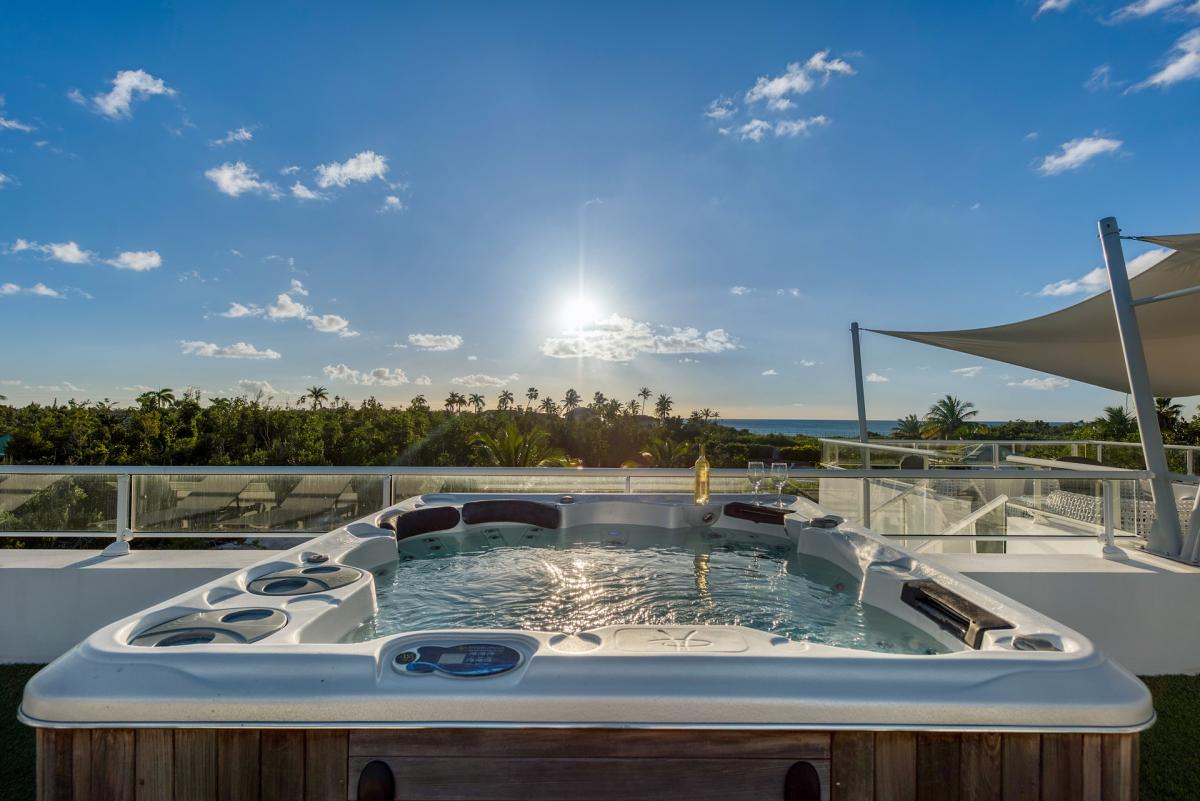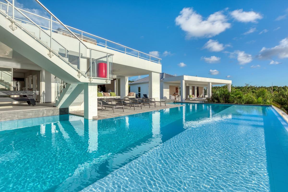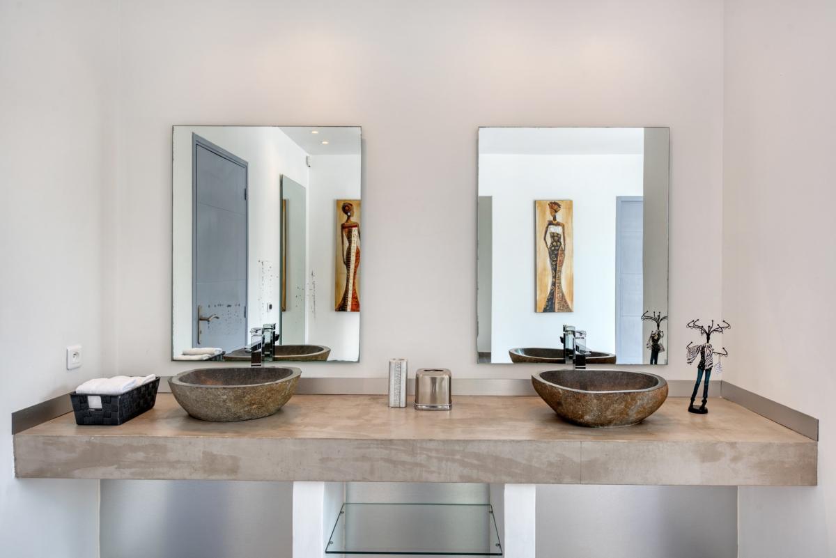 Grand Palms is a sleek contemporary villa is perfect for individuals seeking serene privacy, yet walking distance to the beach. Set in a palm filled garden, the elegant lines of the house draw you to the calming view. Green tropical foliage edged with the sapphire rim of the sea creates a peaceful atmosphere. This is a space to relax with a book or glass of champagne and totally forget the world. While great for small families and groups of friends, it’s perfect for honeymoon couples. It has an intimate and romantic feel.