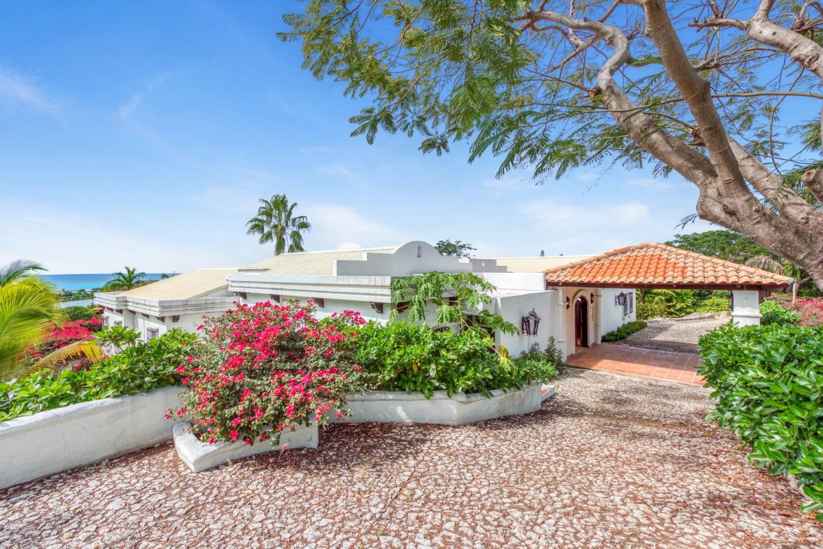 Hacienda is an elegant Spanish-Caribbean style villa designed to capture spectacular views and maximize outdoor living. The covered courtyard entrance with its Old World wooden doors, tiled floors and exotic plantings creates the perfect introduction to a stunning tropical view. Framed by royal palms and pink bougainvillea, the view is a panoramic vista filled with shades of blue from the sapphire sea to the deep blue sky; gorgeous in daytime; spectacular at sunset.