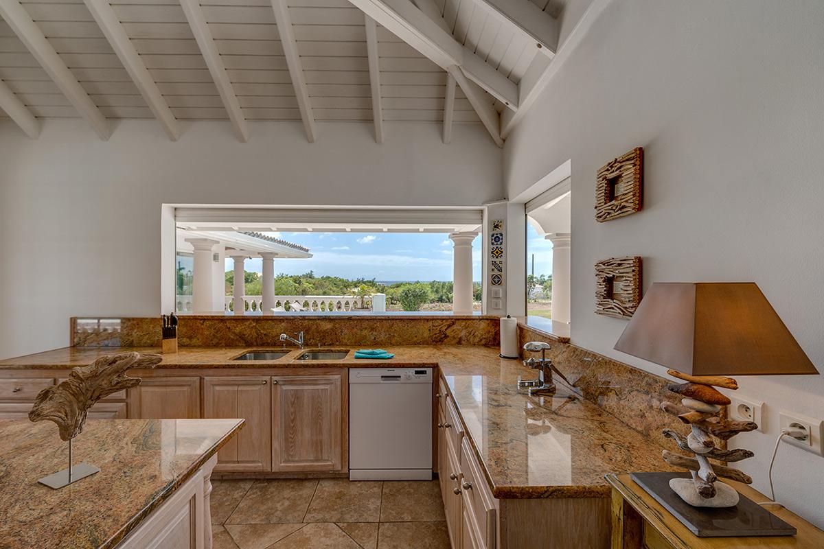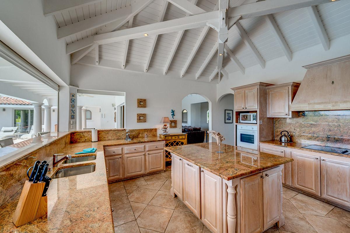 Each interior room has a sea view. The large open plan great room, fully open to the terrace by floor to ceiling sliding glass doors, has a serene attitude. Comfortable seating in taupe with soft pops of color is accented with light woods and interesting accessories. Arched doors and windows add an exotic touch. The beautiful French country style kitchen looks out to the sea and the pool area. It’s an inviting space for a professional or amateur chef.