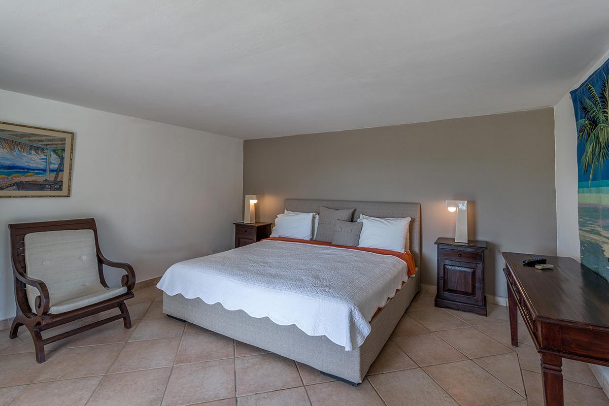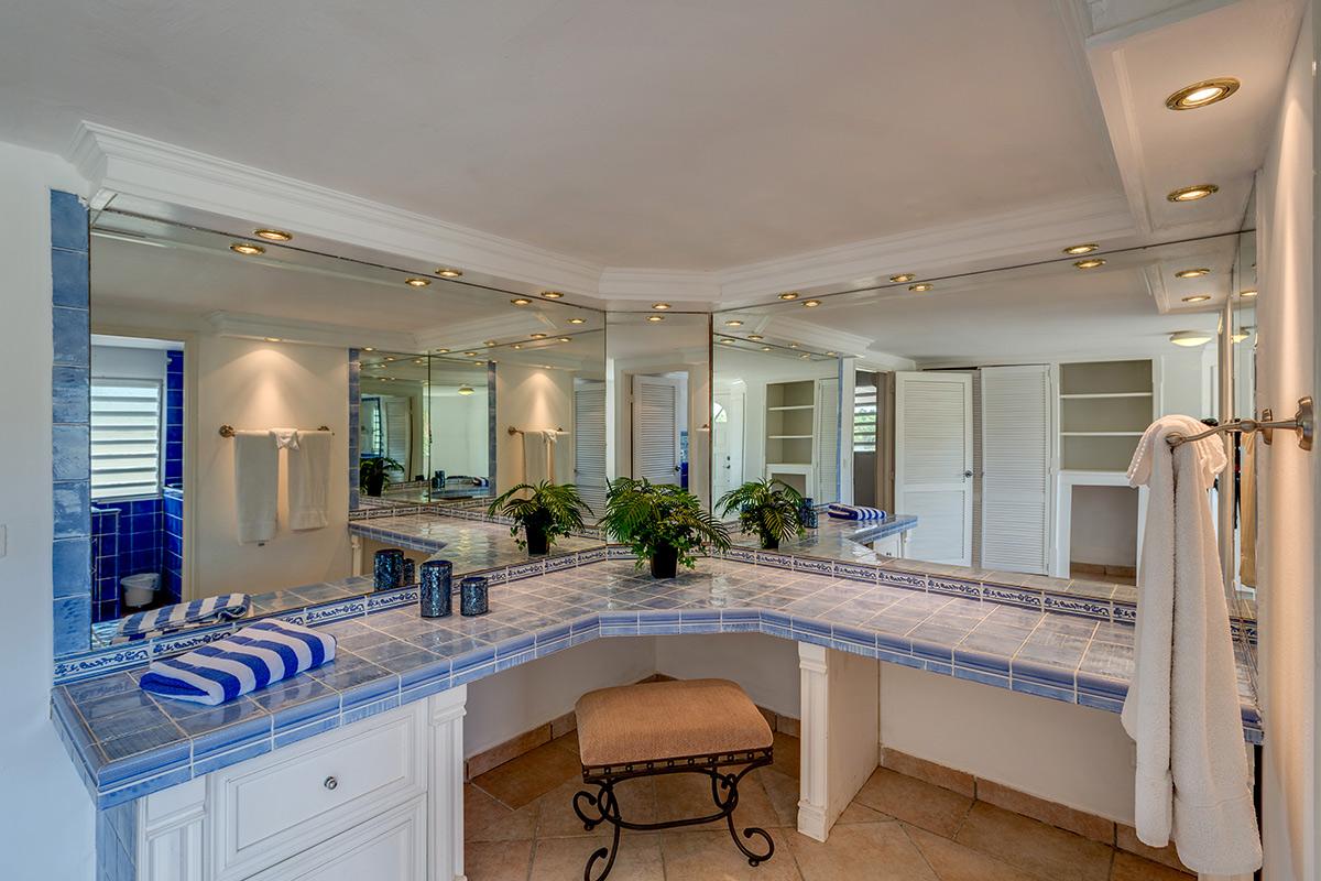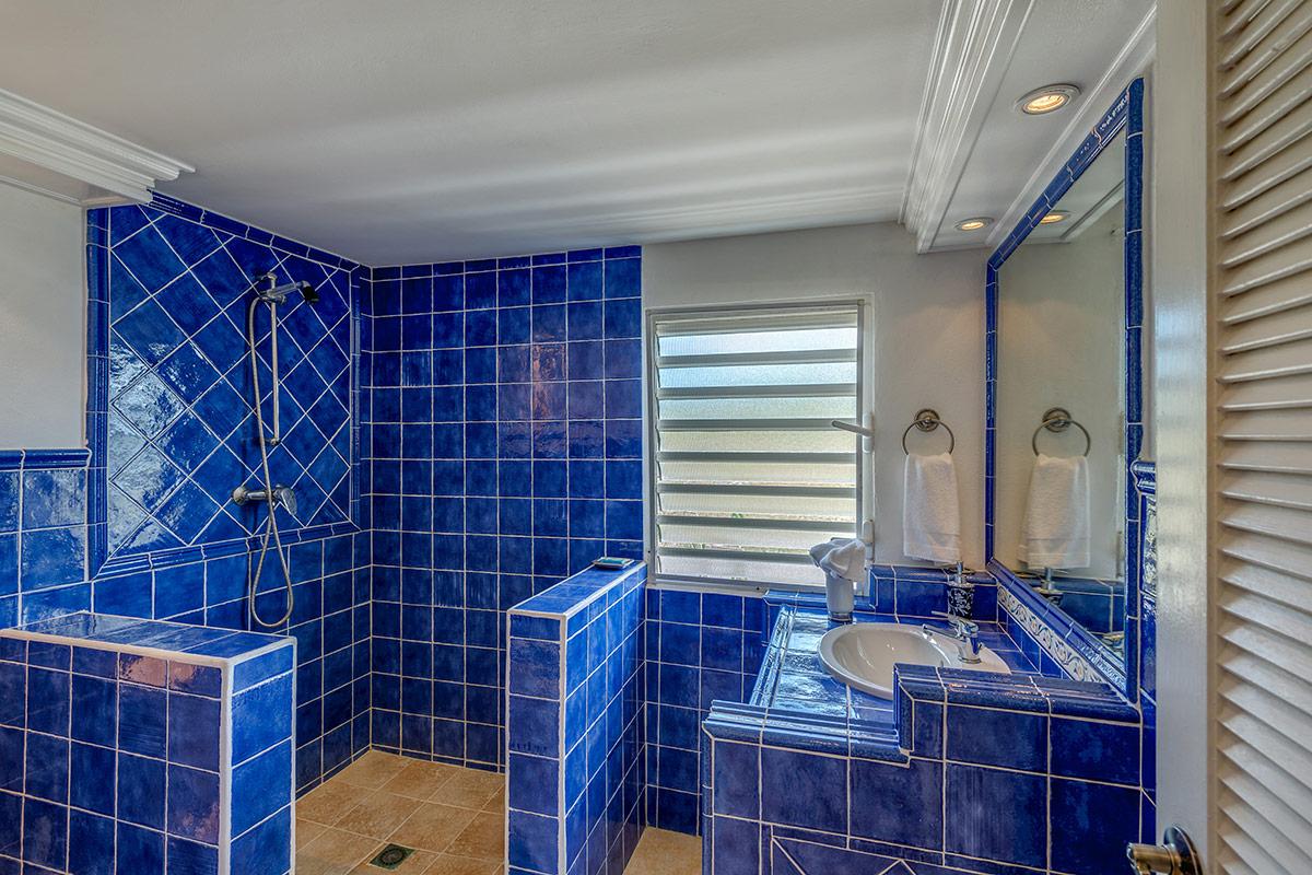 Three equal size bedrooms are on the upper level on either side of the great room each with a sea and garden view. The attitude is softly modern in rich neutral tones accented with interesting art, charming touches and comfortable furniture. The en-suite bathrooms are simply beautiful in exotic mosaic tiles, granite counter tops, flattering lighting and stylish cabinetry. The very private fourth bedroom is on the lower level with a large private terrace; the view encompasses the lush garden. The colorful en-suite bathroom is outfitted in exotic Moroccan blue tiles.