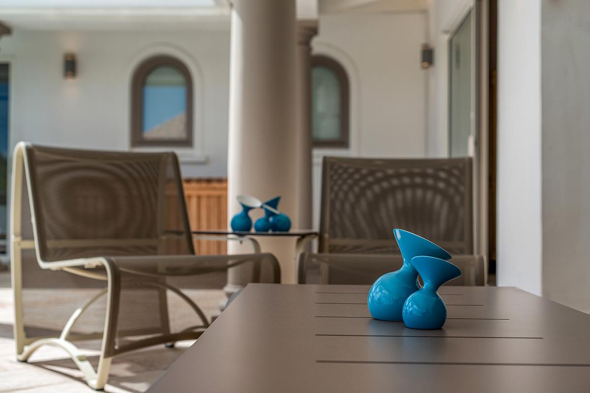 The outdoor spaces seamlessly flow from the interiors to the large poolside terrace, visually connected by soft taupe and faux wood tiles underfoot and beautiful columns that separate the covered loggias from the open deck. The spacious terraces provide lots of cover for al-fresco dining and lounging.