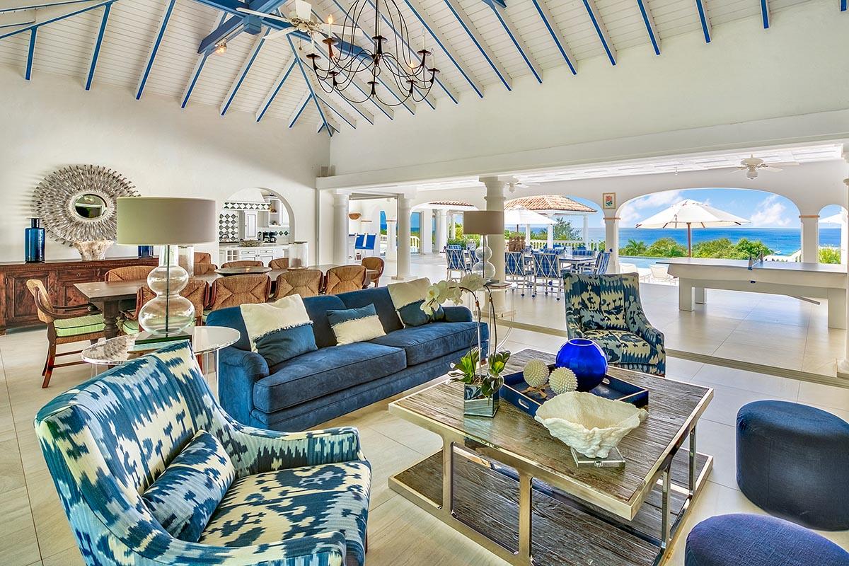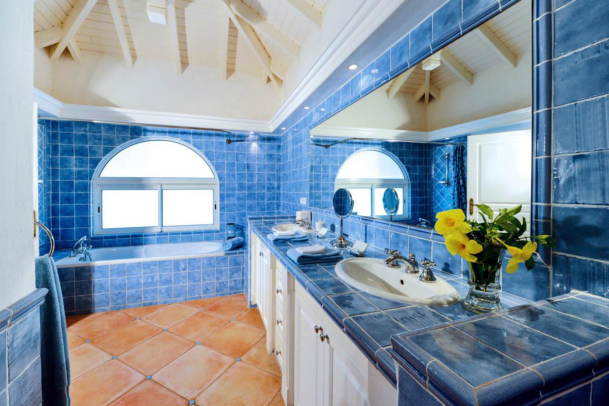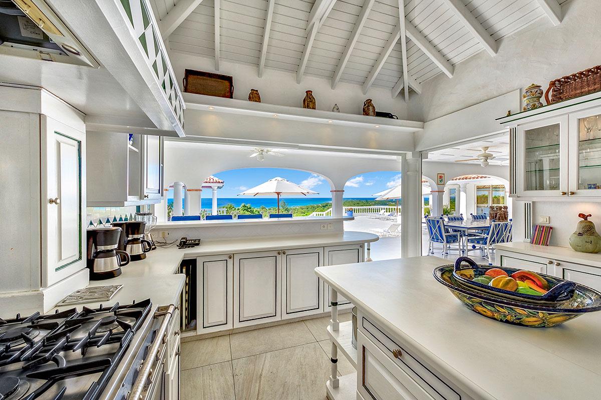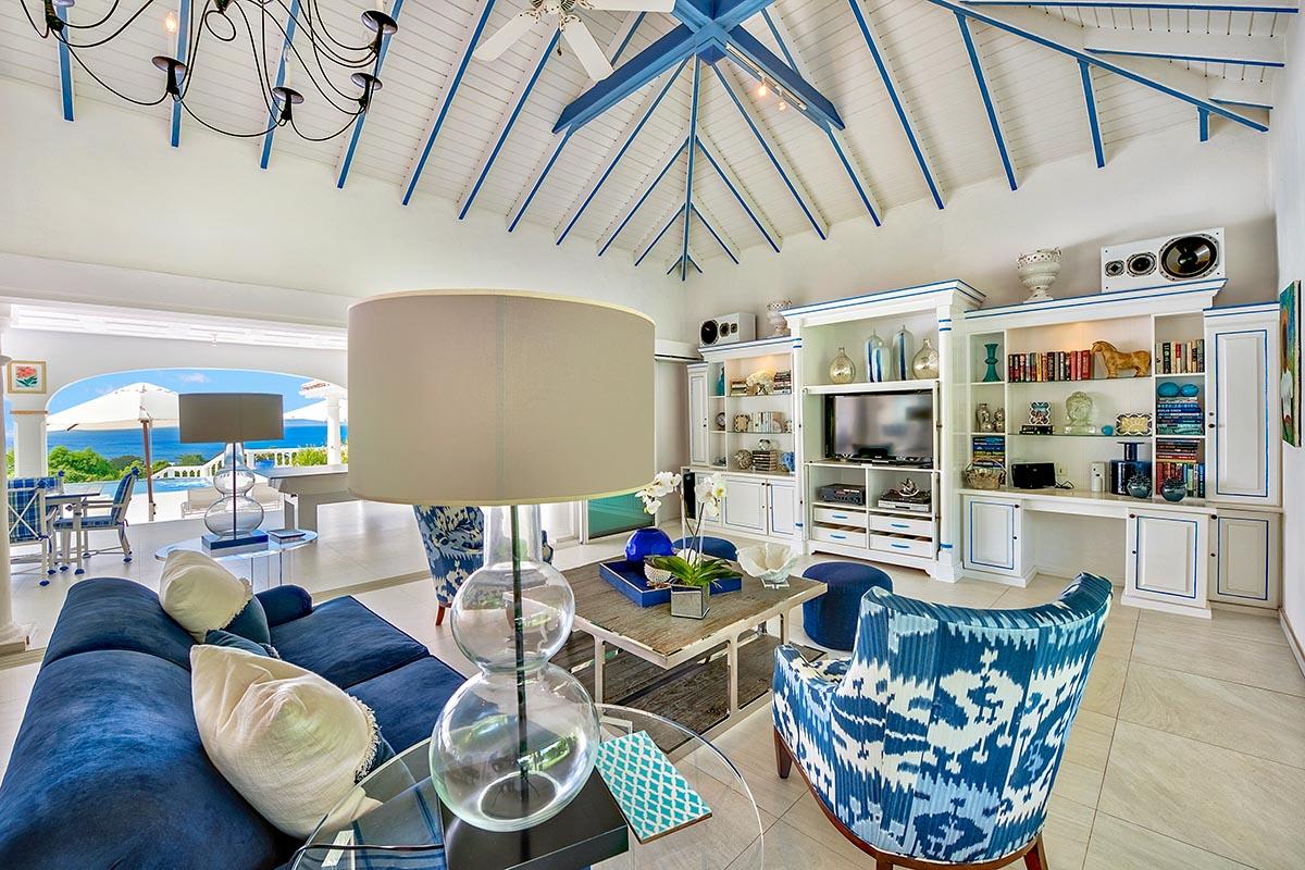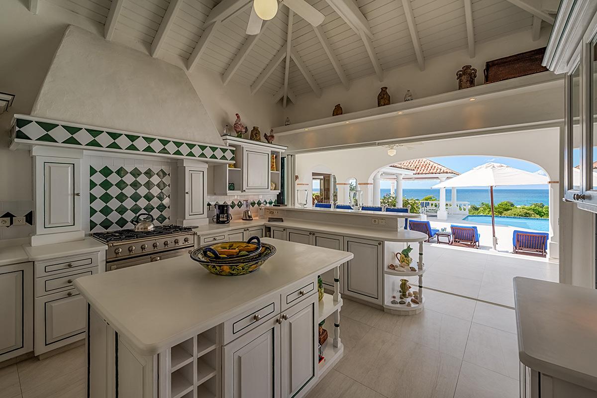 The interior great room is very spacious and casually elegant, perfect for gathering. Sliding glass pocket doors open the room to the view and breezes. New contemporary furniture in the living room include the colours of the sea & sky and complement the rest of the interiors. The soaring ceilings are popped with blue trim, a design theme repeated throughout the villa. The pretty French Country kitchen in blue and white Provence tiles features a stunning French stove and beautiful views. A barbeque sits just off the kitchen.