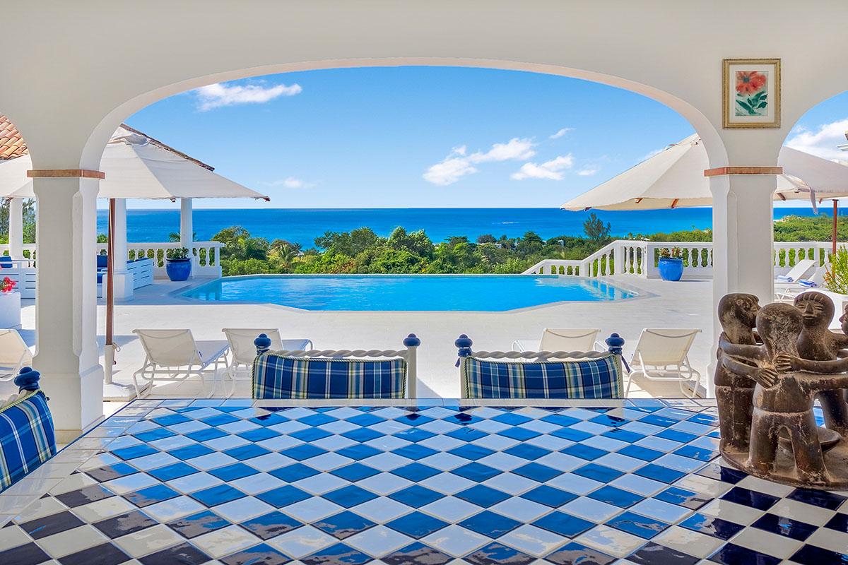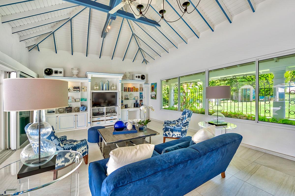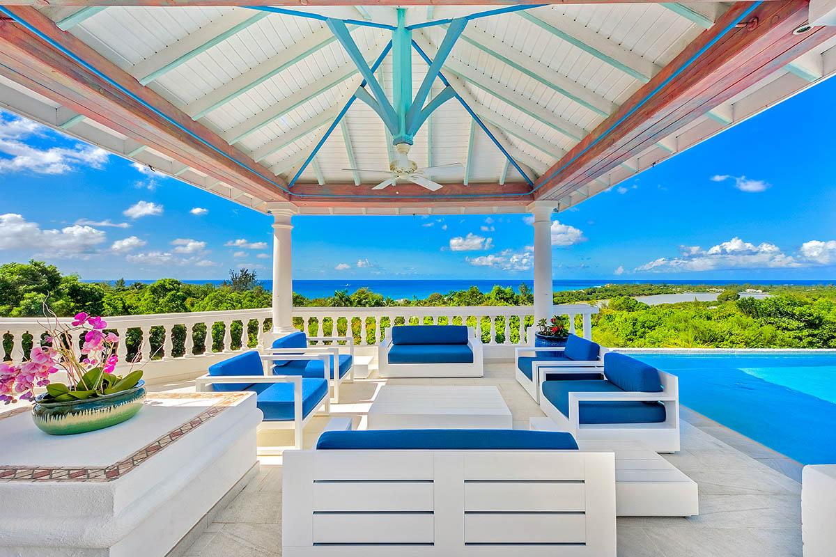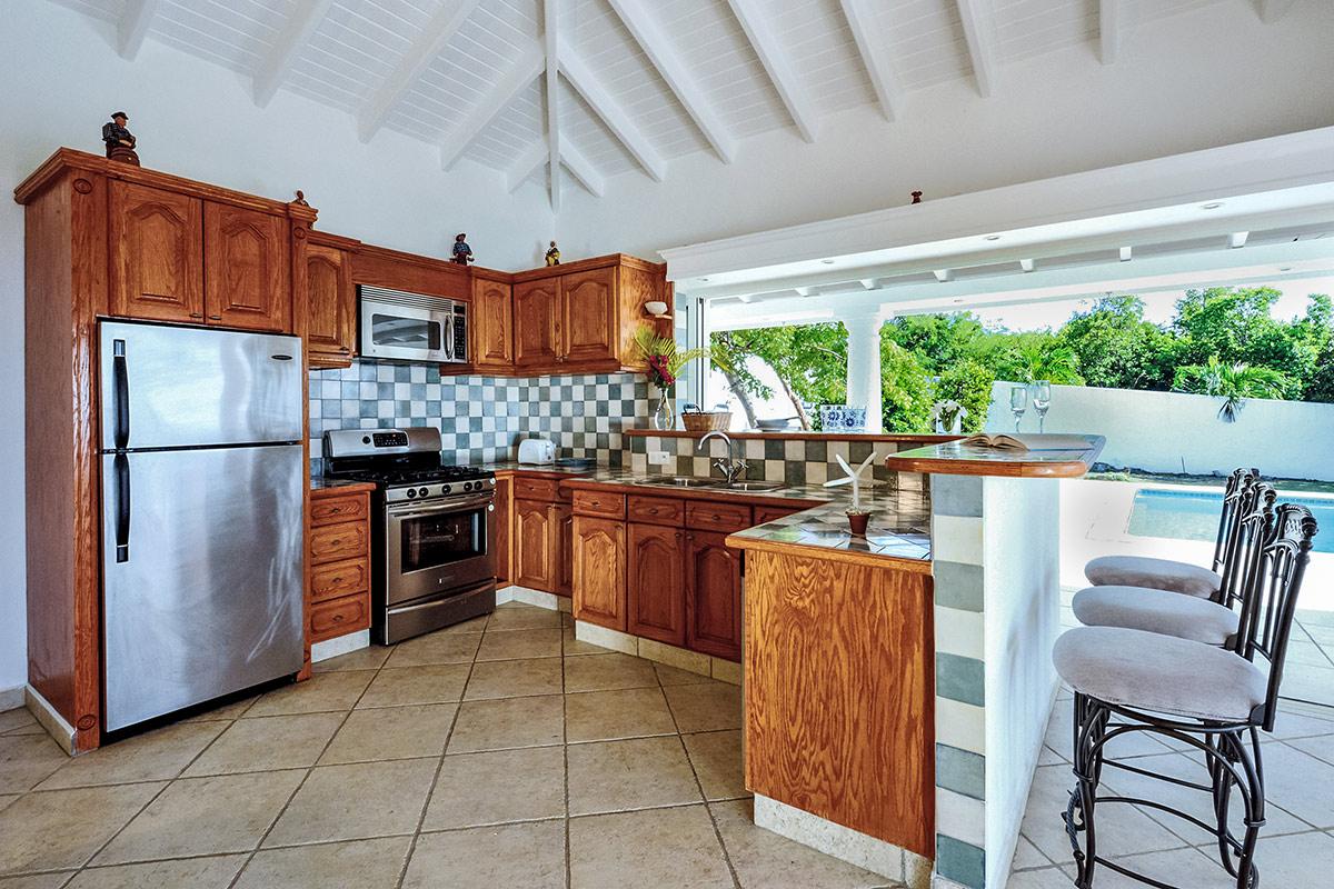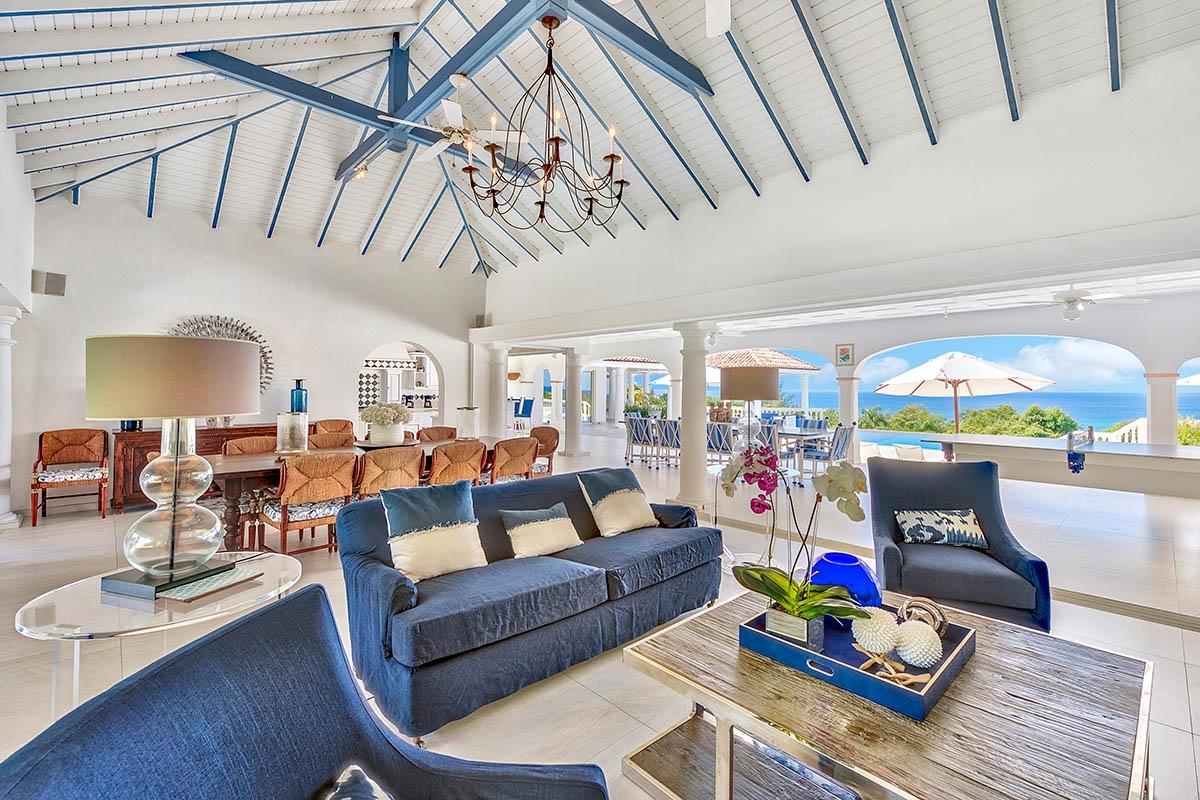 The interior great room is very spacious and casually elegant, perfect for gathering. Sliding glass pocket doors open the room to the view and breezes. New contemporary furniture in the living room include the colours of the sea & sky and complement the rest of the interiors. The soaring ceilings are popped with blue trim, a design theme repeated throughout the villa. The pretty French Country kitchen in blue and white Provence tiles features a stunning French stove and beautiful views. A barbeque sits just off the kitchen.