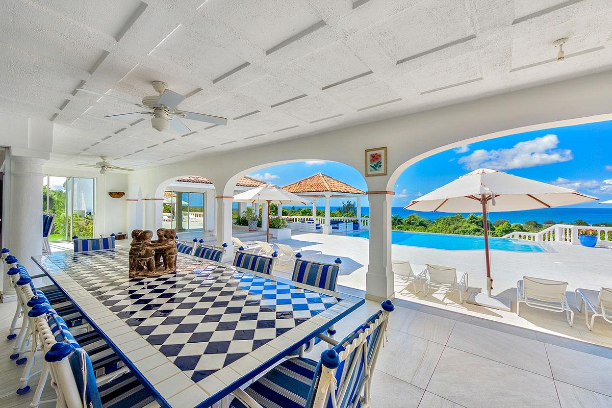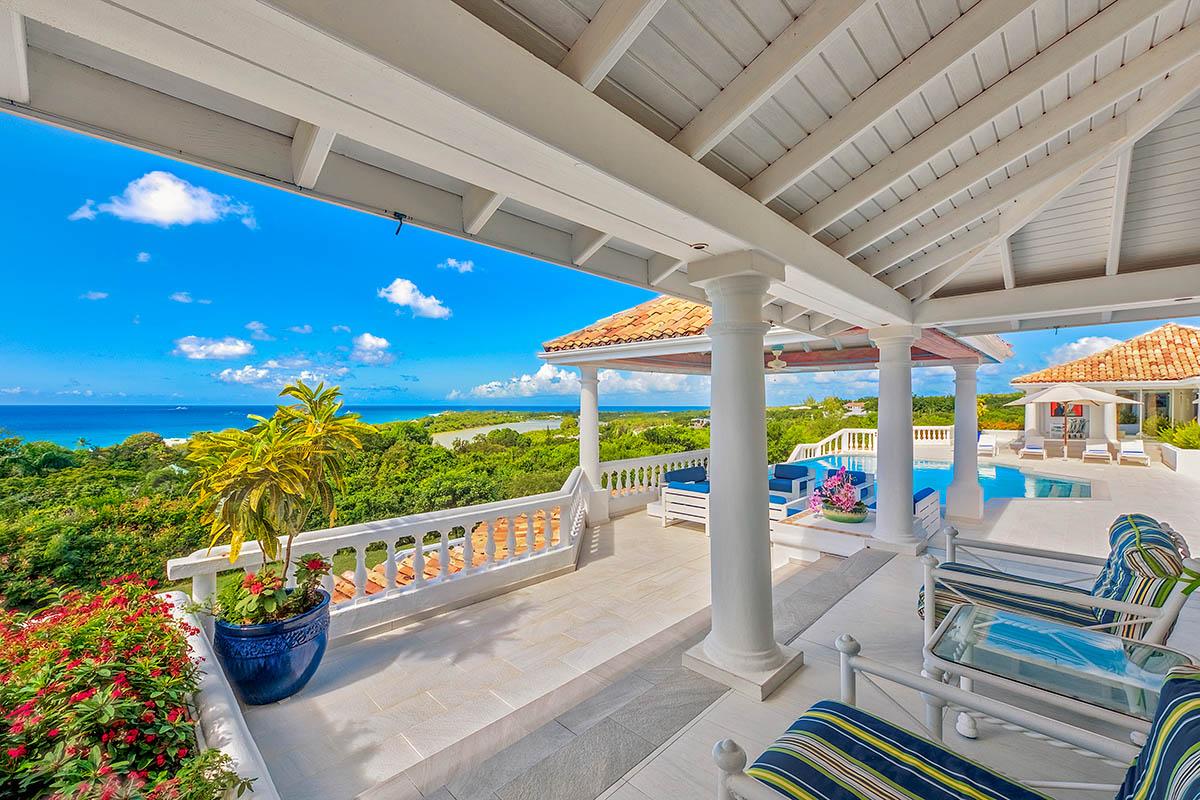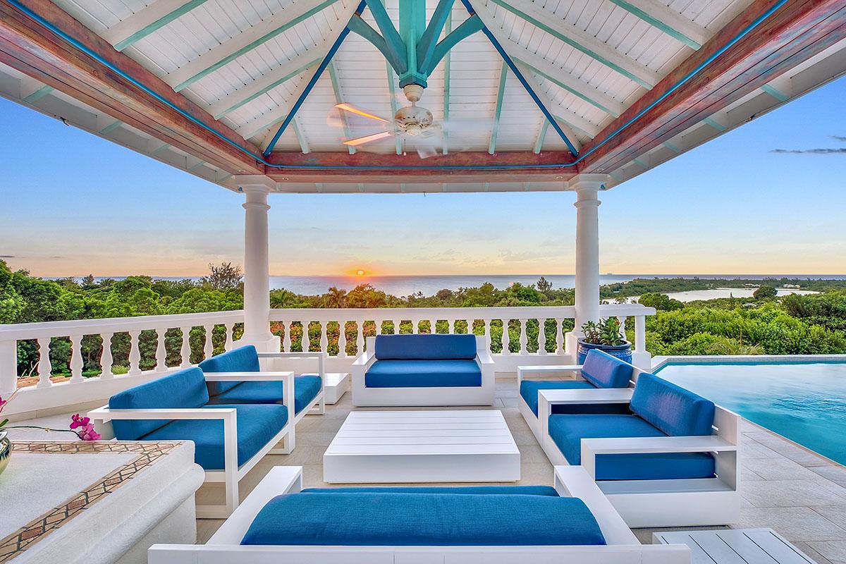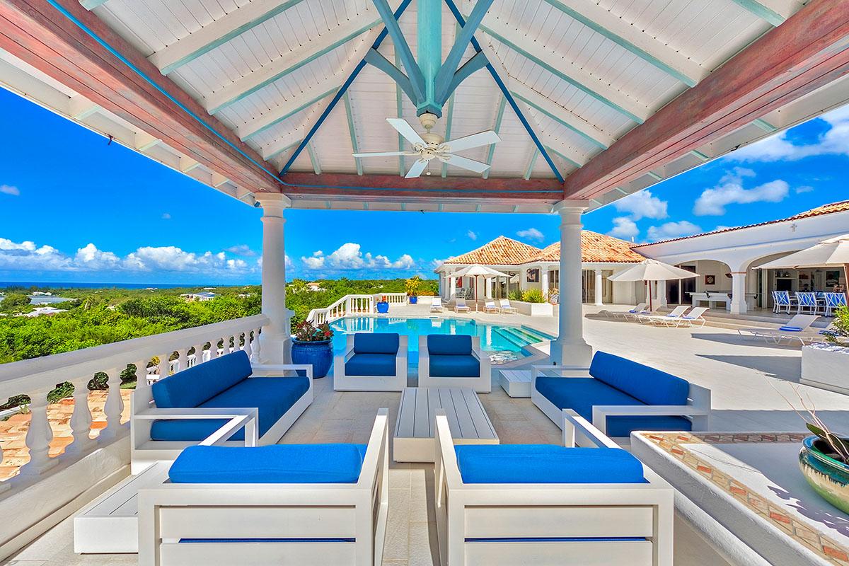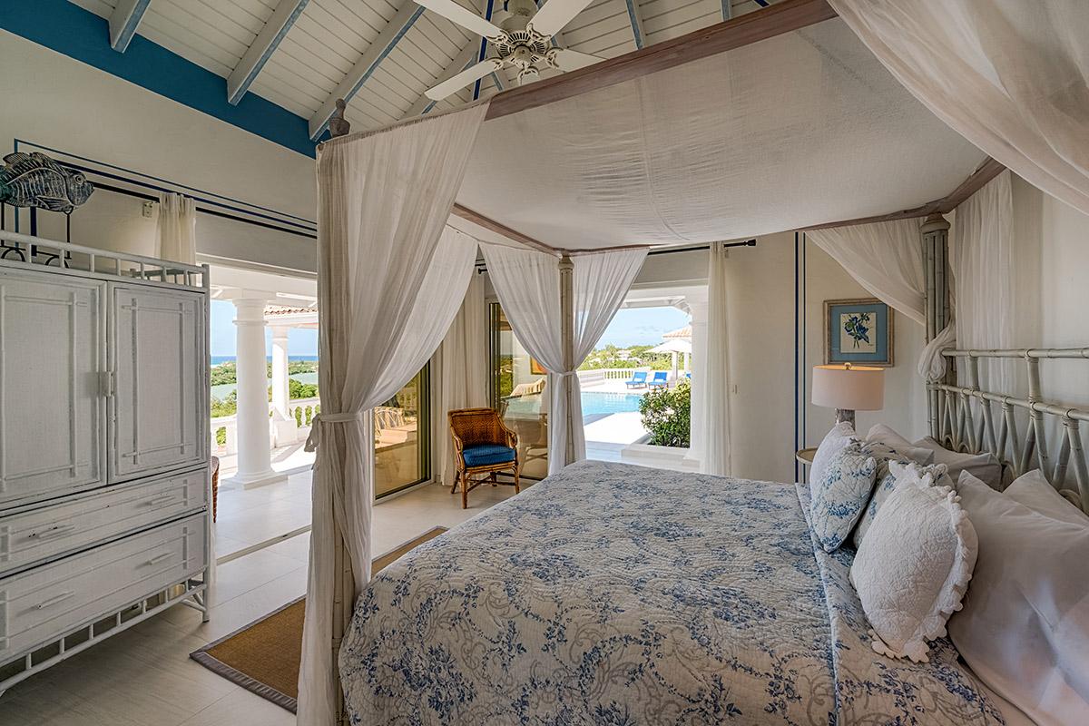 The interior great room is very spacious and casually elegant, perfect for gathering. Sliding glass pocket doors open the room to the view and breezes. New contemporary furniture in the living room include the colours of the sea & sky and complement the rest of the interiors. The soaring ceilings are popped with blue trim, a design theme repeated throughout the villa. The pretty French Country kitchen in blue and white Provence tiles features a stunning French stove and beautiful views. A barbeque sits just off the kitchen.