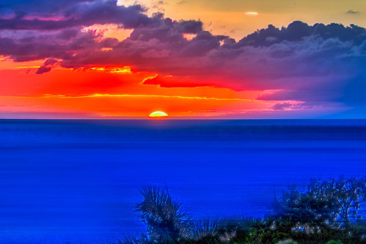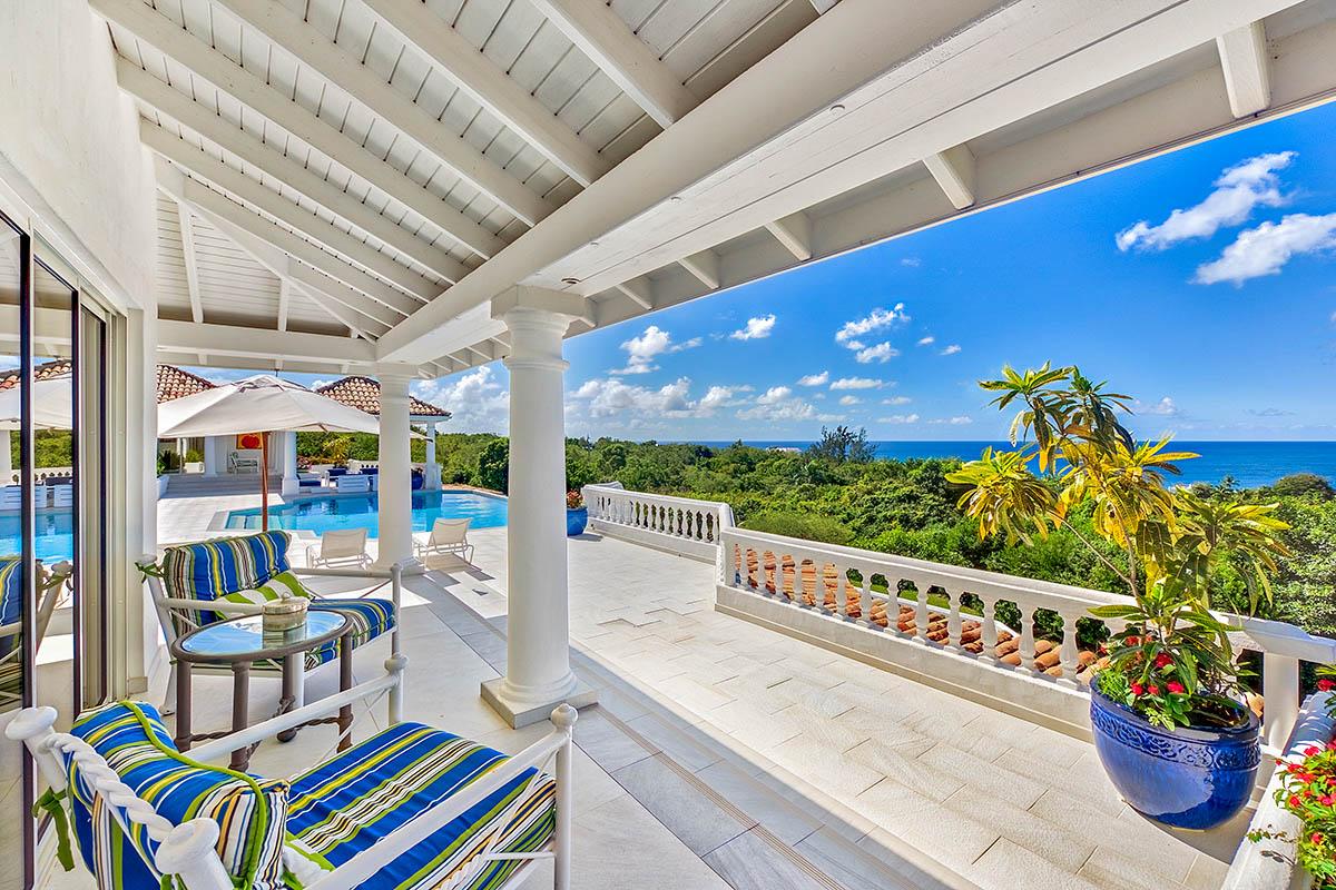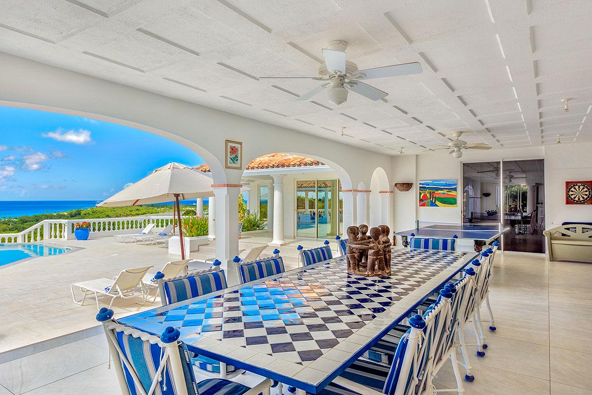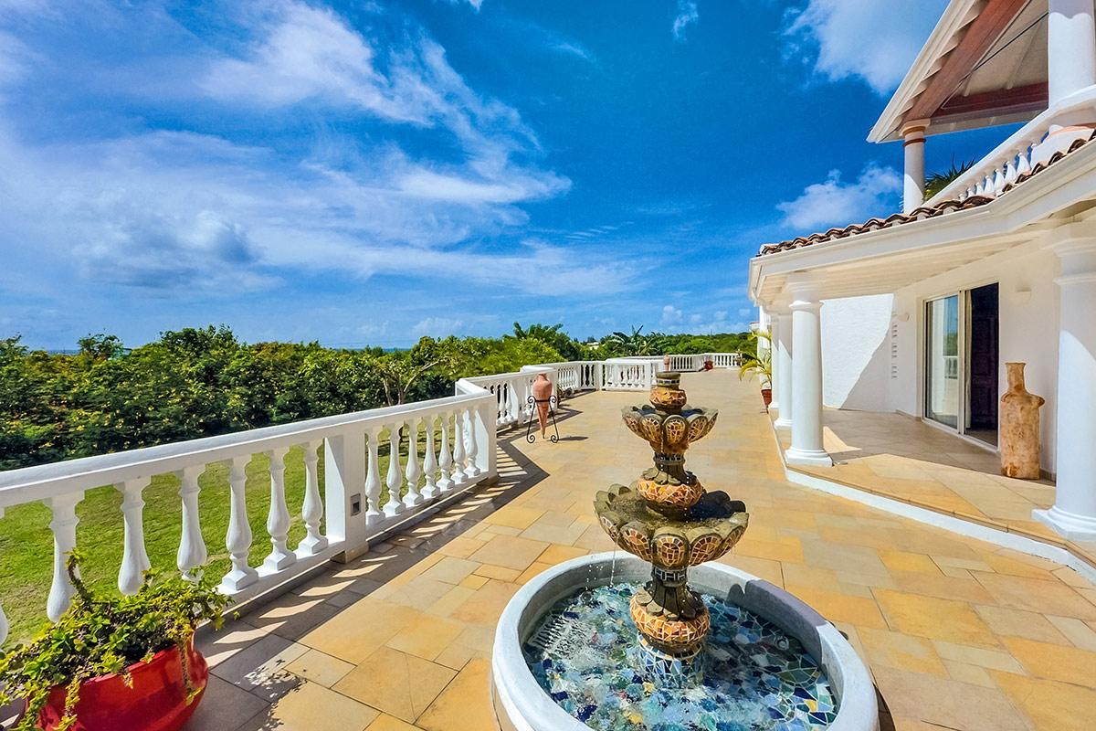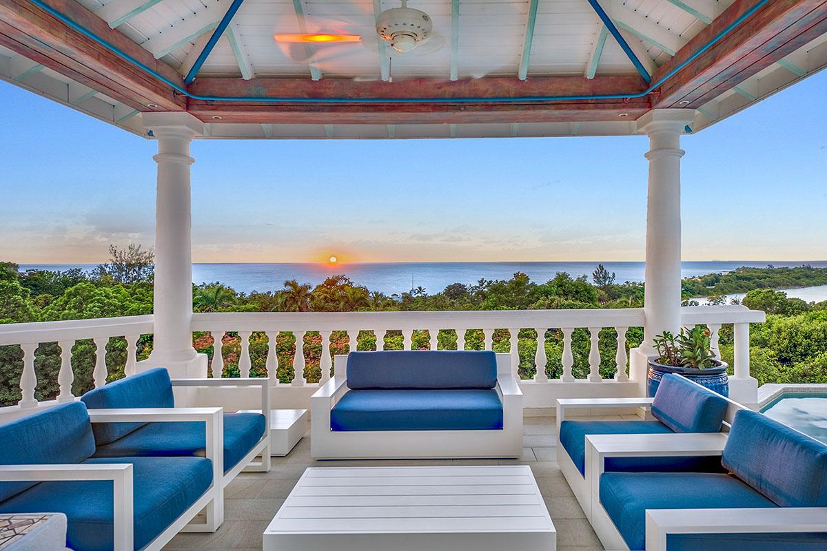 The interior great room is very spacious and casually elegant, perfect for gathering. Sliding glass pocket doors open the room to the view and breezes. New contemporary furniture in the living room include the colours of the sea & sky and complement the rest of the interiors. The soaring ceilings are popped with blue trim, a design theme repeated throughout the villa. The pretty French Country kitchen in blue and white Provence tiles features a stunning French stove and beautiful views. A barbeque sits just off the kitchen.