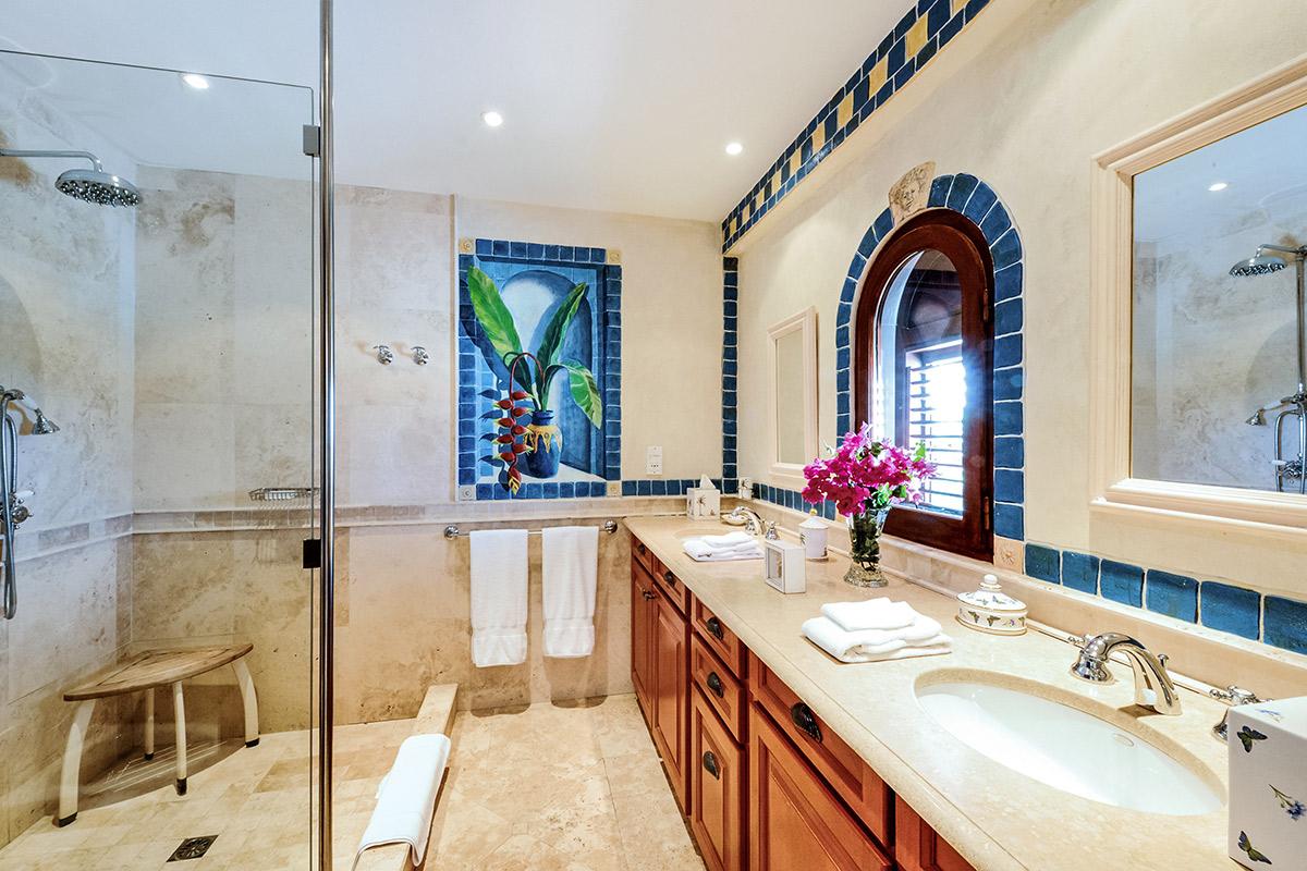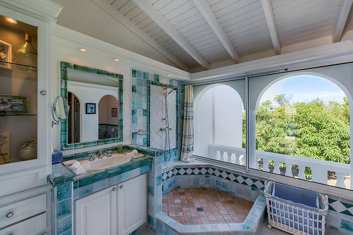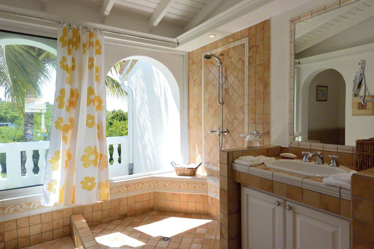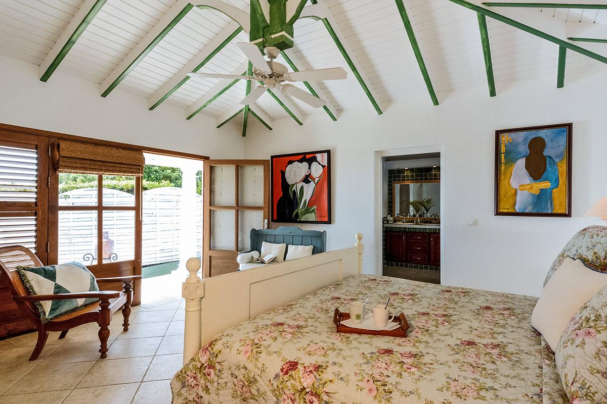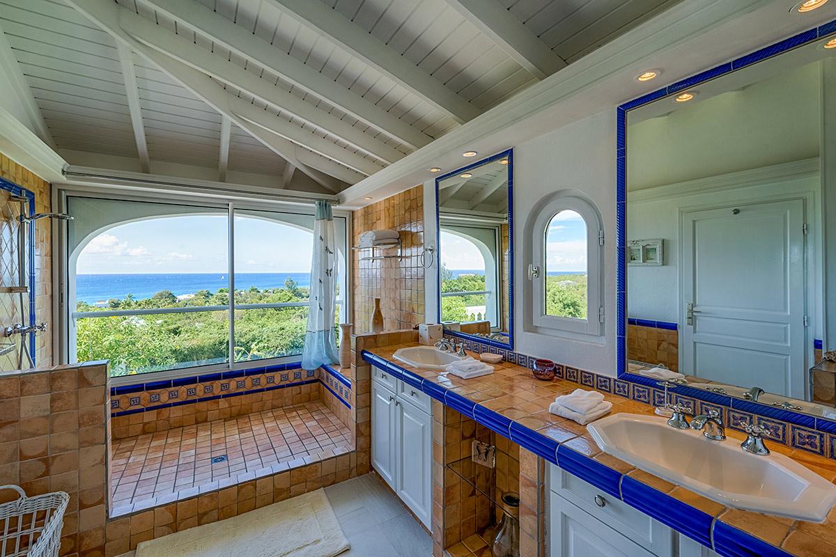 Two bedrooms are in a private, self-contained cottage with its own pool. Seven bedrooms are in the main house. Each has private outdoor seating with either garden or ocean views. The overall mood in each room mixes Provence colors and fabrics in white with blue, yellow or red. Most rooms feature romantic four poster beds. Each en-suite bathroom is tiled in the iconic Provence tiles found in many Terres Basses villas. Several have ocean or garden views from the walk-in showers. A very large suite on the lower level is a quite oasis with its own large terrace and seating both inside and outside. The villa also has a fitness room.