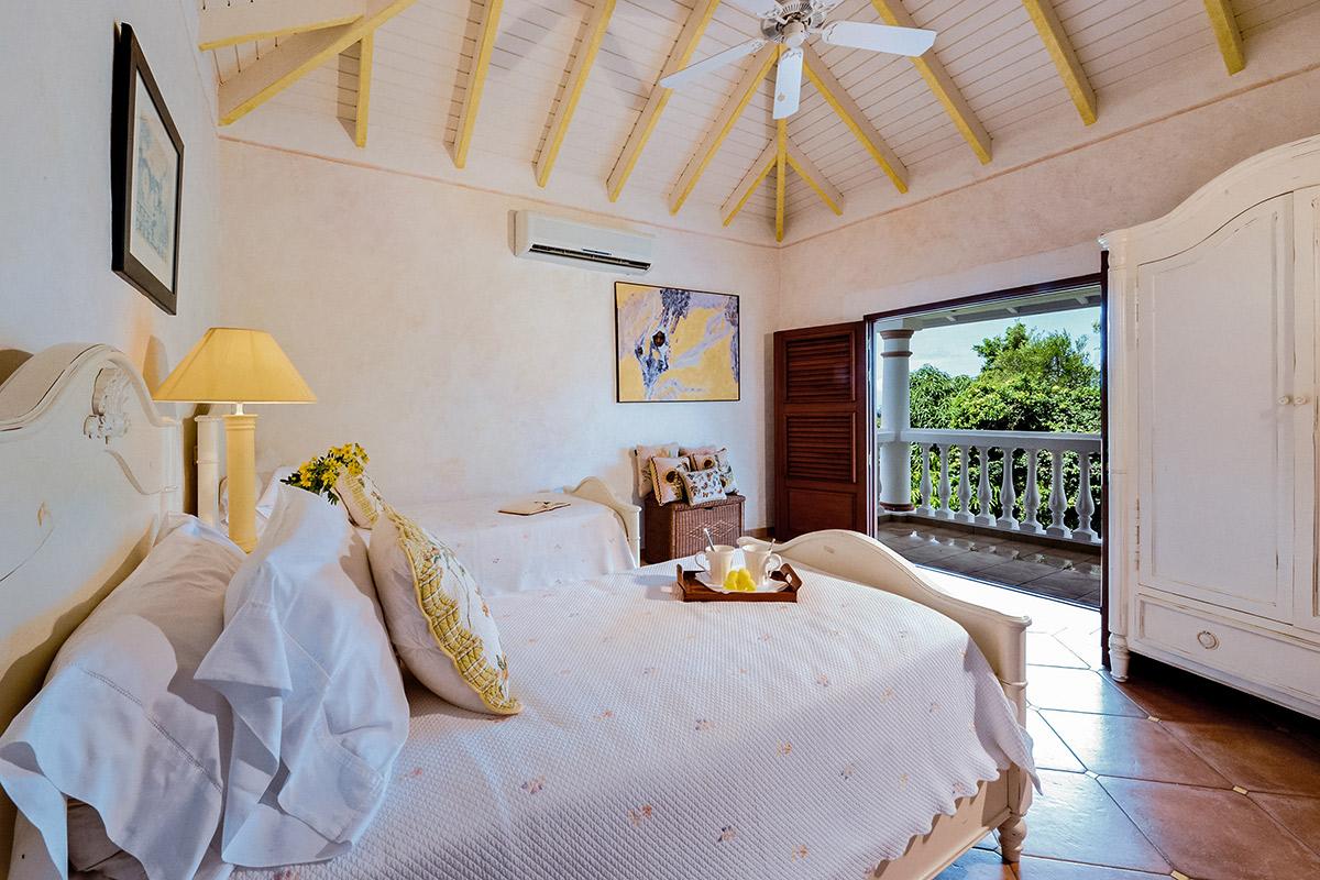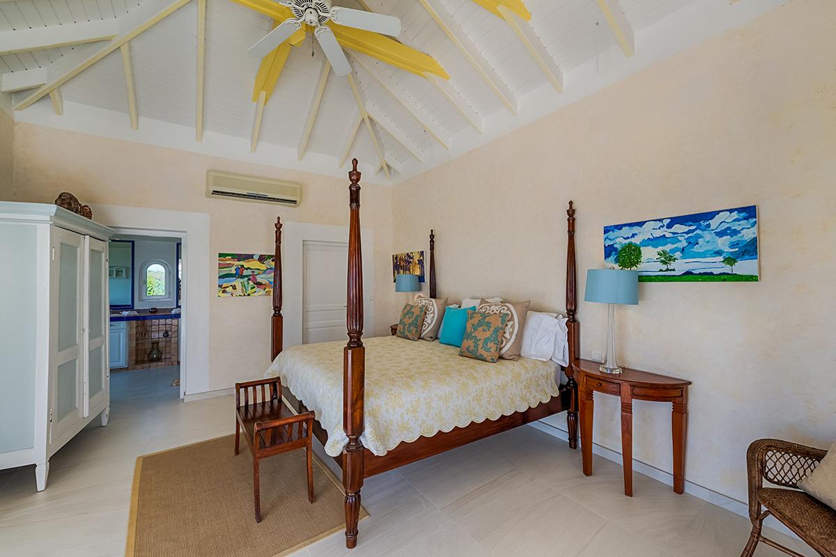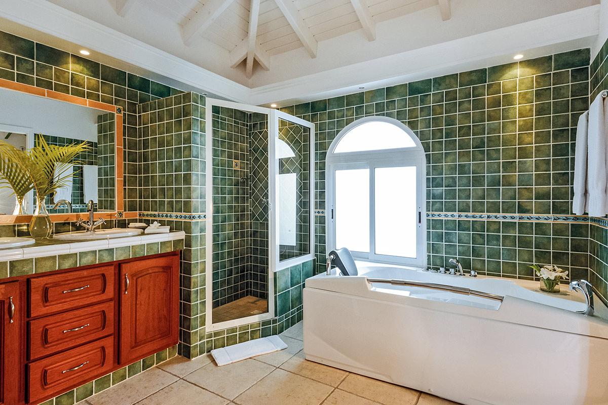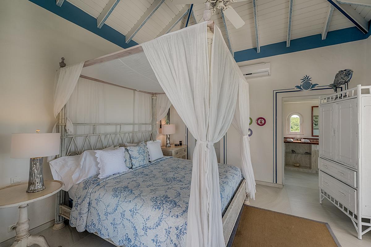 Two bedrooms are in a private, self-contained cottage with its own pool. Seven bedrooms are in the main house. Each has private outdoor seating with either garden or ocean views. The overall mood in each room mixes Provence colors and fabrics in white with blue, yellow or red. Most rooms feature romantic four poster beds. Each en-suite bathroom is tiled in the iconic Provence tiles found in many Terres Basses villas. Several have ocean or garden views from the walk-in showers. A very large suite on the lower level is a quite oasis with its own large terrace and seating both inside and outside. The villa also has a fitness room.