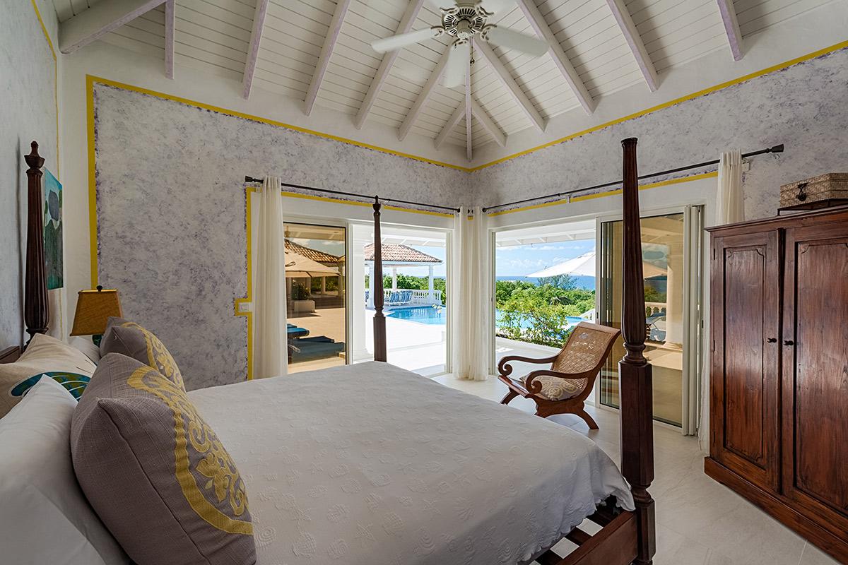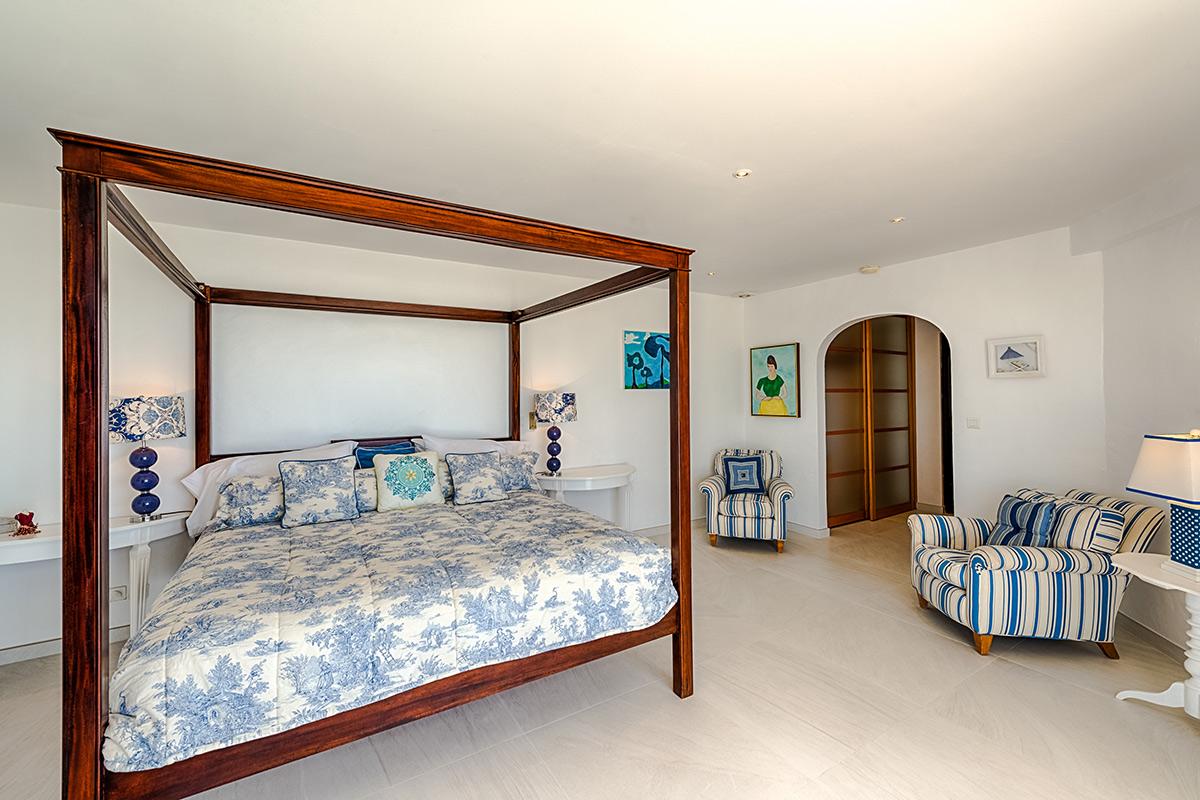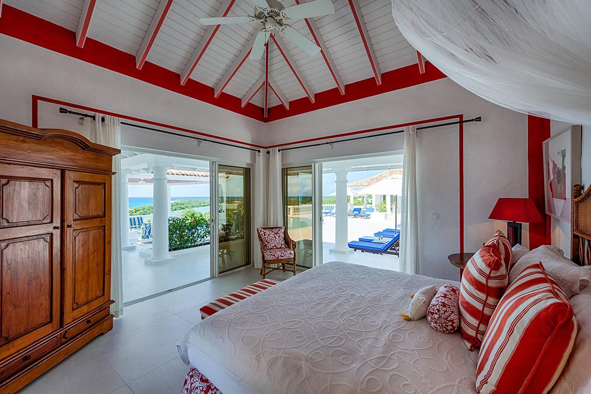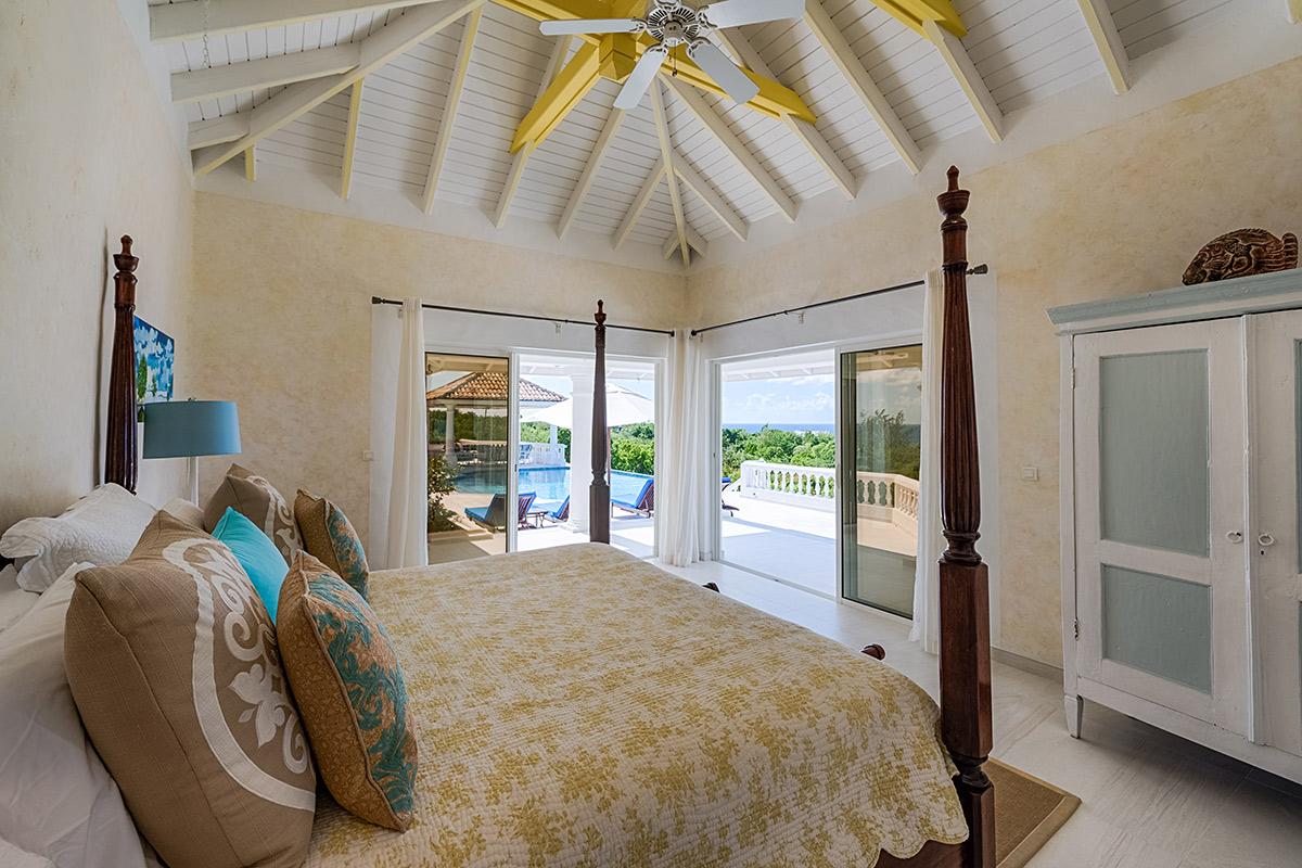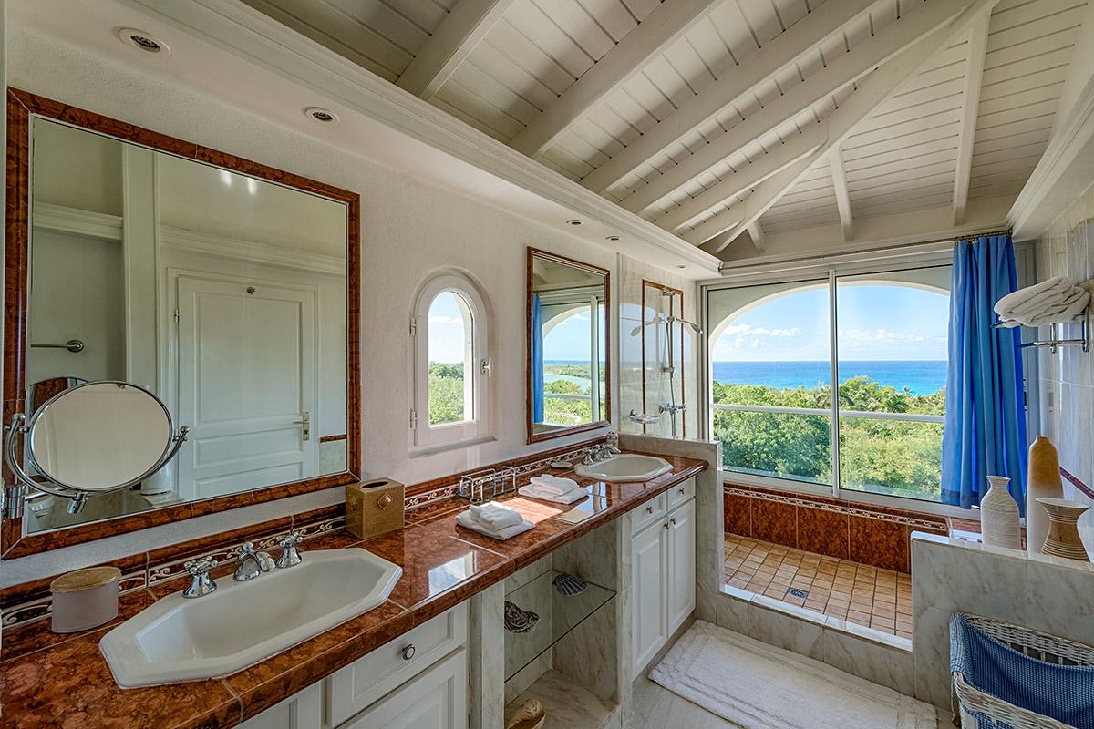 Two bedrooms are in a private, self-contained cottage with its own pool. Seven bedrooms are in the main house. Each has private outdoor seating with either garden or ocean views. The overall mood in each room mixes Provence colors and fabrics in white with blue, yellow or red. Most rooms feature romantic four poster beds. Each en-suite bathroom is tiled in the iconic Provence tiles found in many Terres Basses villas. Several have ocean or garden views from the walk-in showers. A very large suite on the lower level is a quite oasis with its own large terrace and seating both inside and outside. The villa also has a fitness room.