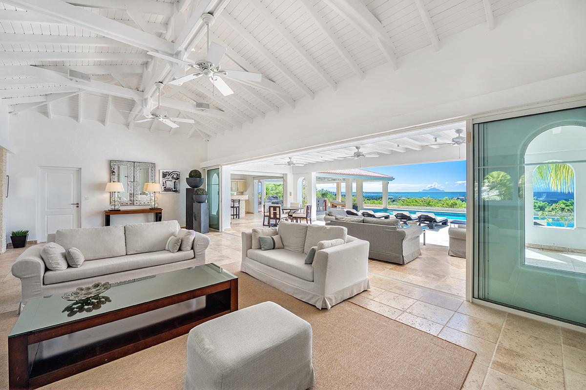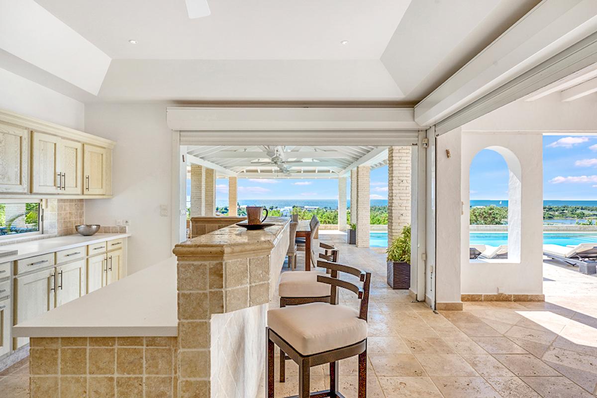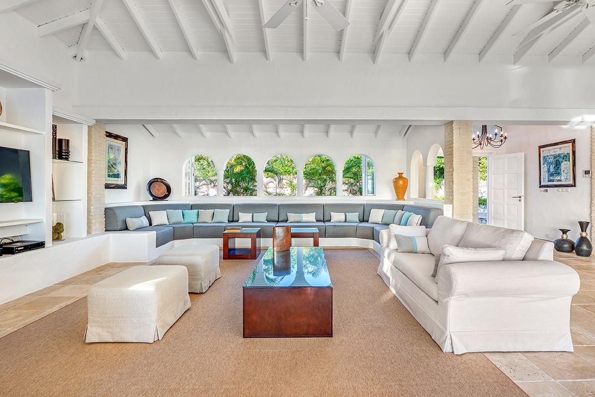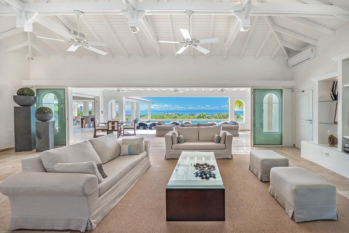 The villa’s style is French Caribbean meets Moroccan. The fully air conditioned open plan great room is airy and white with vaulted ceilings. The interior’s multiple seating areas optimize the view. Stylish, comfortable furniture in pure white complements the exotic banquette backed by Moroccan arches. Dark woods and interesting object d’art add visual appeal. The elegant kitchen with high-end appliances opens to the view and the outdoor dining areas.