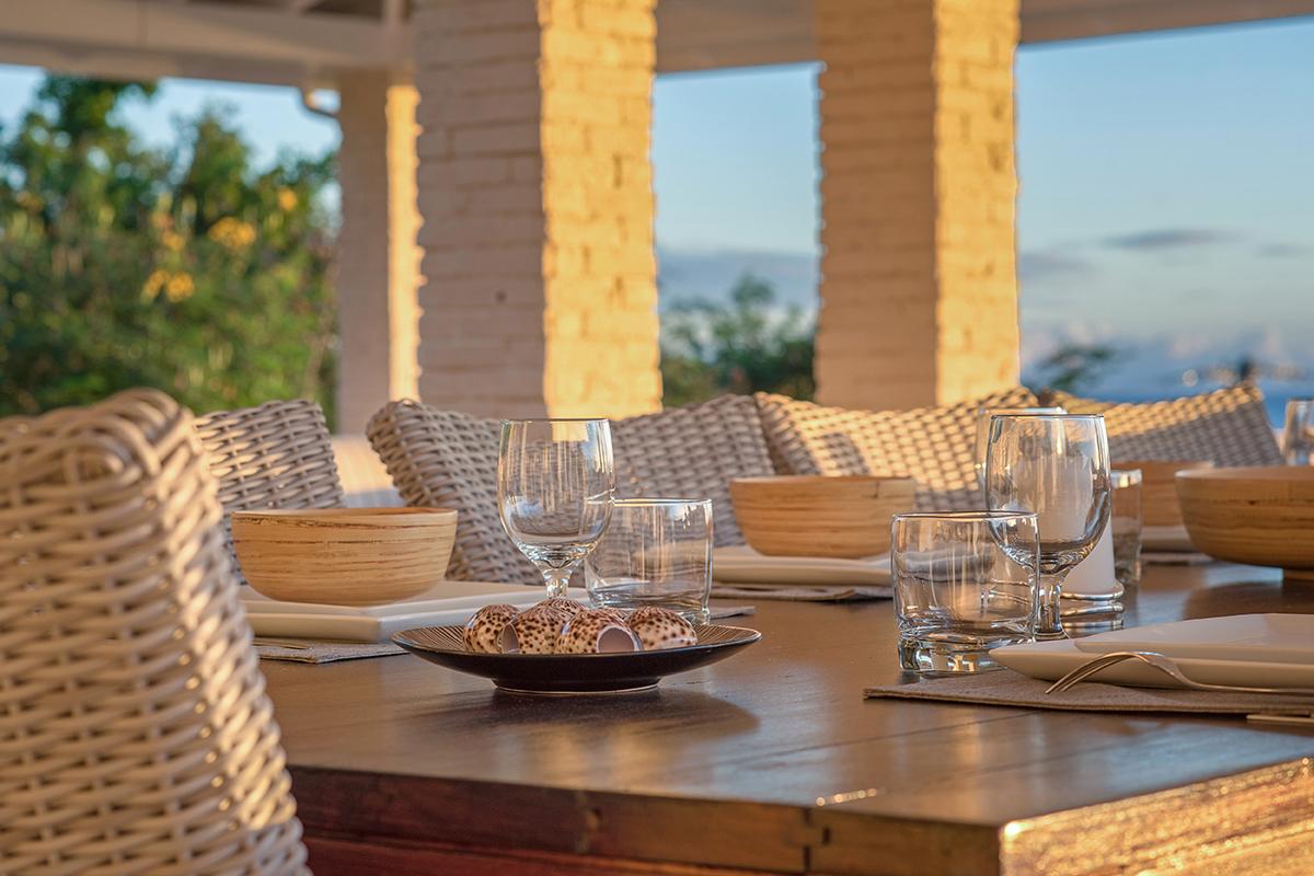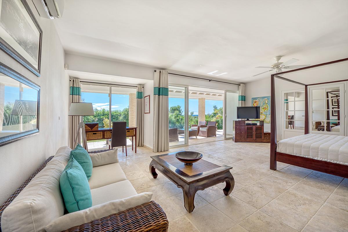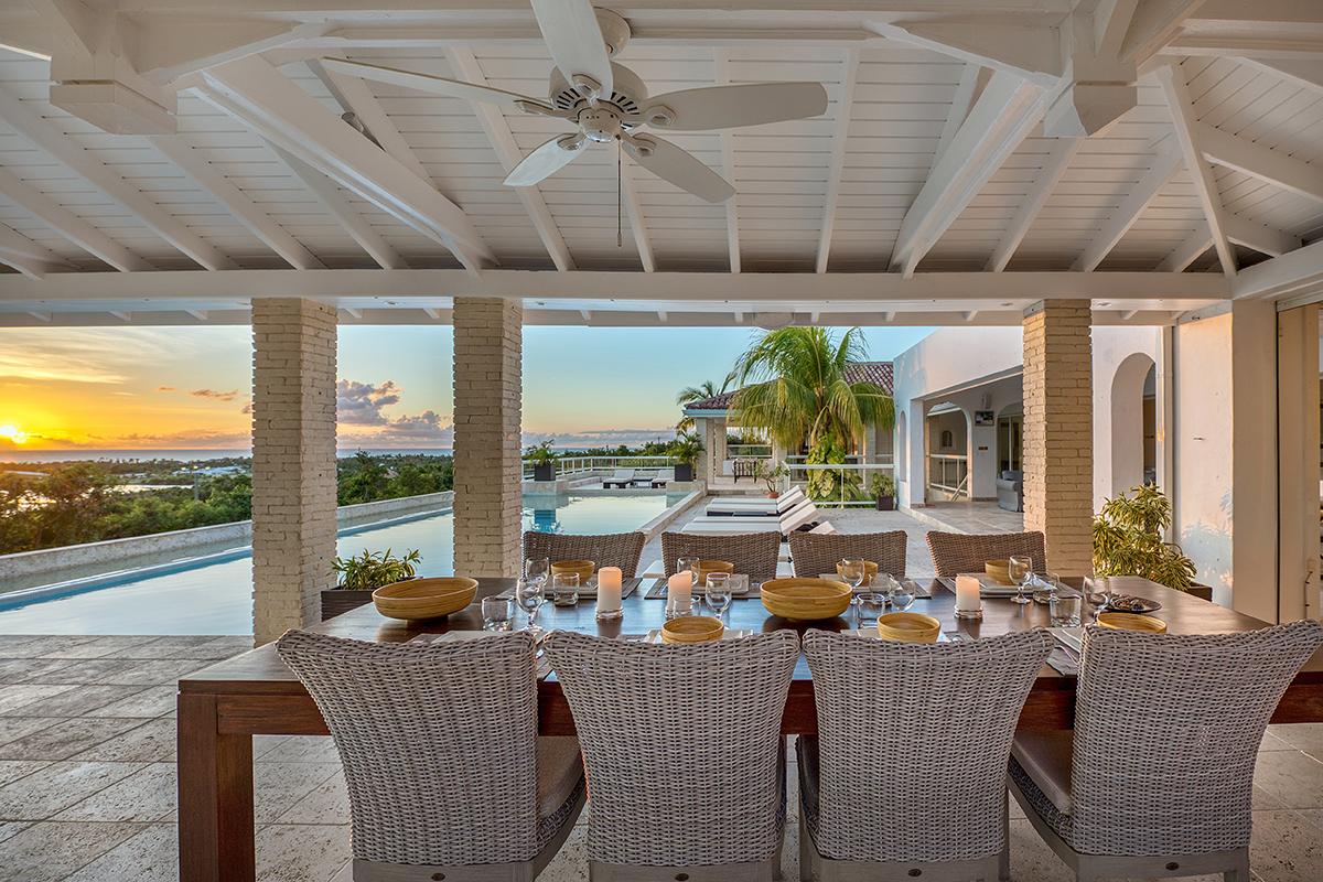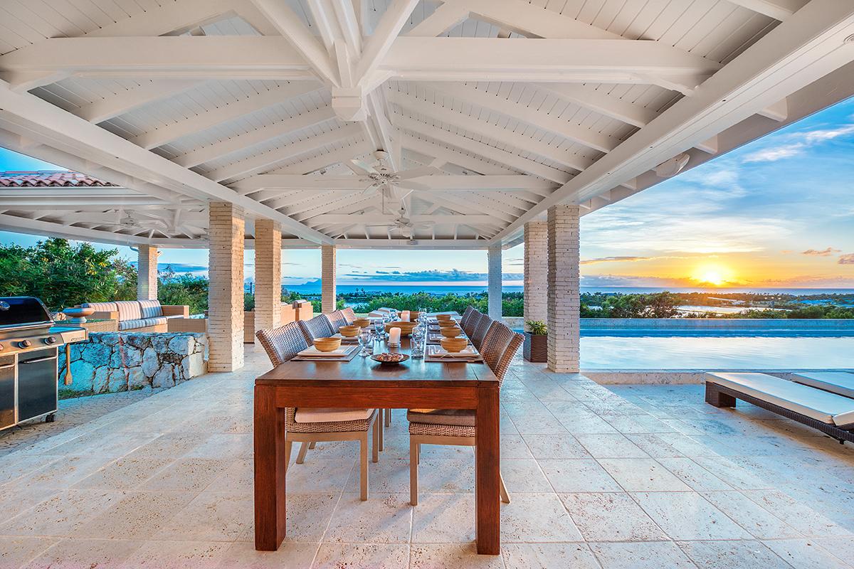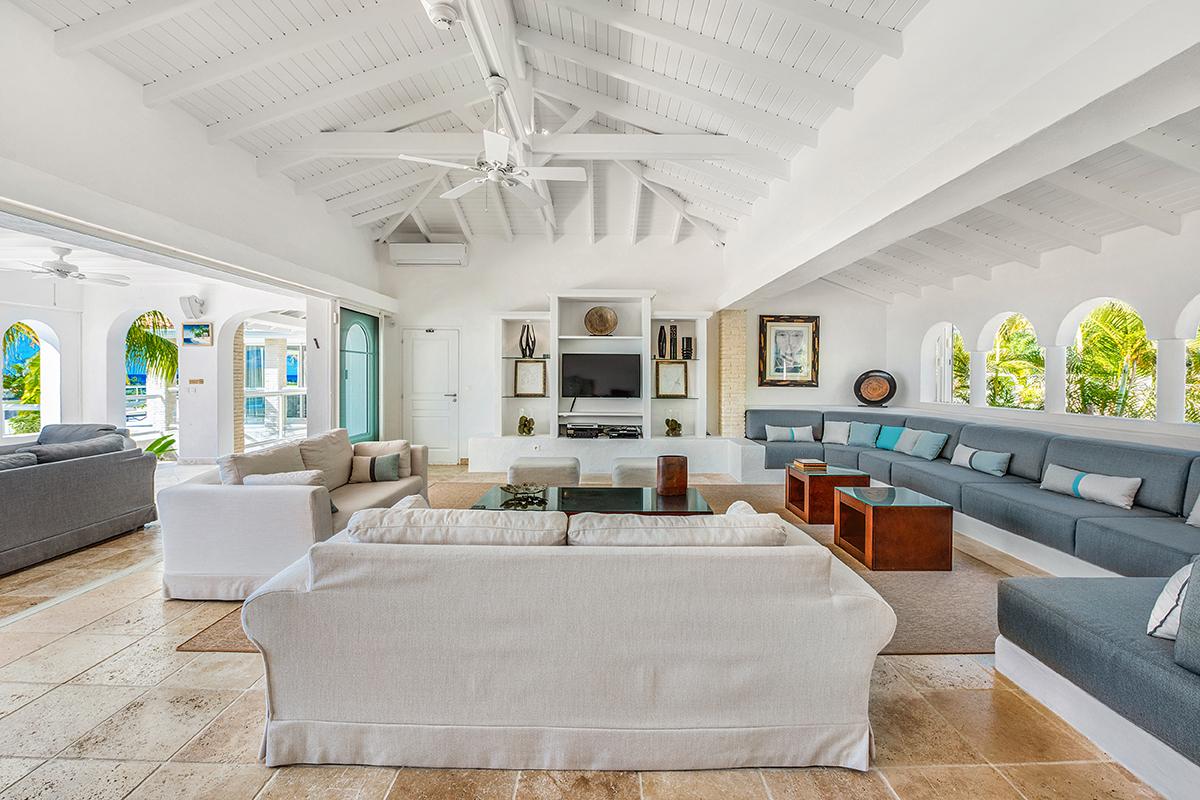 The villa’s style is French Caribbean meets Moroccan. The fully air conditioned open plan great room is airy and white with vaulted ceilings. The interior’s multiple seating areas optimize the view. Stylish, comfortable furniture in pure white complements the exotic banquette backed by Moroccan arches. Dark woods and interesting object d’art add visual appeal. The elegant kitchen with high-end appliances opens to the view and the outdoor dining areas.