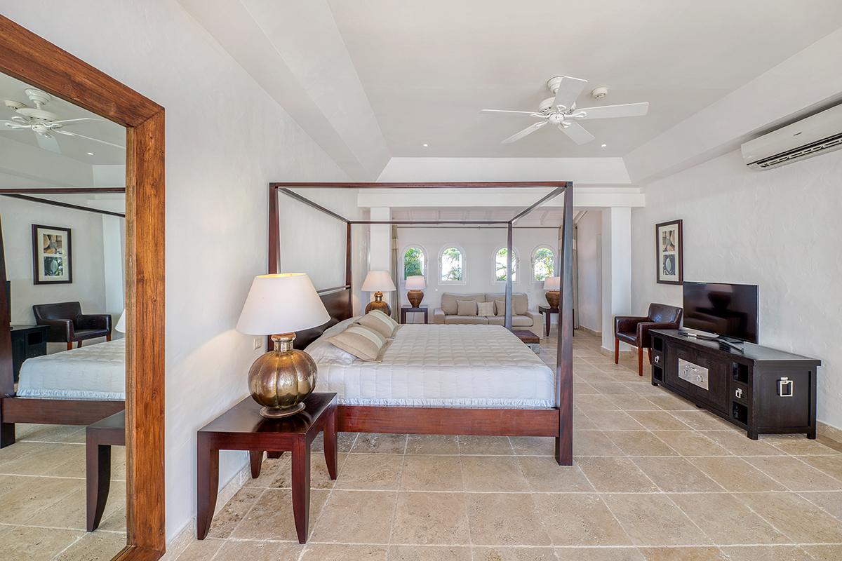 Bedroom 1: This room is equipped with a king-sized bed, an ocean view, a fan, air conditioning, a TV, a safe, and an ensuite bathroom.