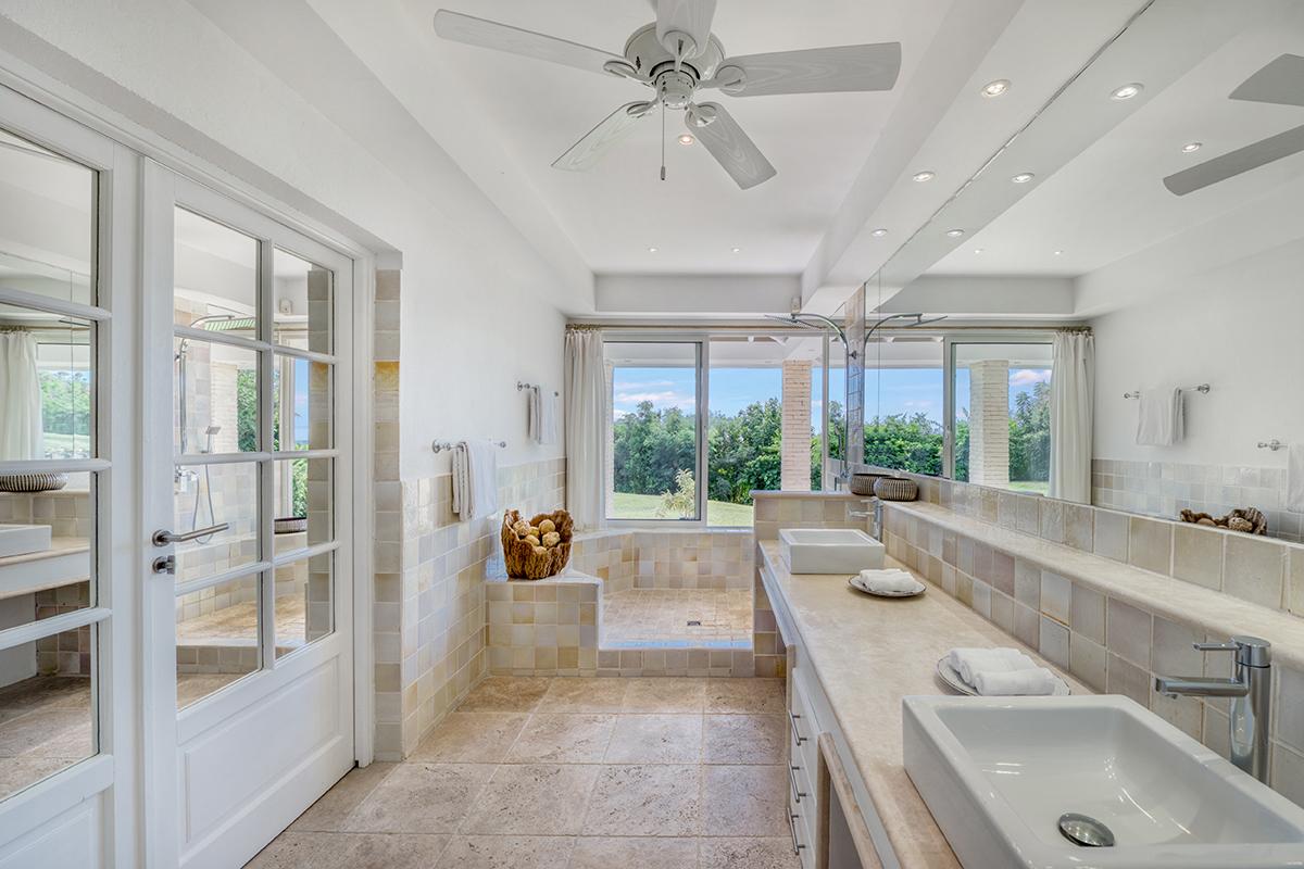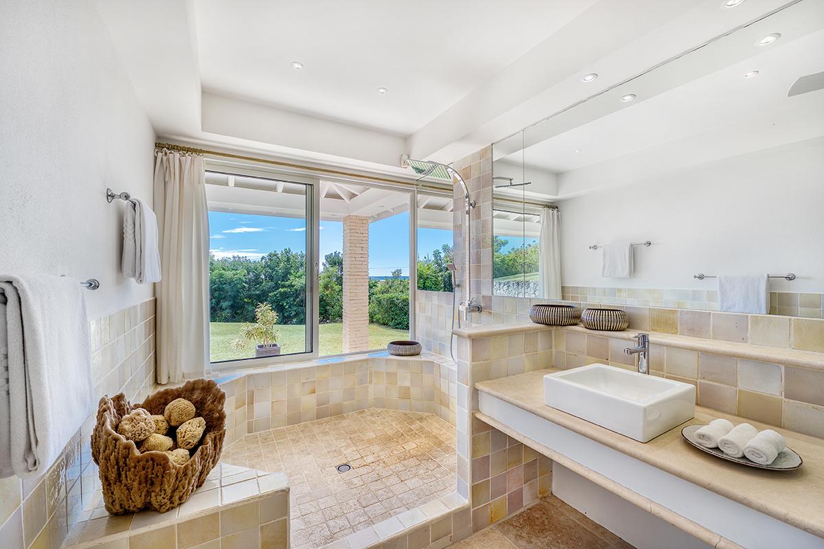 Two bedrooms are on the upper level; one on the lower level. All have ocean views. Each has a relaxed contemporary feel in serene white and dark woods accented with pops of colors. The upper level bedrooms are large and spacious with private seating inside and outside. The lower level bedroom is a large suite with private covered terrace and comfortable indoor lounging. Each bedroom has beautiful spa style bathrooms with tumble marble tiles and large walk in showers; two have outdoor showers; one opens to the garden.