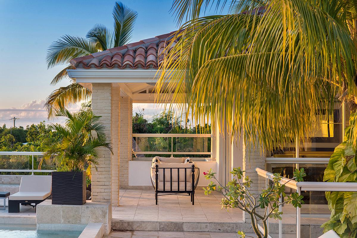 The outside spaces are beautifully detailed. A covered terrasse surrounds the pool while palm filled planters; terrace plantings and a huge palm soar through the sun deck. At one end of the pool is a fabulous outdoor great room divided into areas for lounging and elegant al-fresco dining. The large sloping entry pool runs almost the entire length of the terrace. At the opposite side of the terrace is a plunge pool perfect for children or simply relaxing.