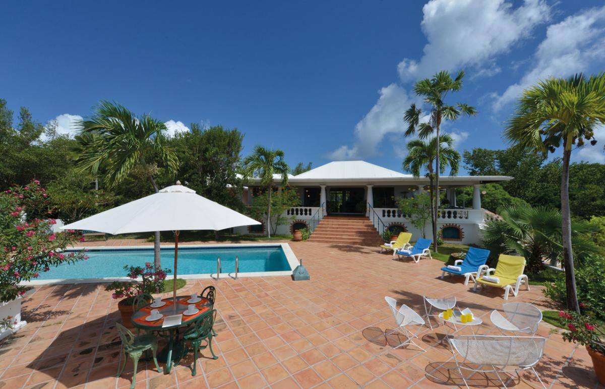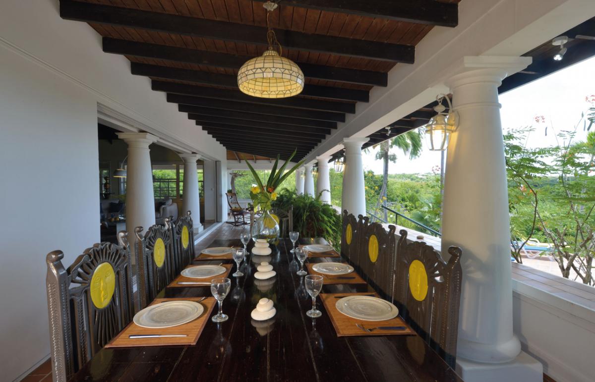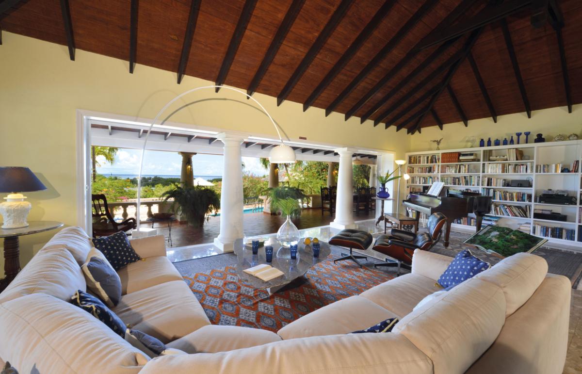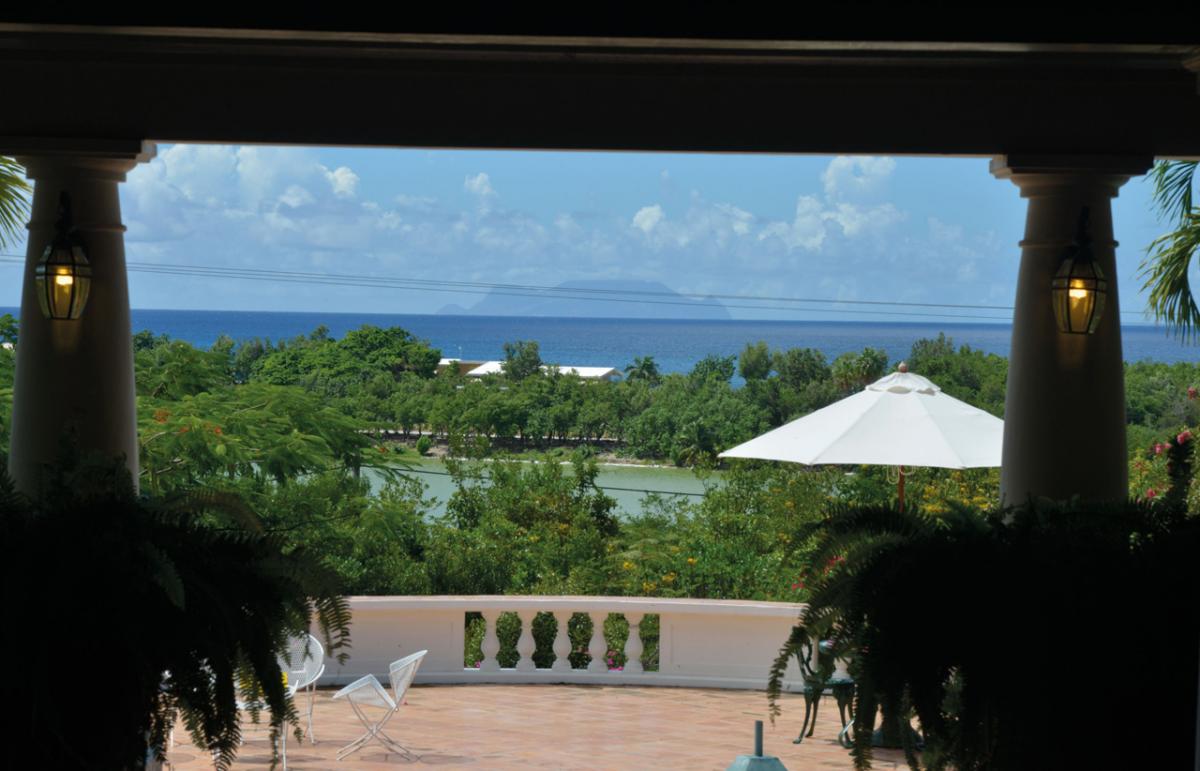 Villa Les Zephyrs is an elegant colonial West Indian style home built in a U-shape around a flowered interior courtyard and overlooks the Caribbean Sea with views of the islands of Saba and St. Eustatius and in the foreground, La Samanna Hotel and the Baie Longue Beach area.