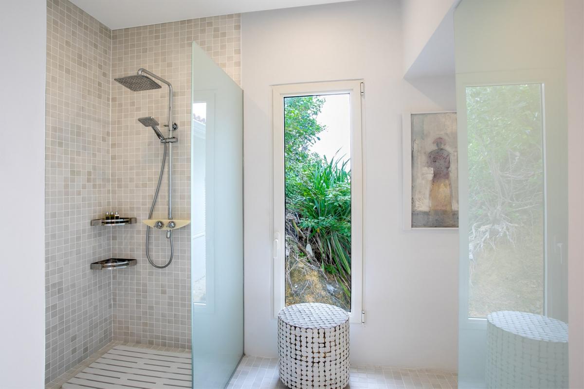 A stone staircase leads down to the main terrace level with a beautiful asymmetrical pool and sun deck projecting off the cliff. There is plenty of space for sun lounging and comfortable shaded areas for the hot afternoons.