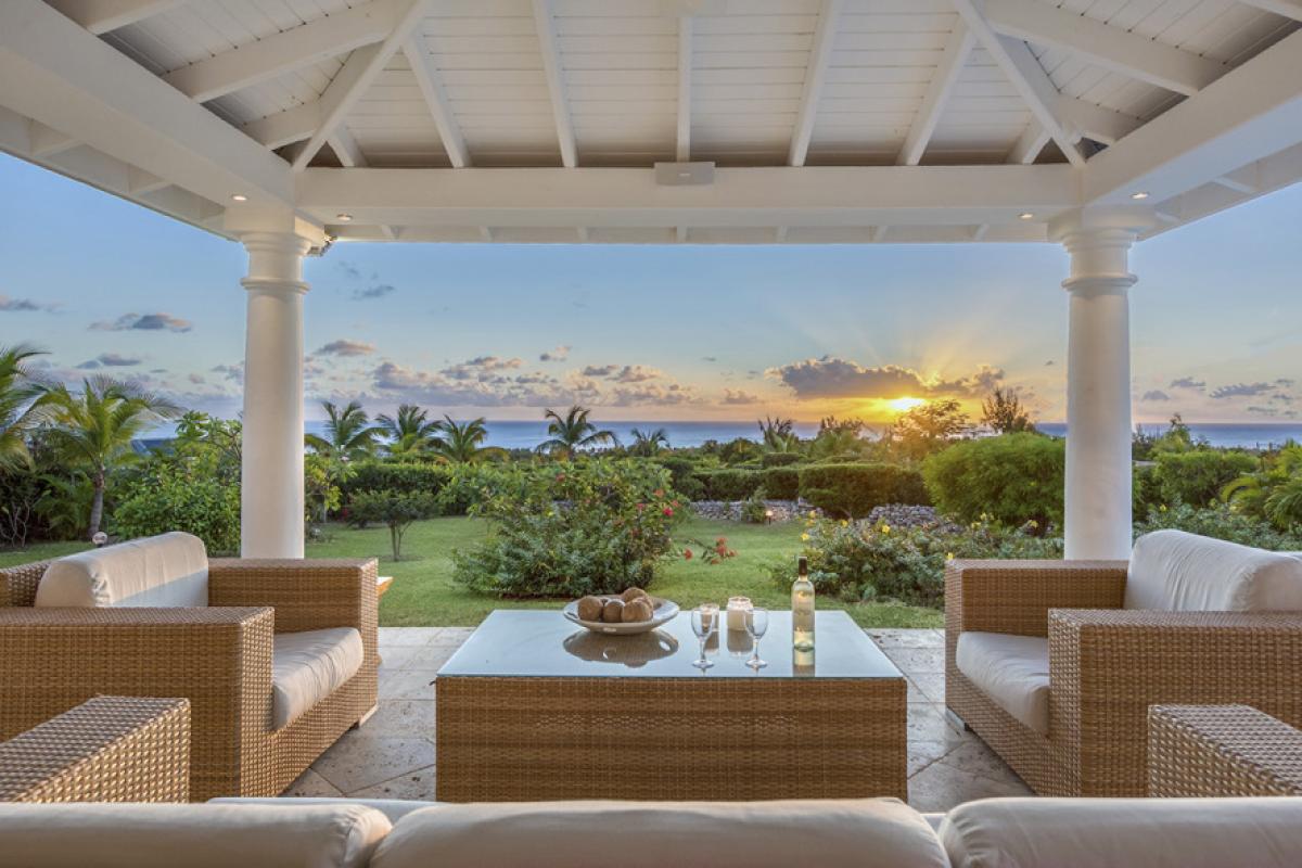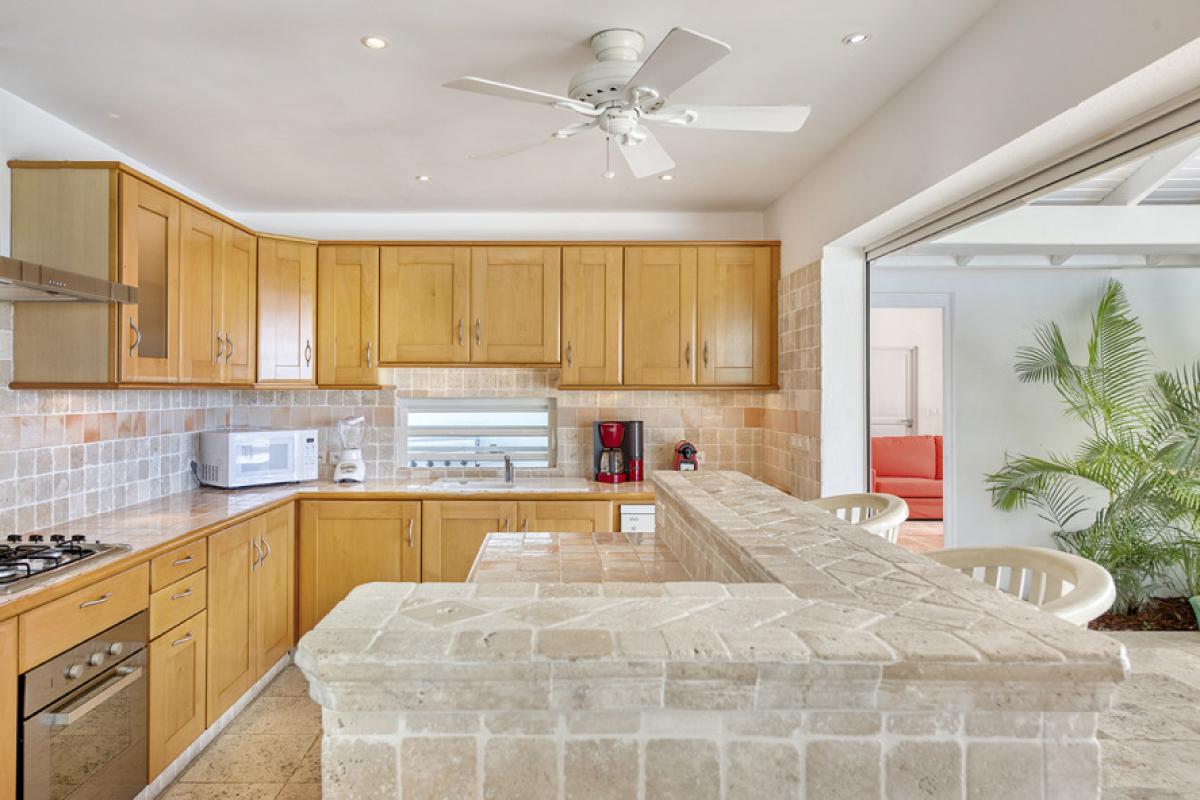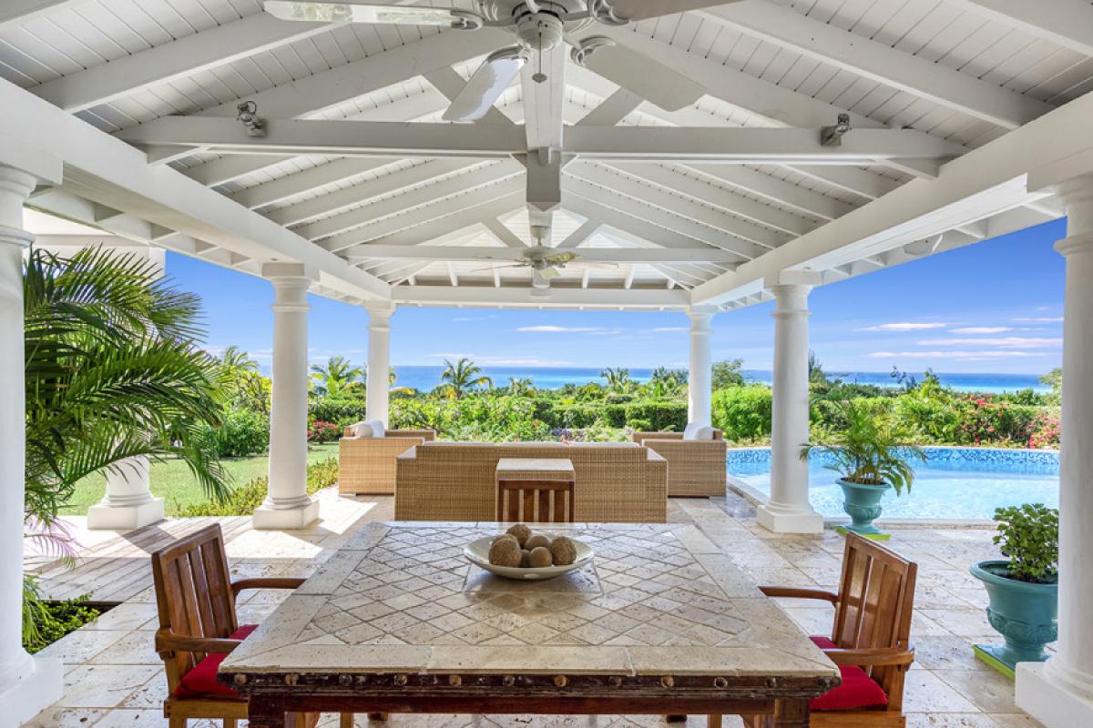 The charming well-equipped kitchen in soft stone tiles, painted teak and soft corals opens to the living space and the outdoors. Eat at the kitchen counter or on the outdoor covered loggia off the pool. Spacious outdoor terraces feature a lounging area with oversized weather resistant wicker sofas and comfortable al fresco dining areas. Contemporary chaises, surrounding the stunning tiled pool, face the sea and gardens.