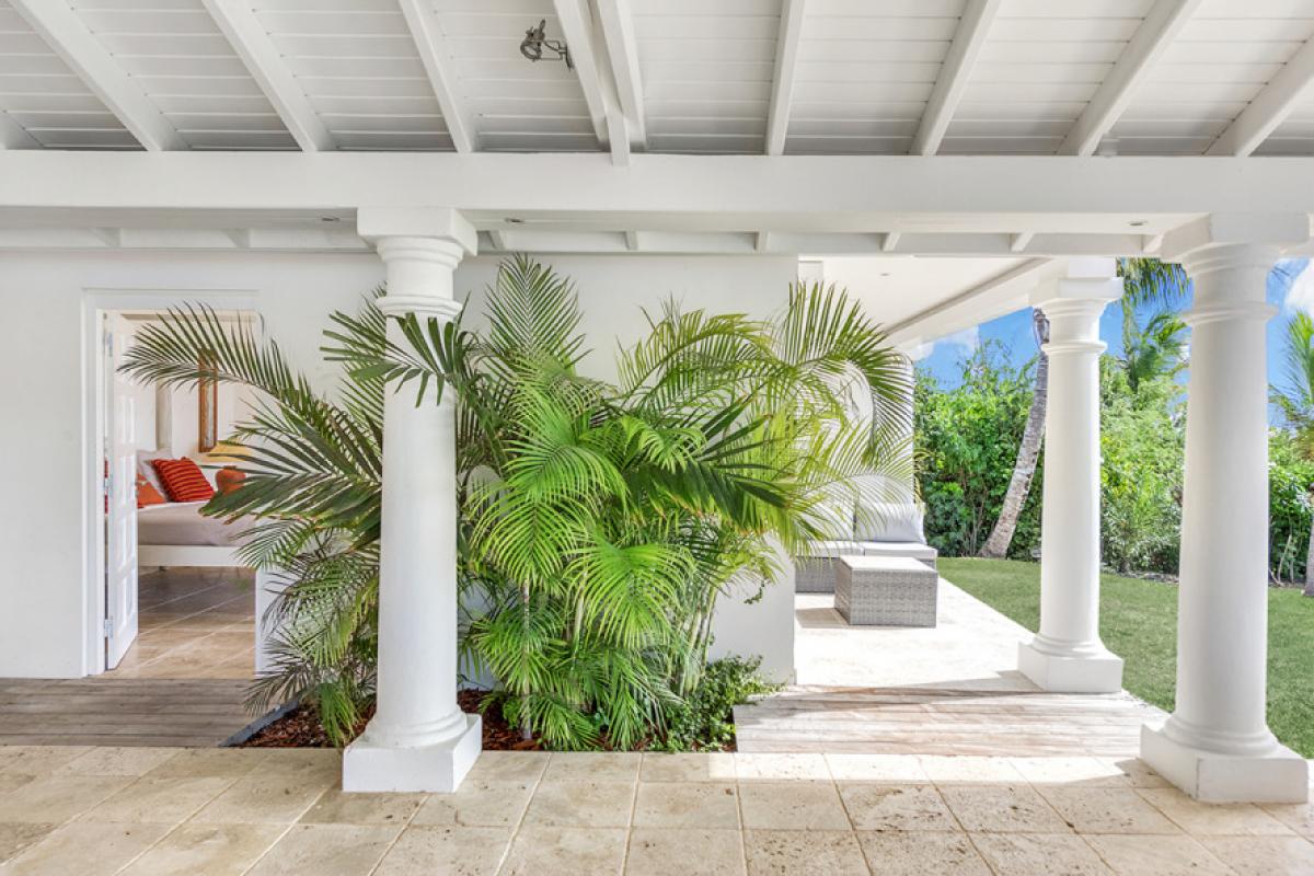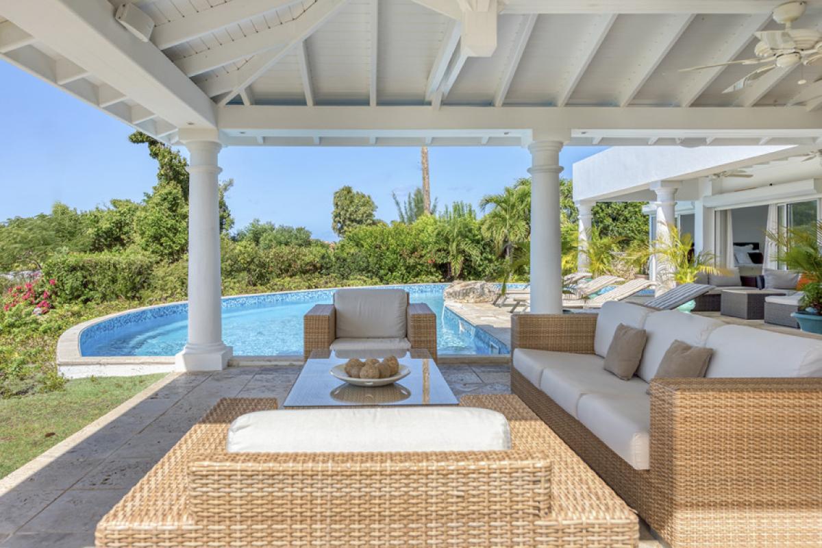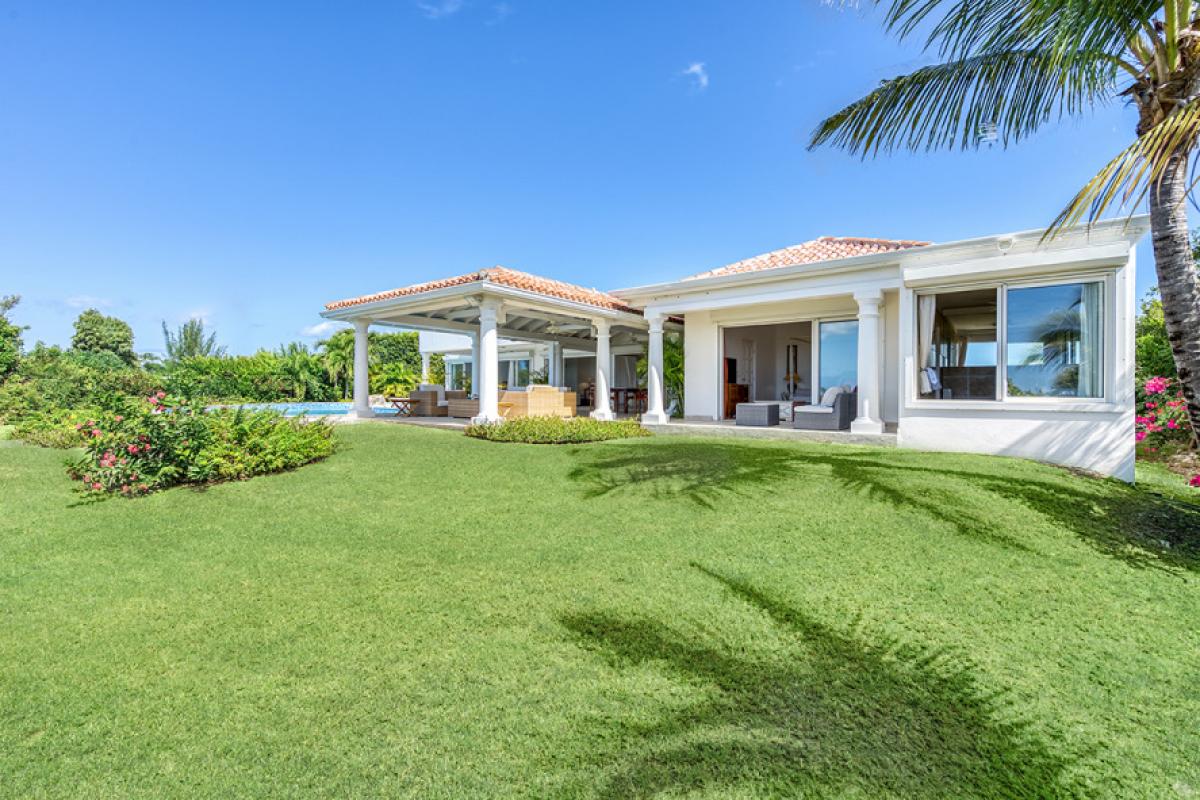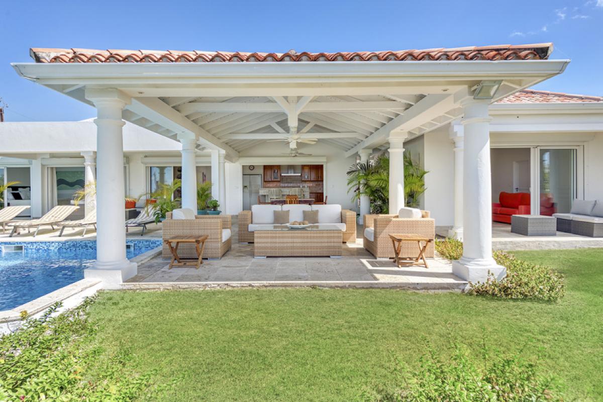 The charming well-equipped kitchen in soft stone tiles, painted teak and soft corals opens to the living space and the outdoors. Eat at the kitchen counter or on the outdoor covered loggia off the pool. Spacious outdoor terraces feature a lounging area with oversized weather resistant wicker sofas and comfortable al fresco dining areas. Contemporary chaises, surrounding the stunning tiled pool, face the sea and gardens.