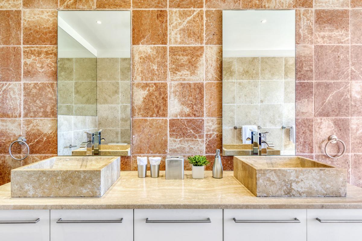 Two large bedrooms feel very private; one connected directly to the interior and one set off the terrace. Both have fabulous sea views and spa style travertine and teak bathrooms; one with private outdoor shower and one that opens to the sea view.