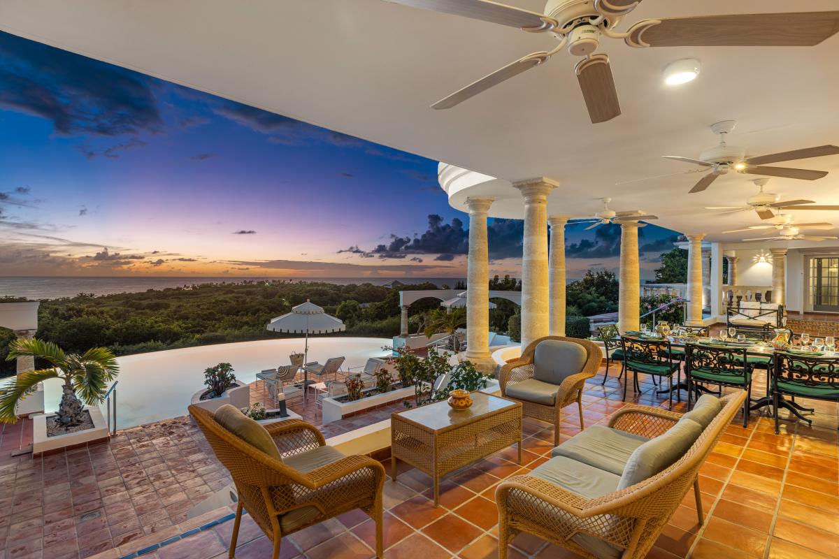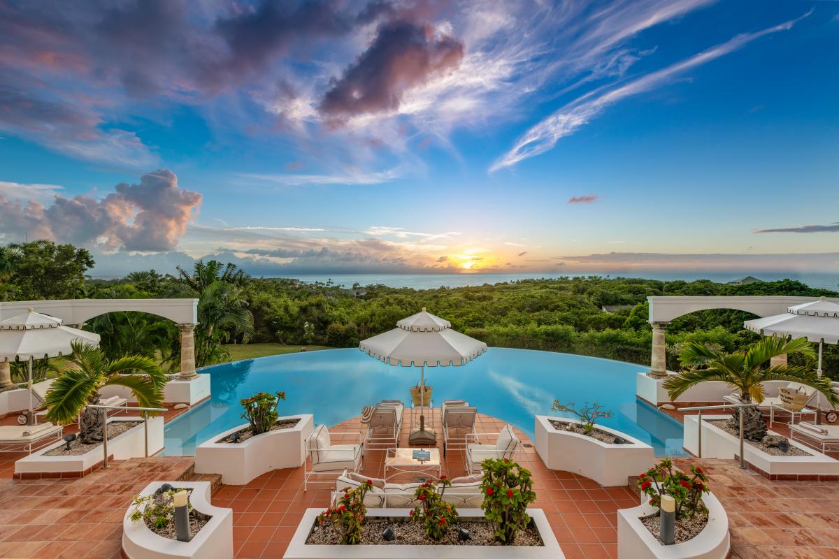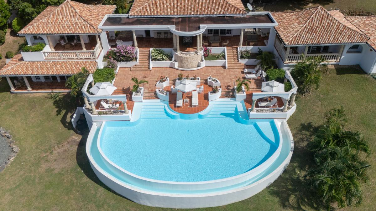 Mariposa is an elegant Caribbean style villa with a romantic tropical atmosphere. Terracotta floors edged with painted tiles flow throughout the interior and exterior. White walls, tiled roof, stone columns all add traditional architectural beauty. Lush pink bougainvillea and palm filled gardens, set in green lawns, draw the eye straight to breathtaking panoramic views of the brilliant blue sea and sky. All this being framed by arched walls surrounding the turquoise pool.