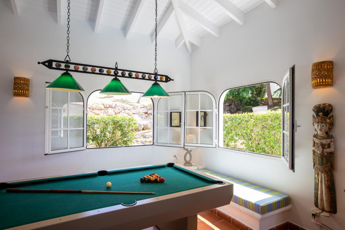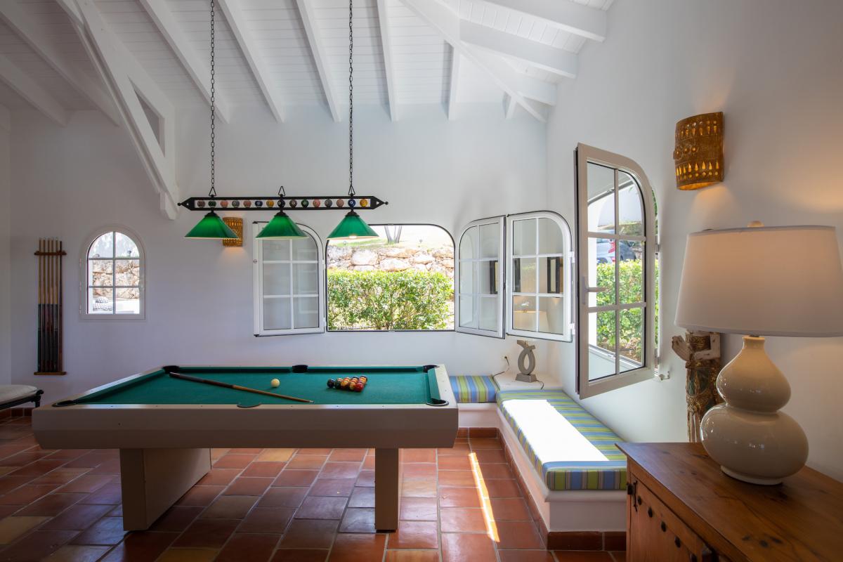 The house is perfect for outdoor living and entertaining with multi-level terraces that descend from the main level to the large horseshoe shaped pool and beyond to the lawn. Multiple al fresco dining and seating areas take full advantage of the view; whether privately or together with friends and family. If you wish to relax inside, while still enjoying sea views, step into the large comfortable living room with 40” flat screen satellite TV/DVD, stereo system, and full sized pool table. Adjacent to the interior dining and living room is a well-equipped kitchen fitted with fine dinner & glass ware and everything required for a gourmet meal. Open to the view, the kitchen connects the chef with the guests or prepare your al fresco meal on the built in gas barbeque.