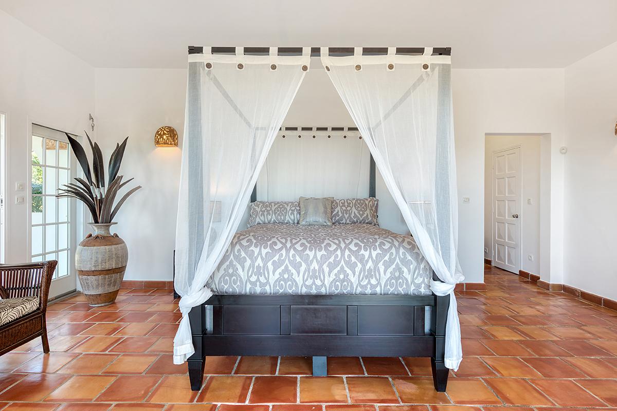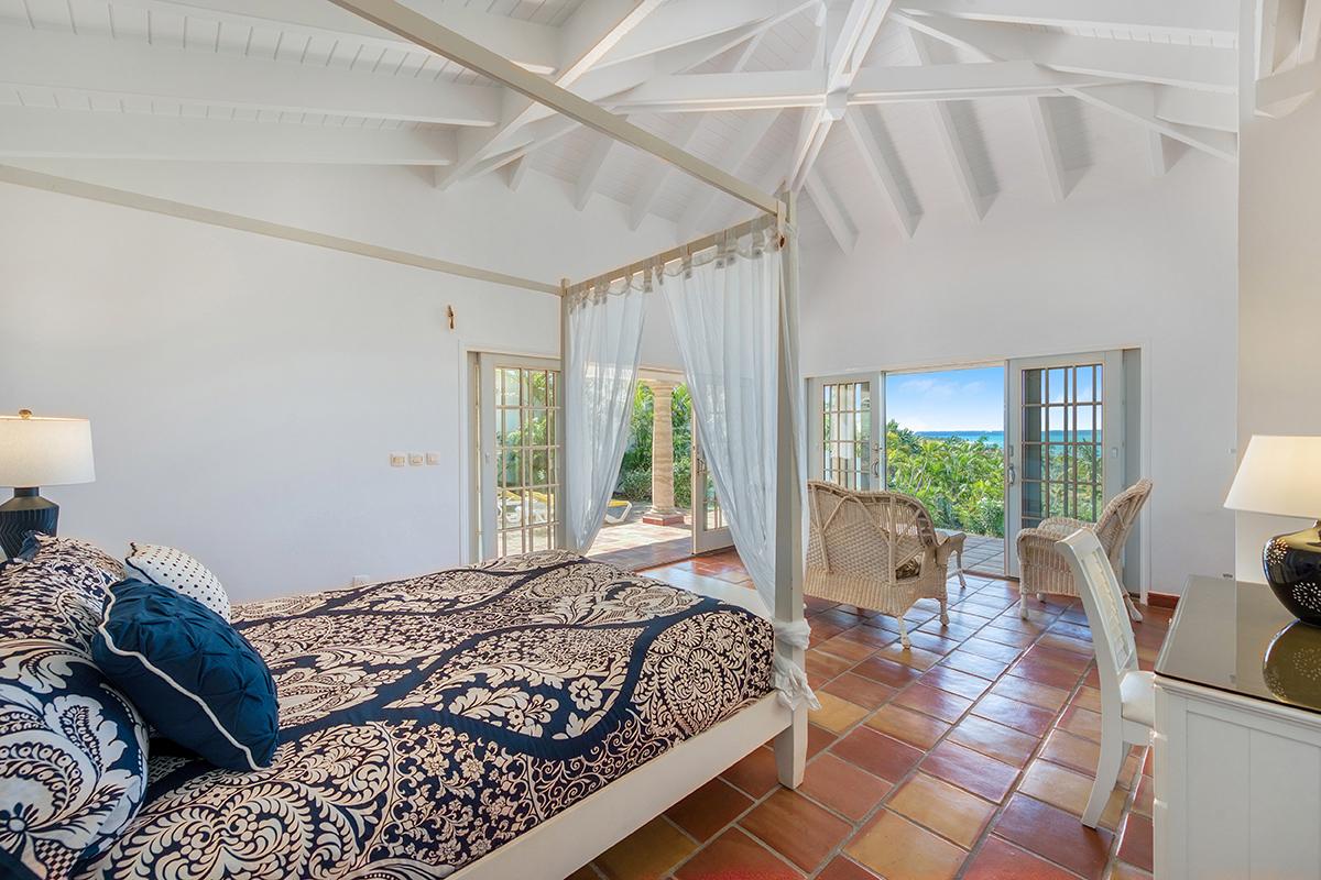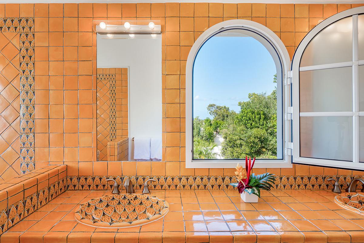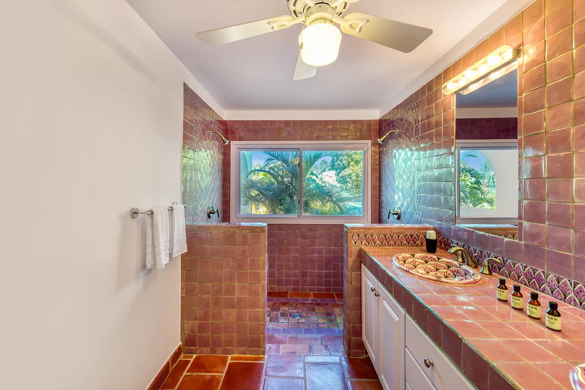 The four exterior access bedrooms are equal size and air conditioned. Two are placed at each end of the villa; one upper and one lower. The décor in each room is filled with airy, romantic style heightened by high vaulted ceiling and wicker, rattan or dark wood tropical furnishings accented with white and cream fabrics. Every room has sea or pool views plus private terraces and interior seating. The bathrooms are uniquely decorated in richly colored traditional tiles and sinks from Provence. From the oversized double showers, you view the ocean and gardens.