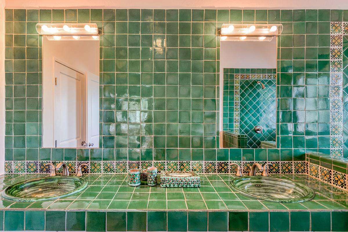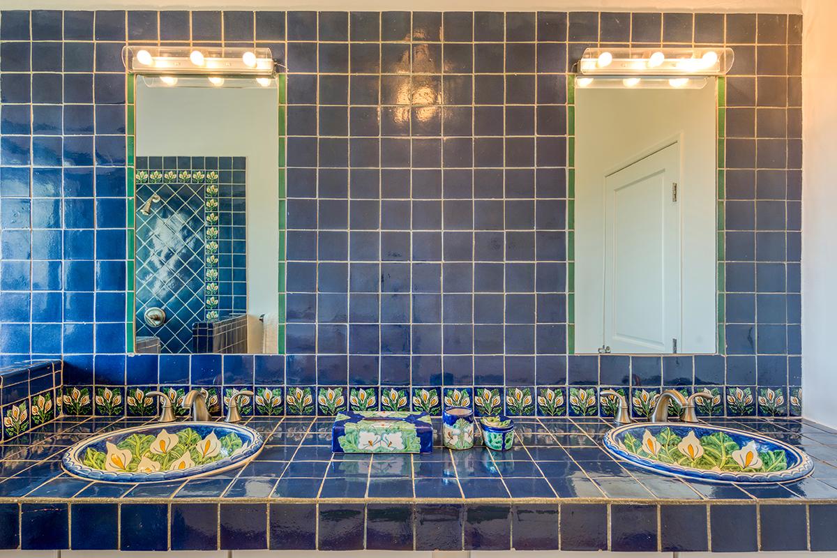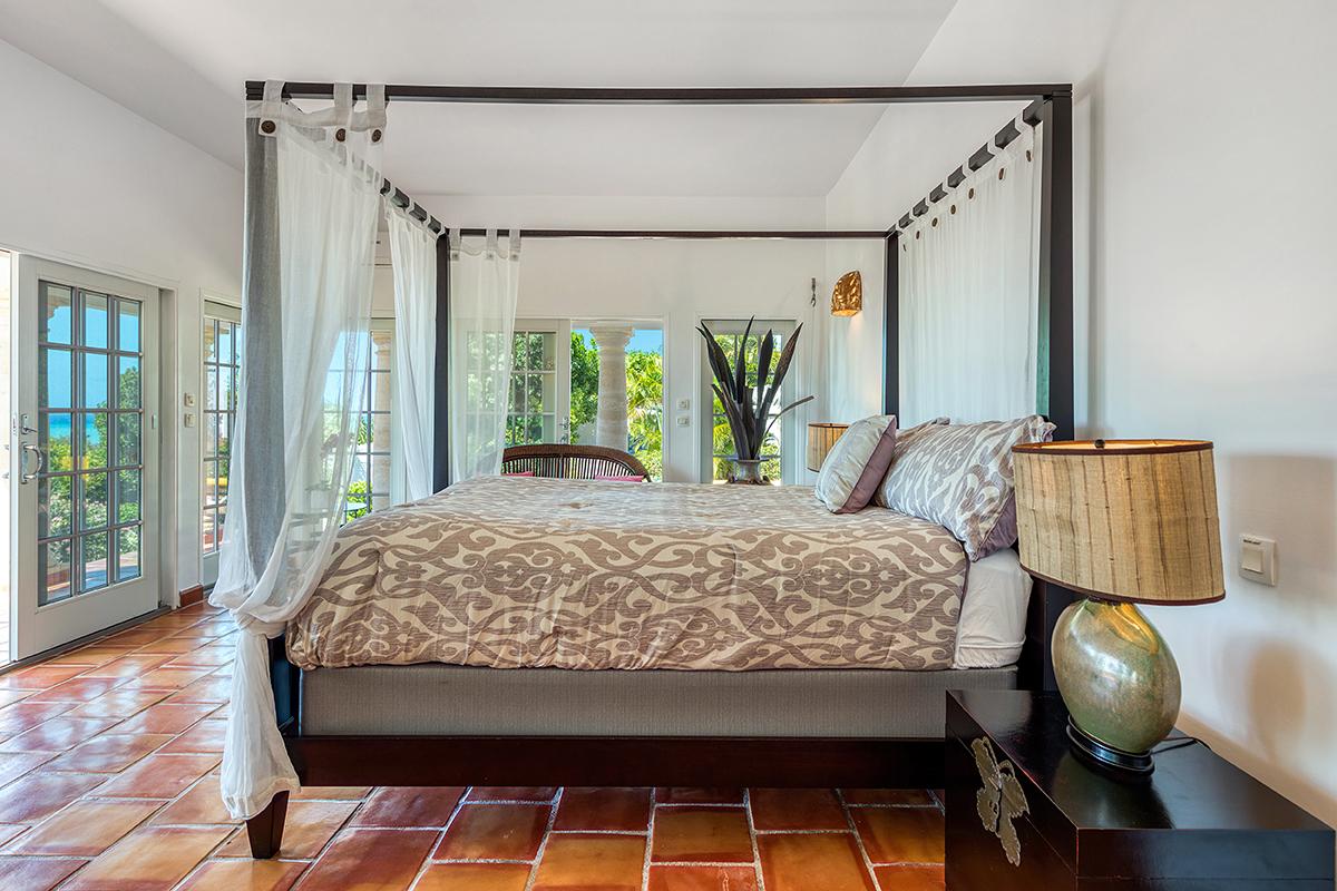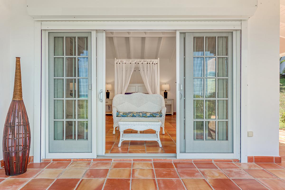 The four exterior access bedrooms are equal size and air conditioned. Two are placed at each end of the villa; one upper and one lower. The décor in each room is filled with airy, romantic style heightened by high vaulted ceiling and wicker, rattan or dark wood tropical furnishings accented with white and cream fabrics. Every room has sea or pool views plus private terraces and interior seating. The bathrooms are uniquely decorated in richly colored traditional tiles and sinks from Provence. From the oversized double showers, you view the ocean and gardens.
