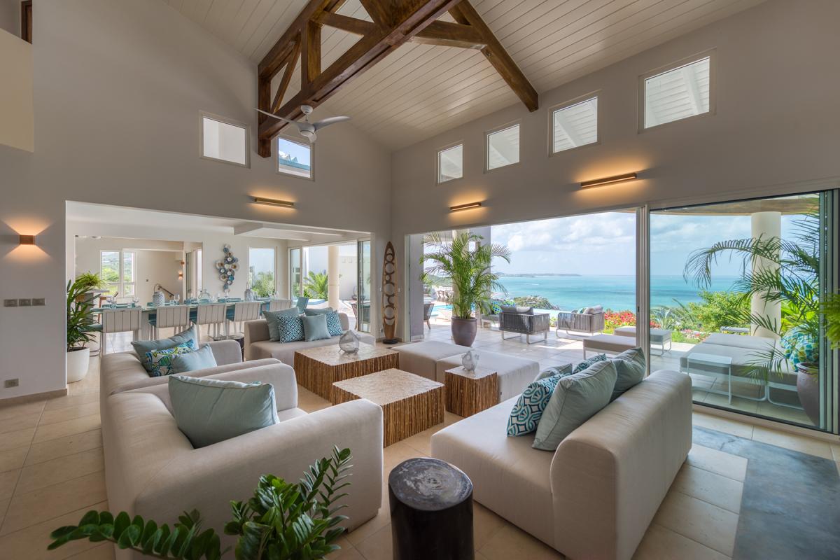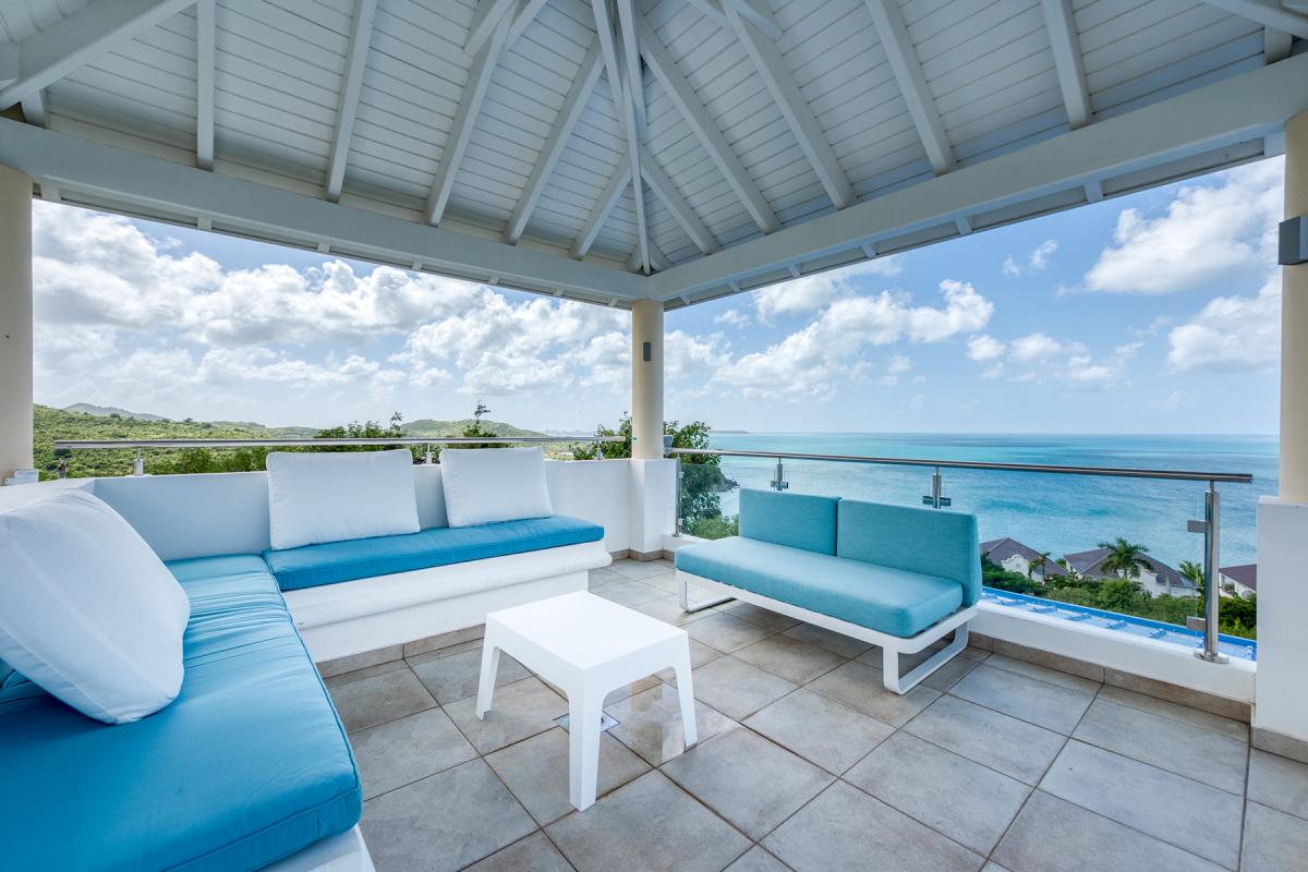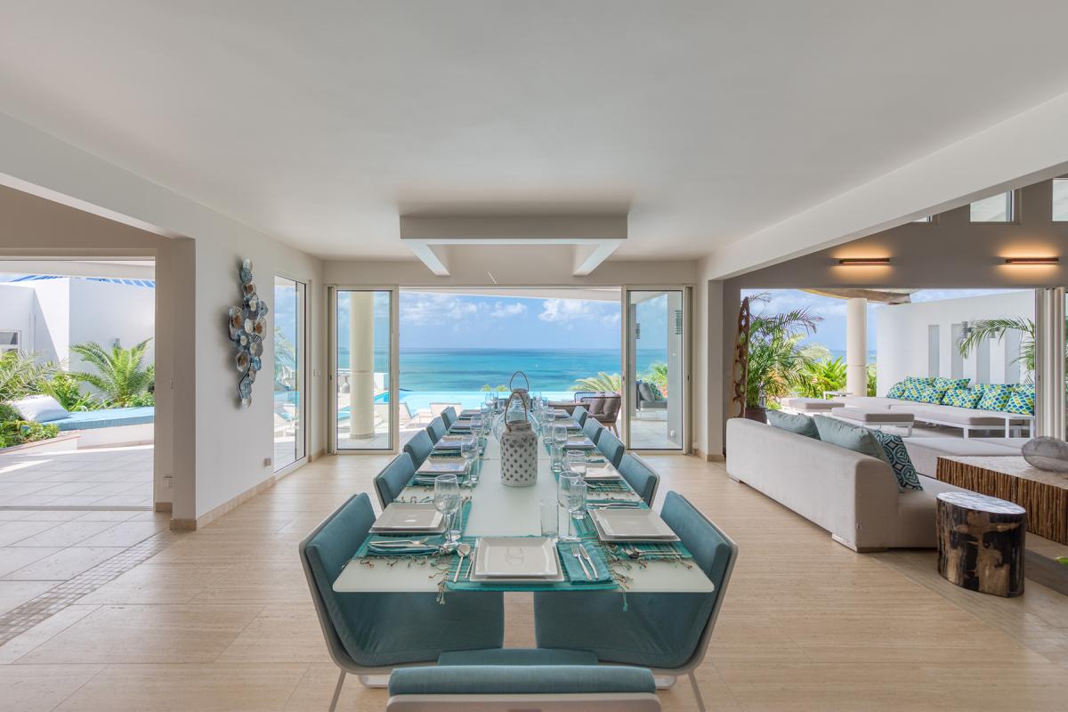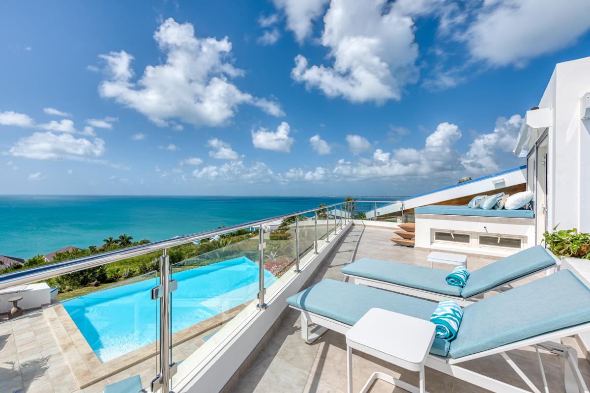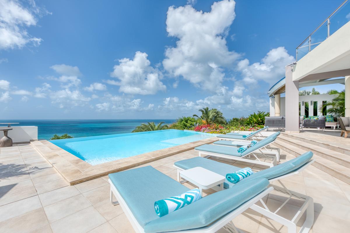 Ocean 5 sits high on the slopes of Mont Choisy, an exclusive ocean view neighborhood, on the northern coastline of French St. Martin and enjoys an unobstructed panorama of the Caribbean Sea with the neighboring island of Anguilla in the distance and just below the beaches of Friar’s Bay and Happy Bay. The contemporary and asymmetrical lines of the residence follow the slope of the land and offer beautiful ocean views from each of the 3 levels, from the expansive open-plan living area and all six bedrooms.