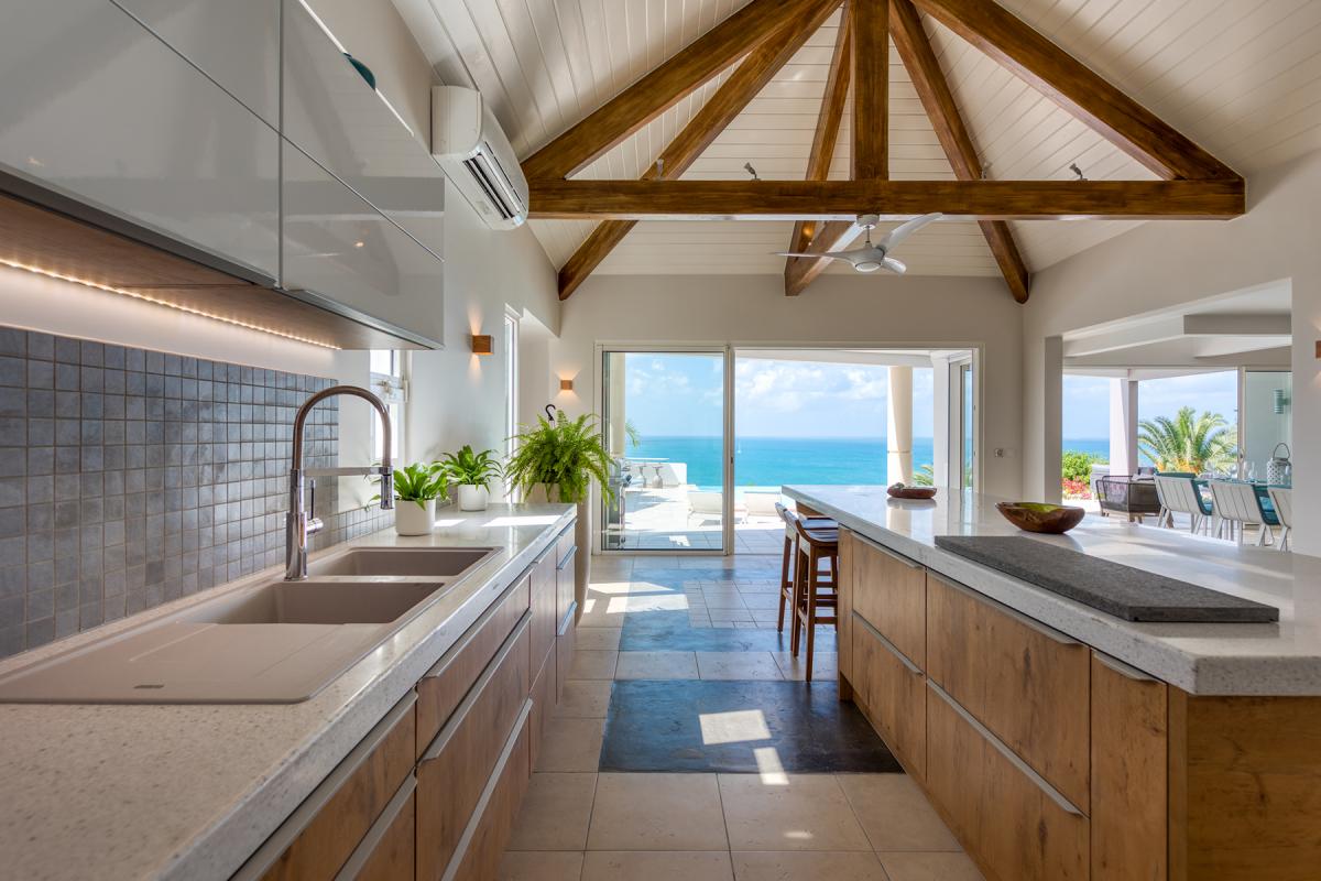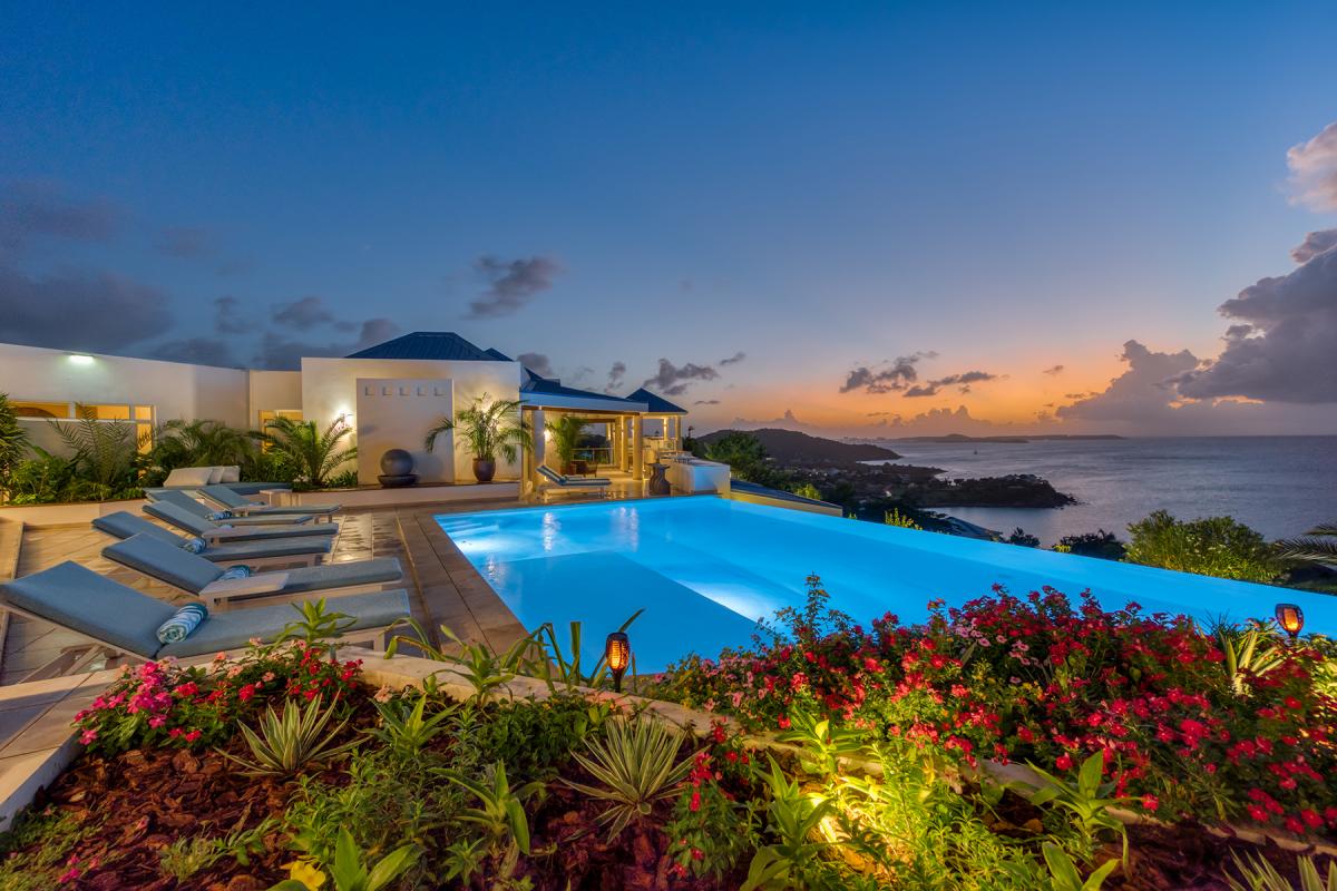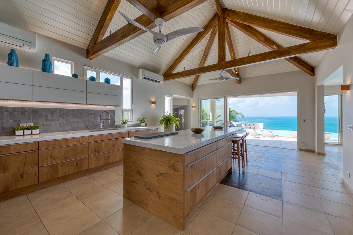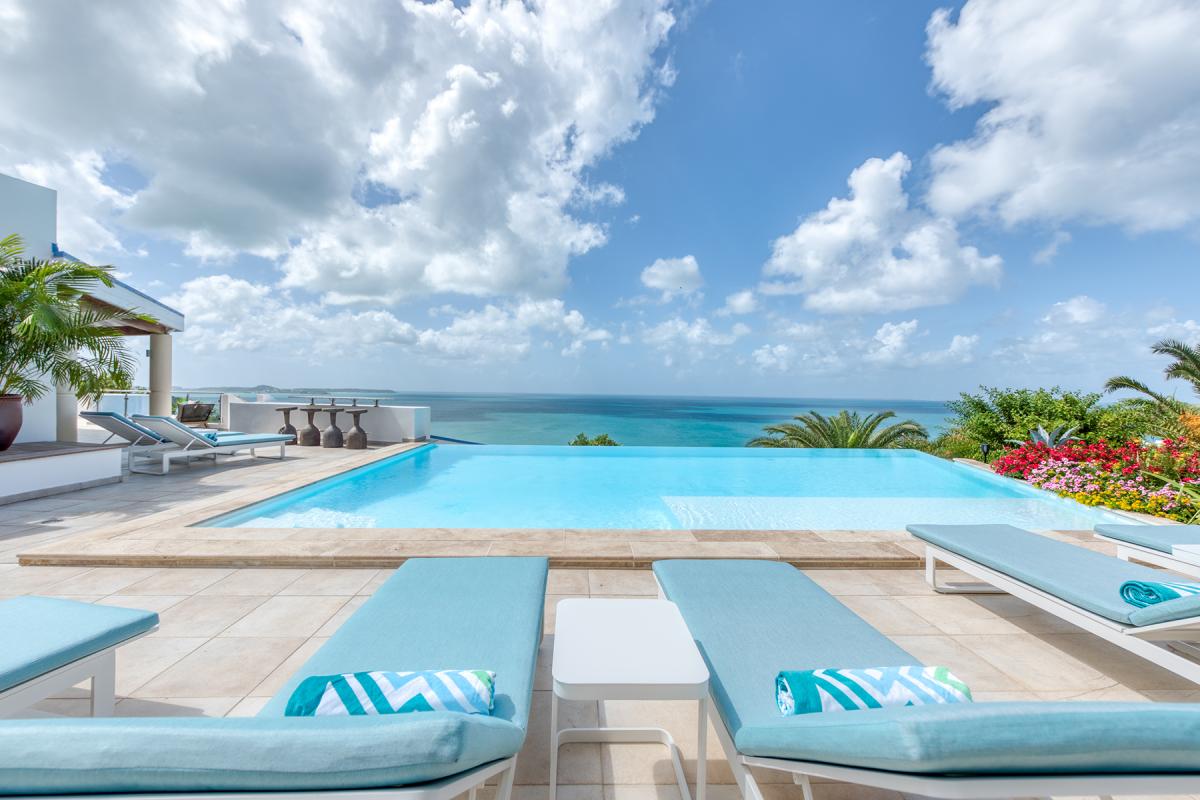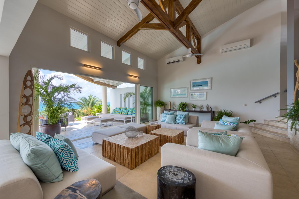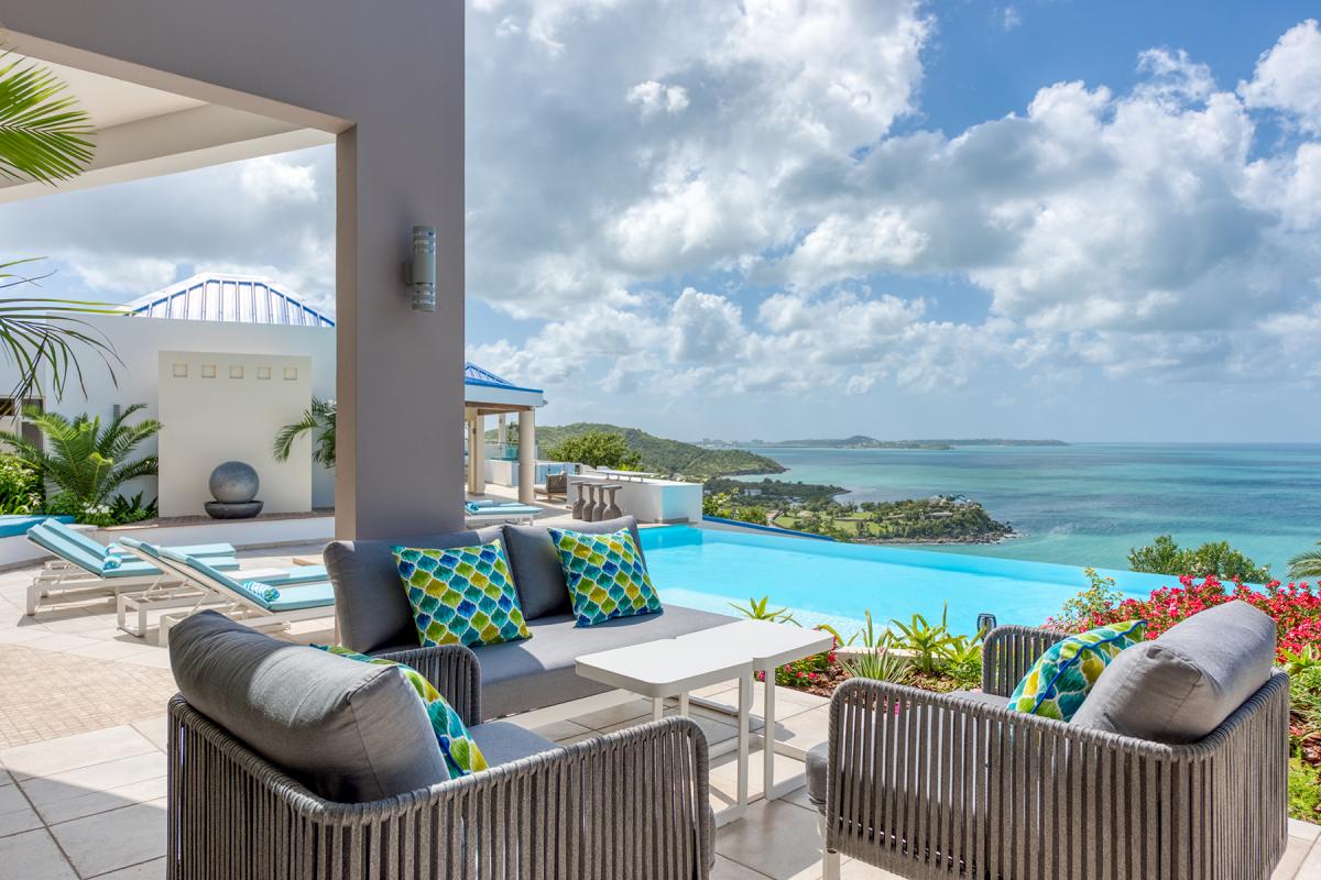Ocean 5 sits high on the slopes of Mont Choisy, an exclusive ocean view neighborhood, on the northern coastline of French St. Martin and enjoys an unobstructed panorama of the Caribbean Sea with the neighboring island of Anguilla in the distance and just below the beaches of Friar’s Bay and Happy Bay. The contemporary and asymmetrical lines of the residence follow the slope of the land and offer beautiful ocean views from each of the 3 levels, from the expansive open-plan living area and all six bedrooms.