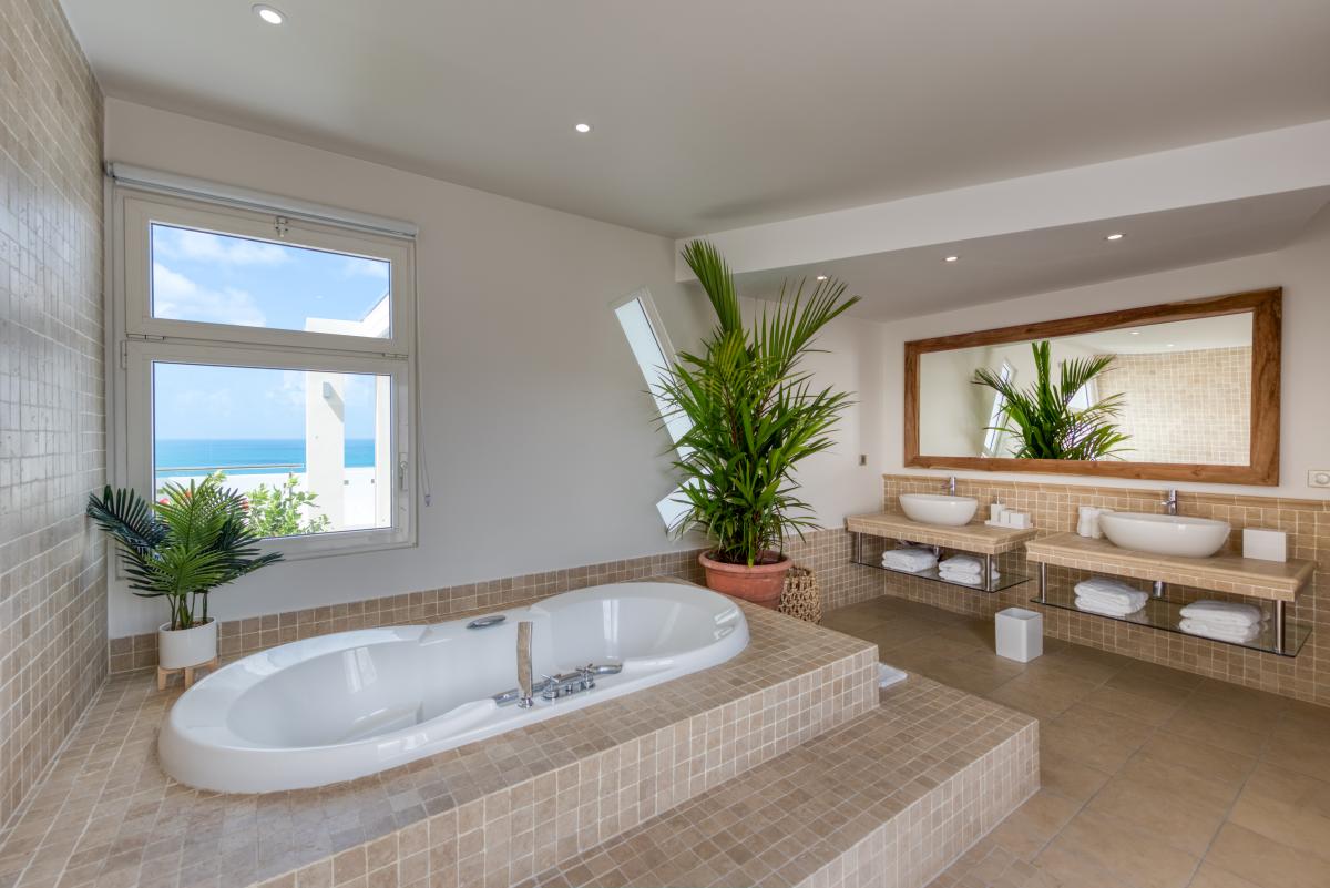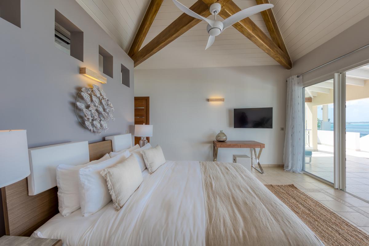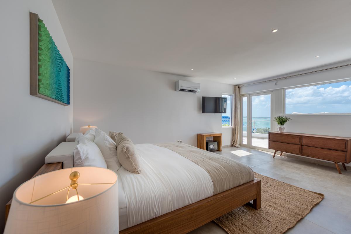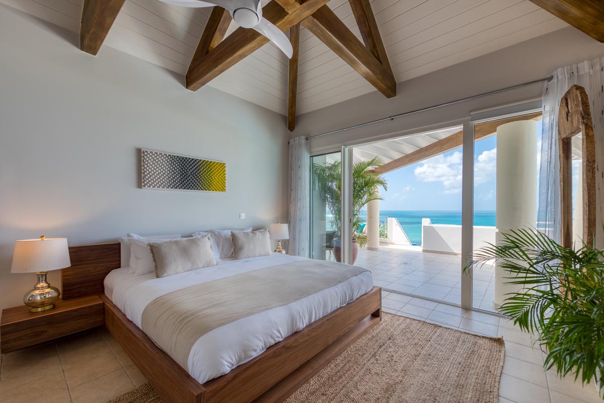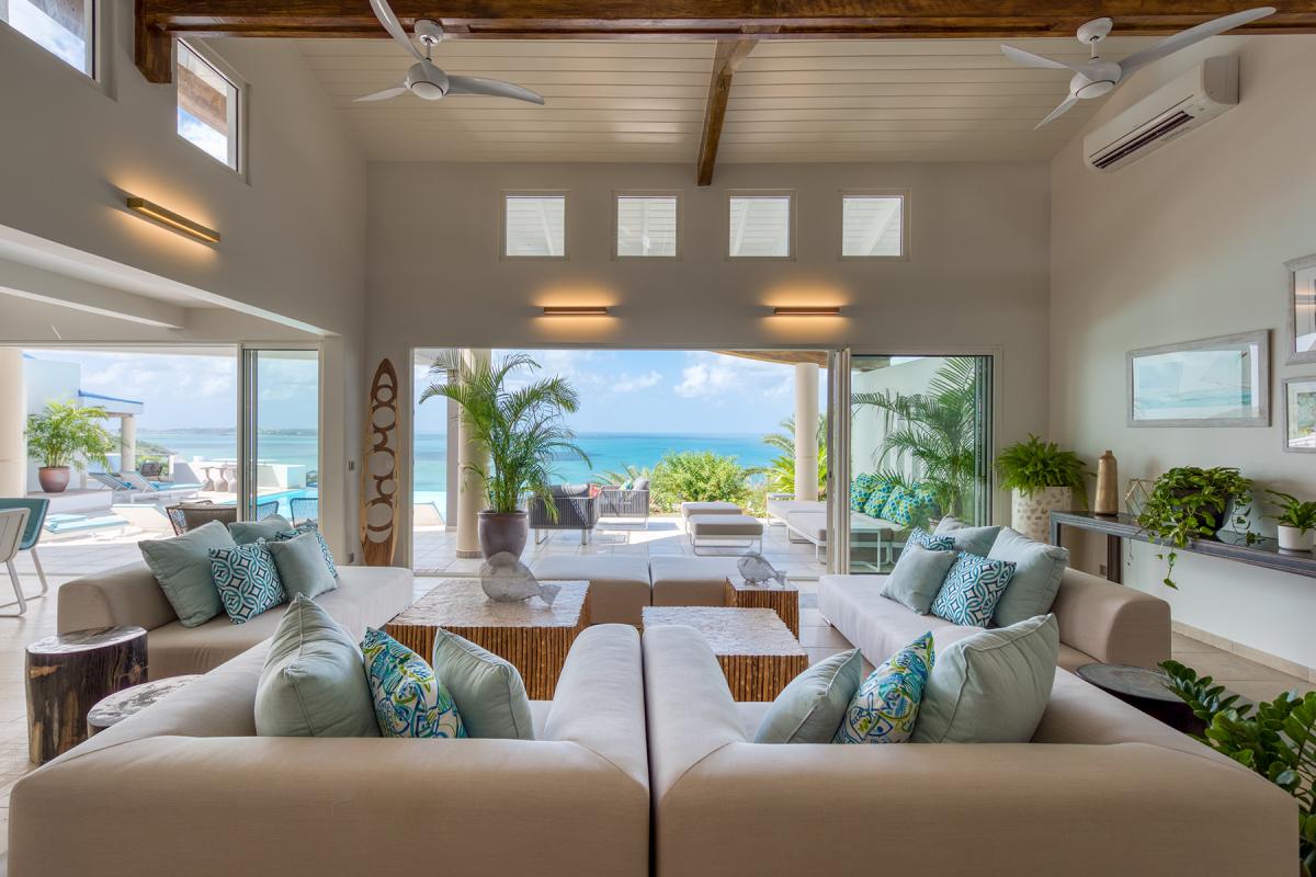 Ocean 5 sits high on the slopes of Mont Choisy, an exclusive ocean view neighborhood, on the northern coastline of French St. Martin and enjoys an unobstructed panorama of the Caribbean Sea with the neighboring island of Anguilla in the distance and just below the beaches of Friar’s Bay and Happy Bay. The contemporary and asymmetrical lines of the residence follow the slope of the land and offer beautiful ocean views from each of the 3 levels, from the expansive open-plan living area and all six bedrooms.