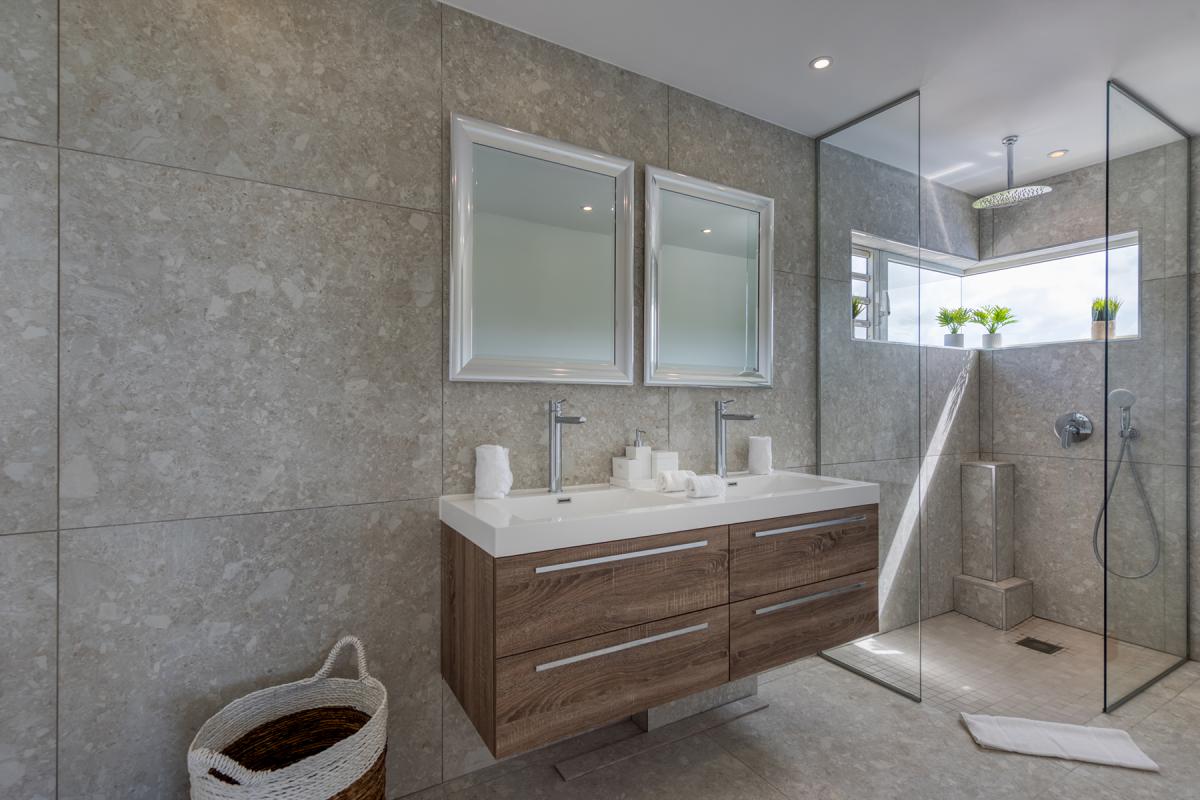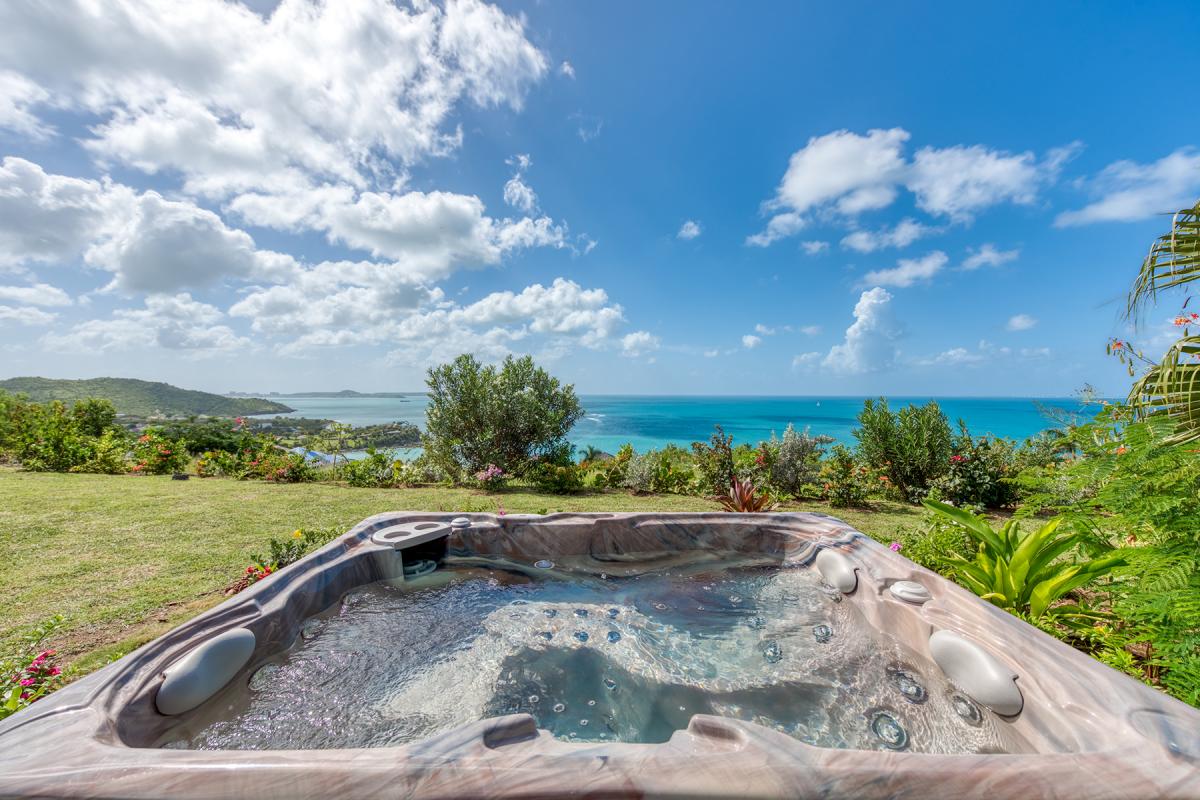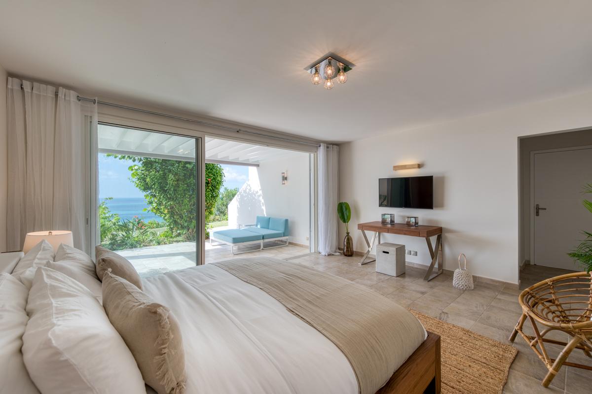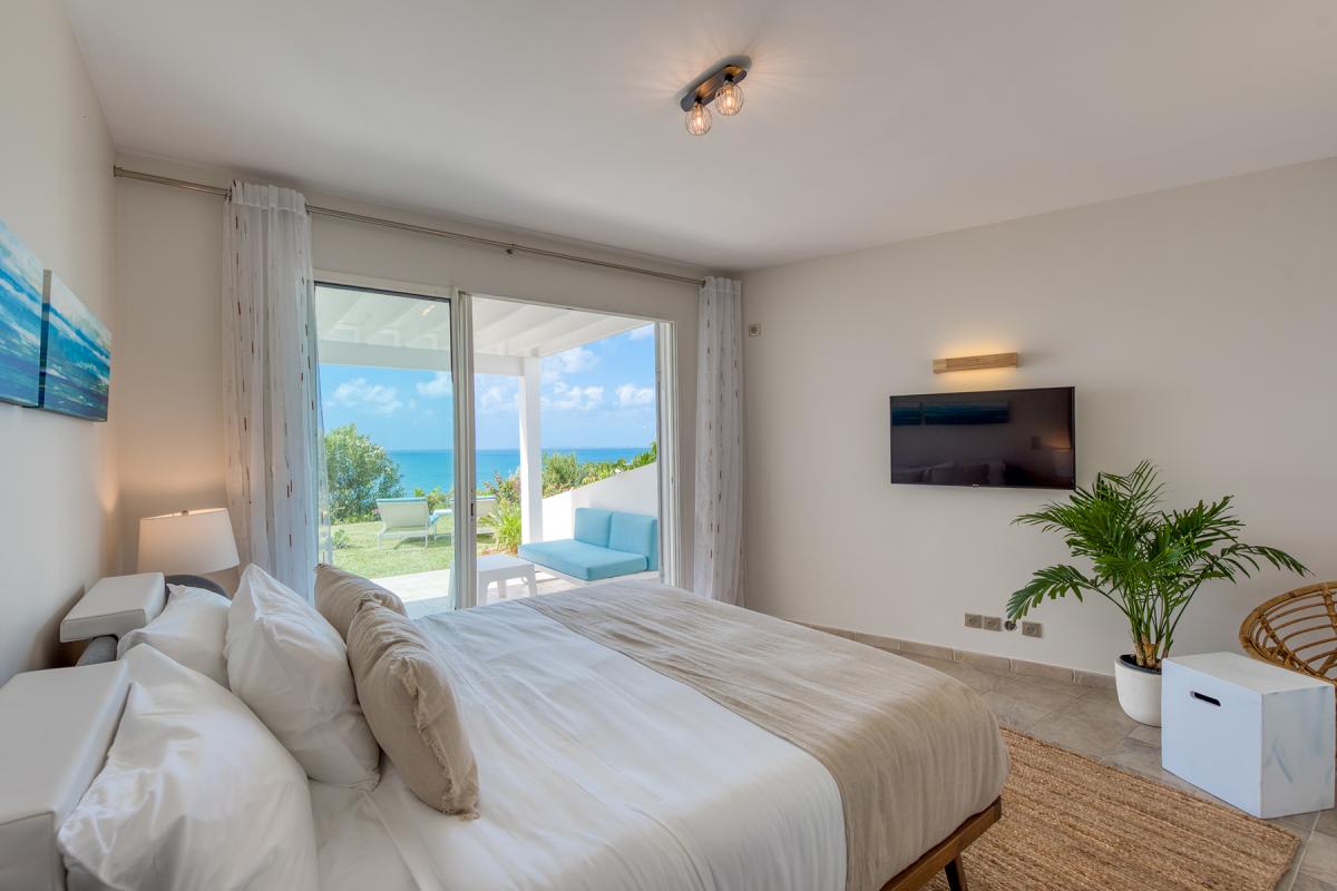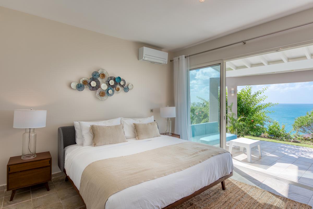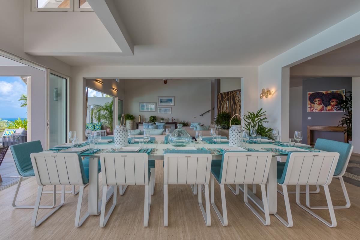 Ocean 5 sits high on the slopes of Mont Choisy, an exclusive ocean view neighborhood, on the northern coastline of French St. Martin and enjoys an unobstructed panorama of the Caribbean Sea with the neighboring island of Anguilla in the distance and just below the beaches of Friar’s Bay and Happy Bay. The contemporary and asymmetrical lines of the residence follow the slope of the land and offer beautiful ocean views from each of the 3 levels, from the expansive open-plan living area and all six bedrooms.