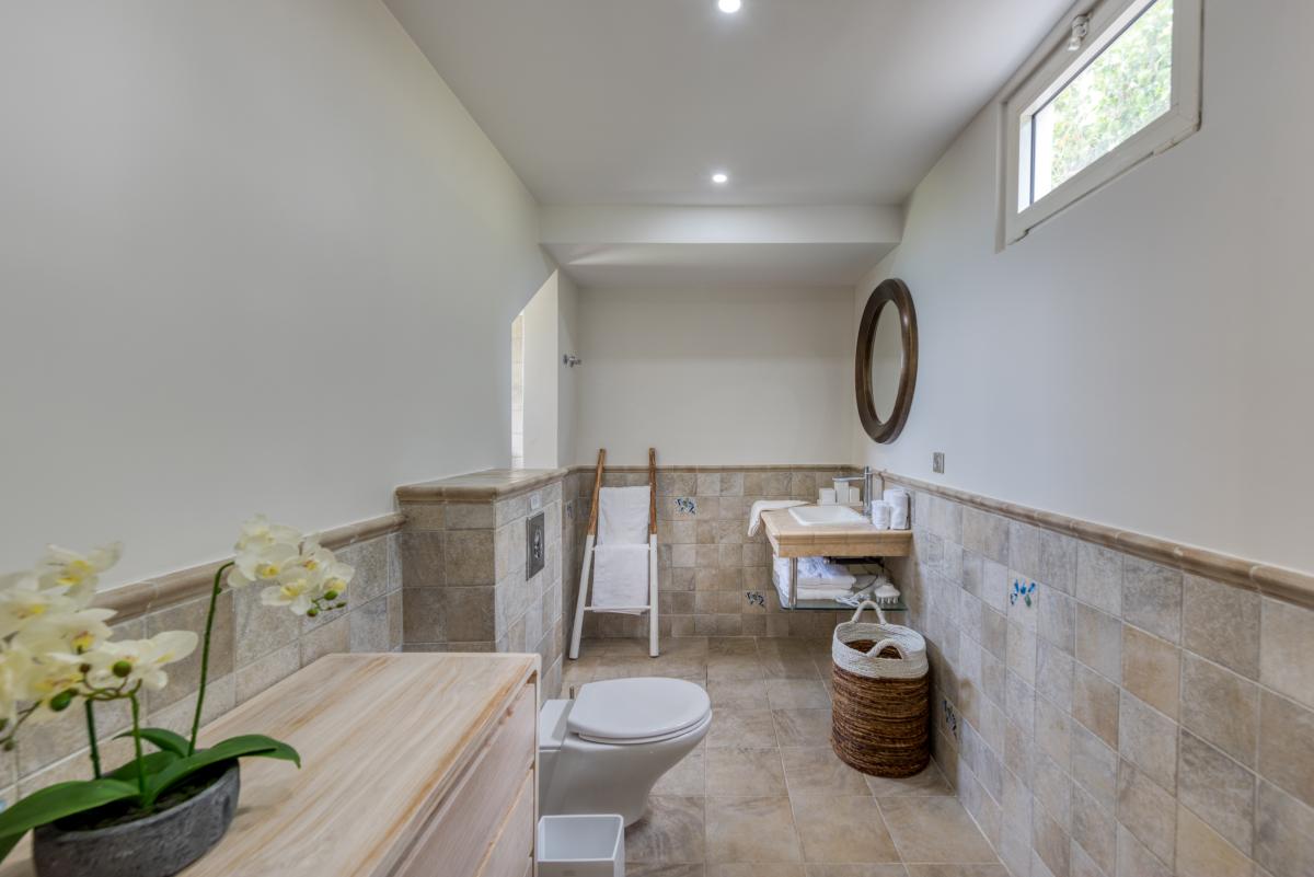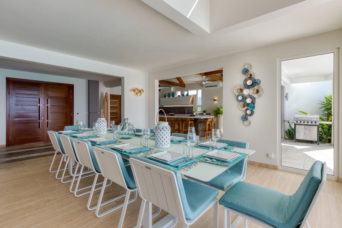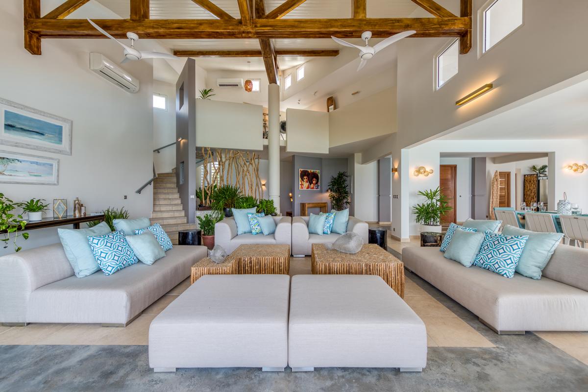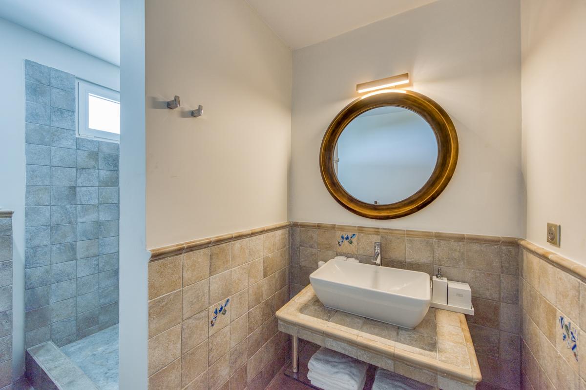A striking blue ocean vista awaits you as soon as you step through the main entrance of the ground floor into a light-filled living space with large glass sliding doors stretching the entire length of the room and opening out to a large pool and flower-lined sun terrace. Calming aquatints and natural wood accents feature throughout the house. A large dining table takes center stage of the living area. A very well-equipped and beautiful light wood kitchen makes for convivial mealtimes for large families or groups of friends. There are comfortable seating areas both within the air-conditioned living room and also in the lounge area of the outside covered terrace, just to the right of the pool. The terraced gazebo makes for an ideal spot for sunset lounging. There is a sunken living area with a TV, just off to the right of the main living space.