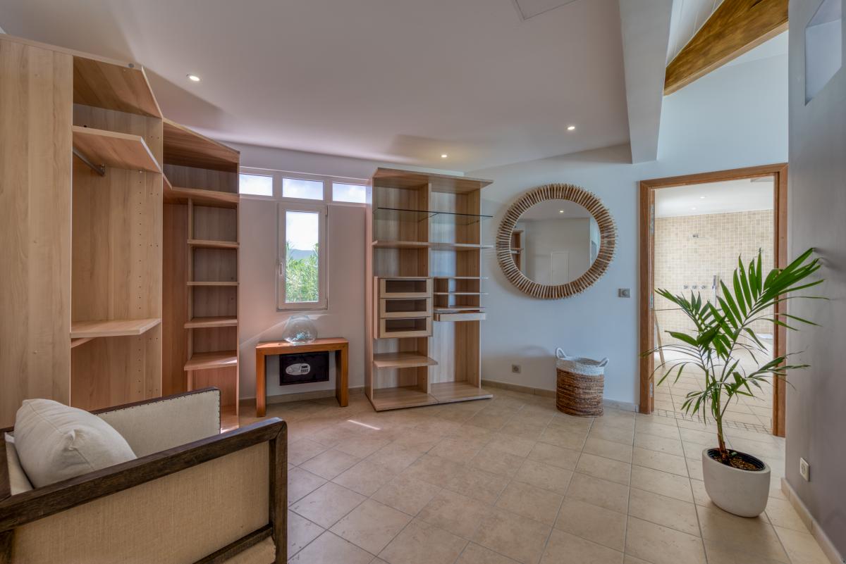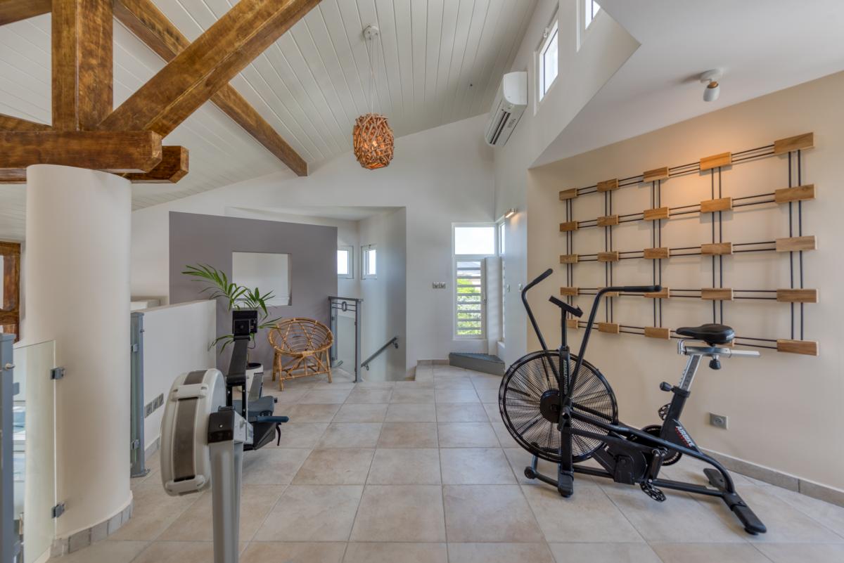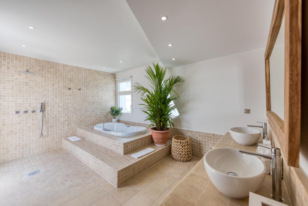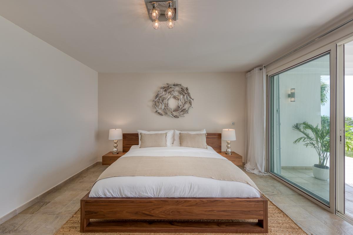 Overlooking the living room, the upper mezzanine level offers a fitness room and houses the third bedroom with en-suite bath and a private rooftop terrace with a sunbed. Two staircases descending from the pool terrace lead you to the three remaining bedrooms. Each bedroom has its own terrace with an ocean view and an en-suite bathroom with an open shower. Two of the bedrooms are connected by a door which is ideal for families with young children.