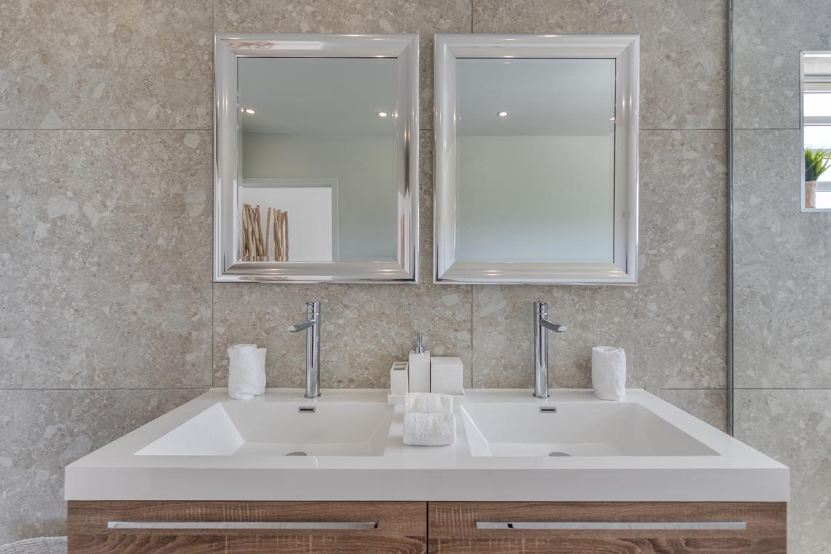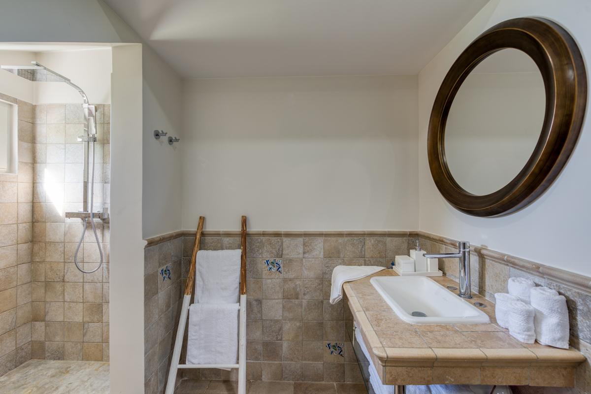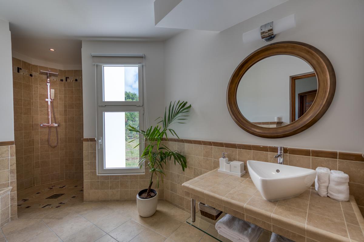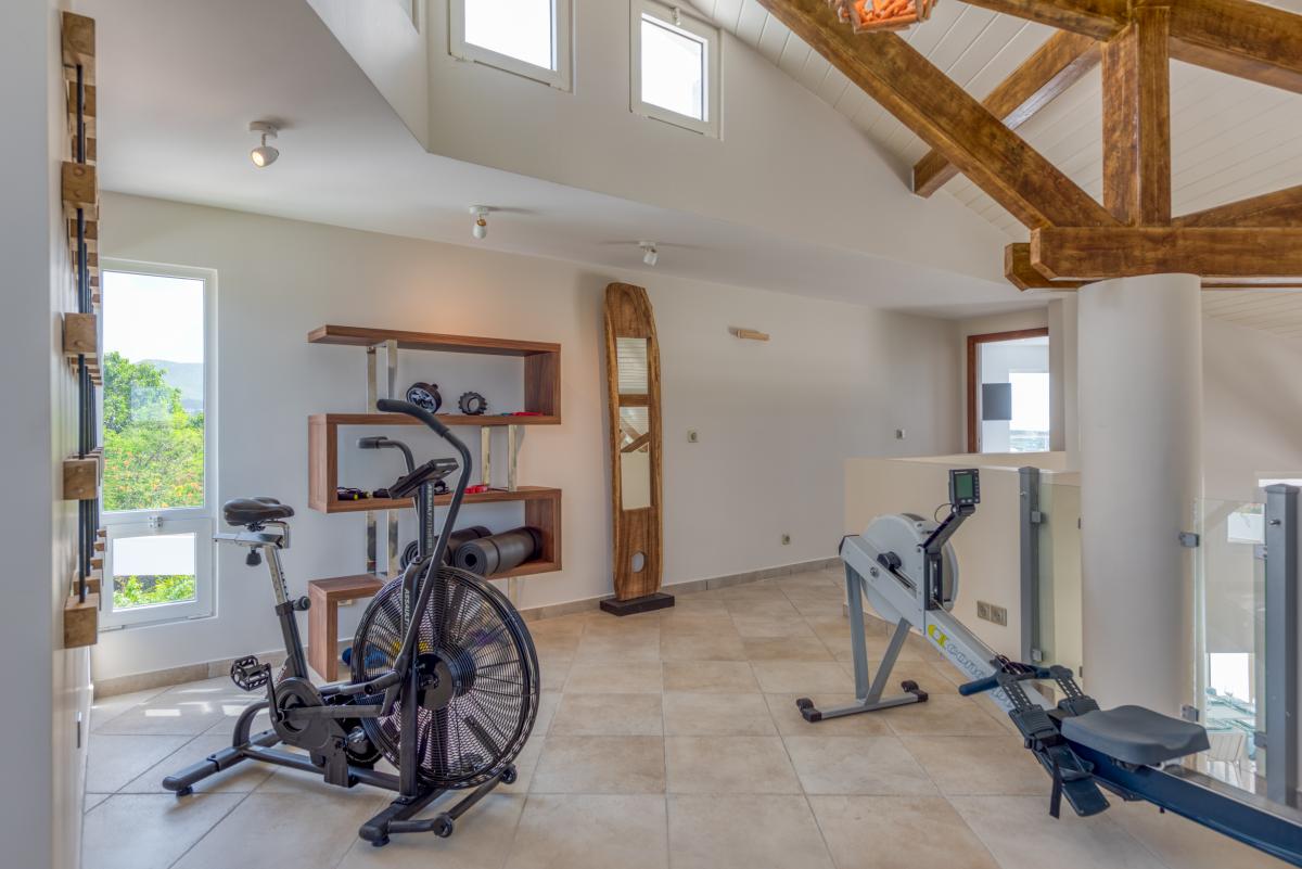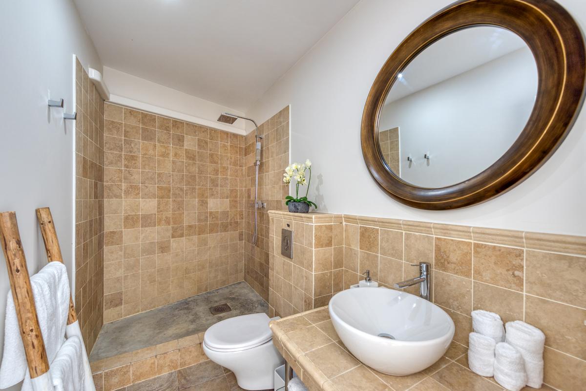 Overlooking the living room, the upper mezzanine level offers a fitness room and houses the third bedroom with en-suite bath and a private rooftop terrace with a sunbed. Two staircases descending from the pool terrace lead you to the three remaining bedrooms. Each bedroom has its own terrace with an ocean view and an en-suite bathroom with an open shower. Two of the bedrooms are connected by a door which is ideal for families with young children.