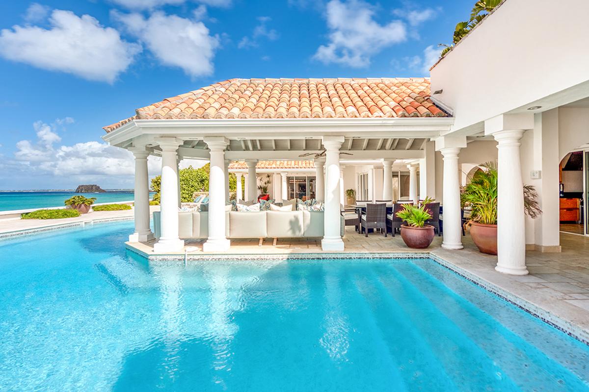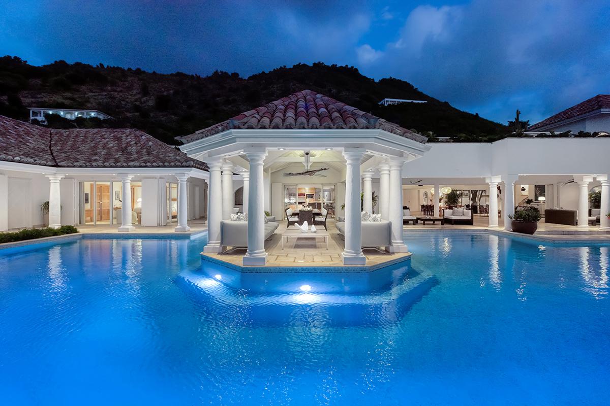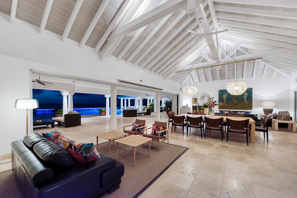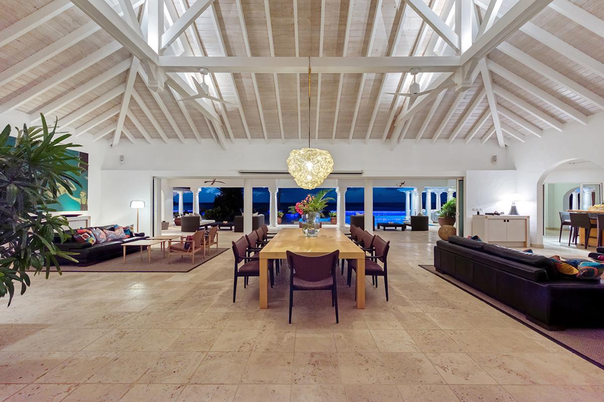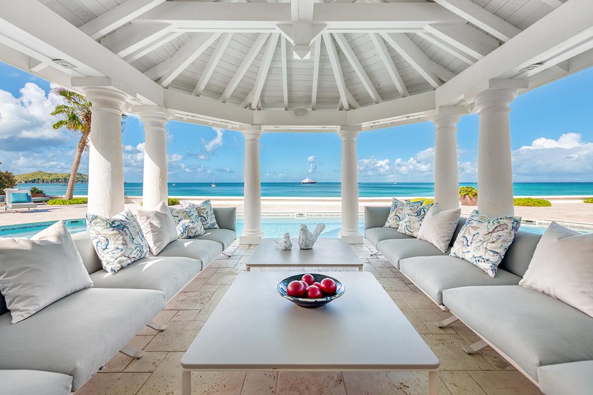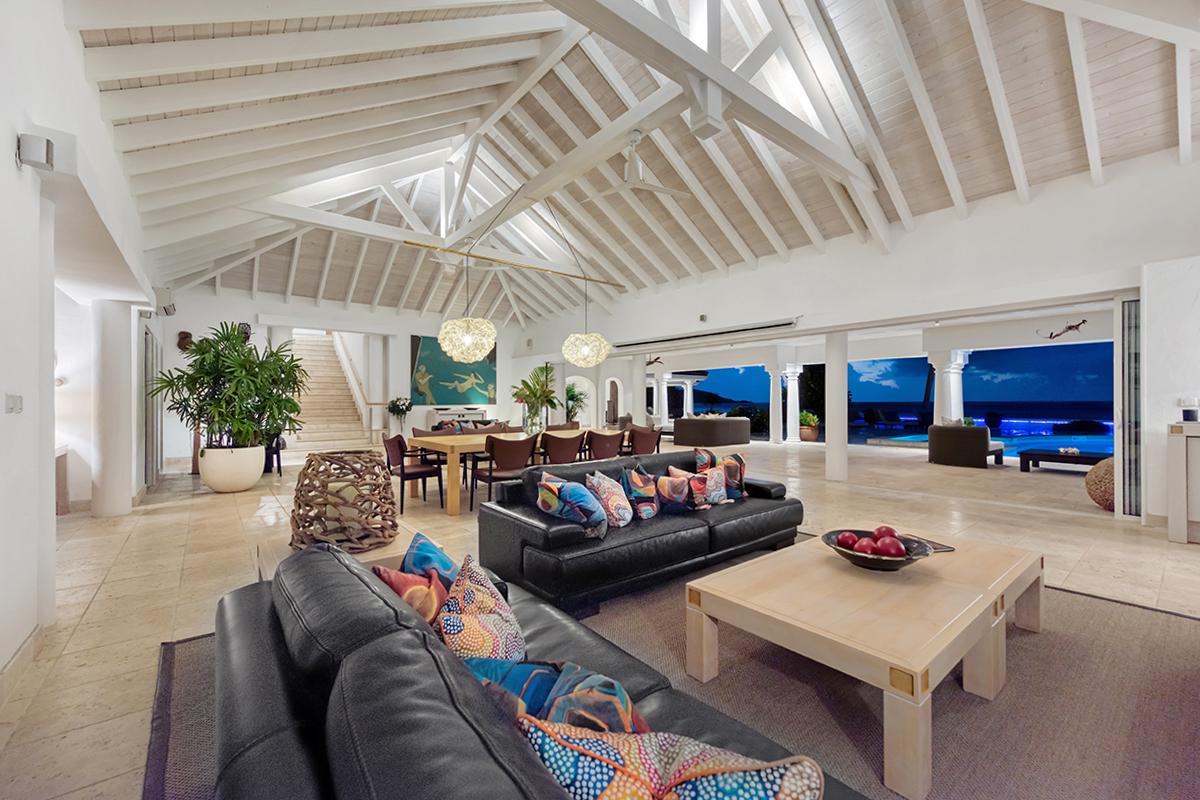 This St. Martin villa rental's principal feature is the oversized wrap-around pool and a central columned gazebo, perfect for al-fresco dining and lounging. The uninterrupted flow between the interior and exterior comes from large glass doors that slide seamlessly into the walls providing a vast living area and adjoining terrace with a stunning backdrop of sea and sky.