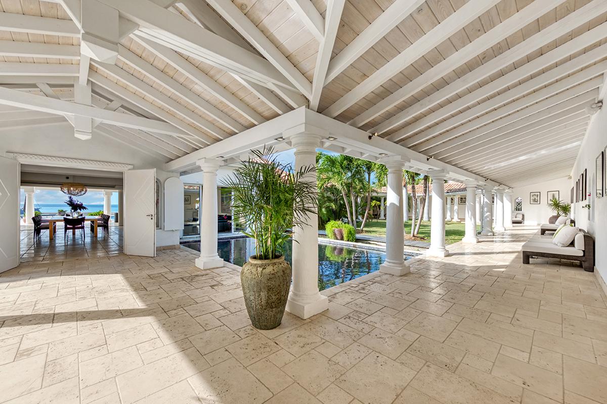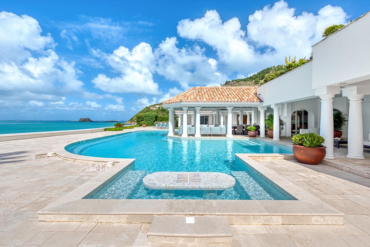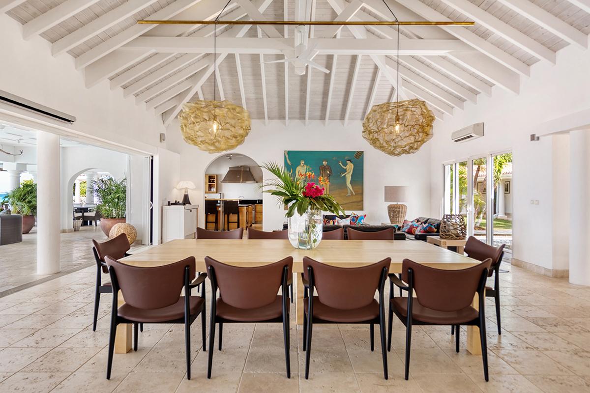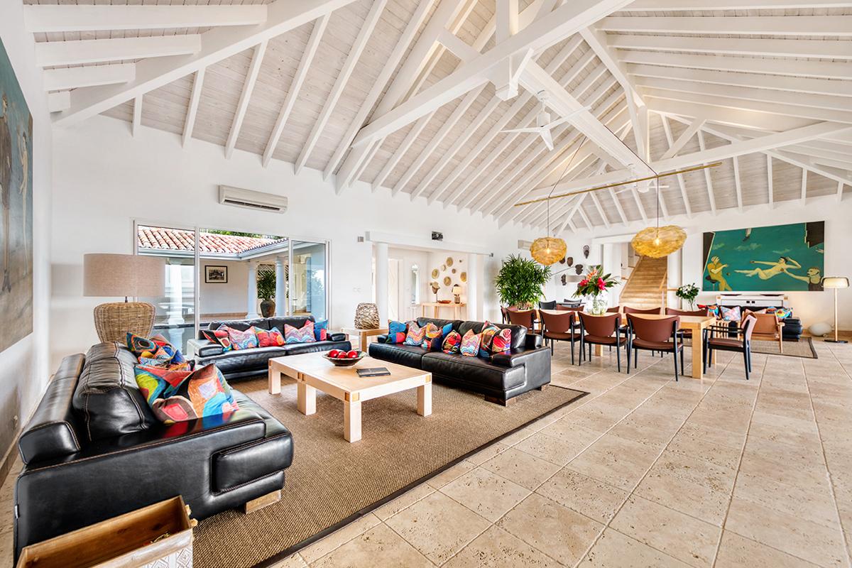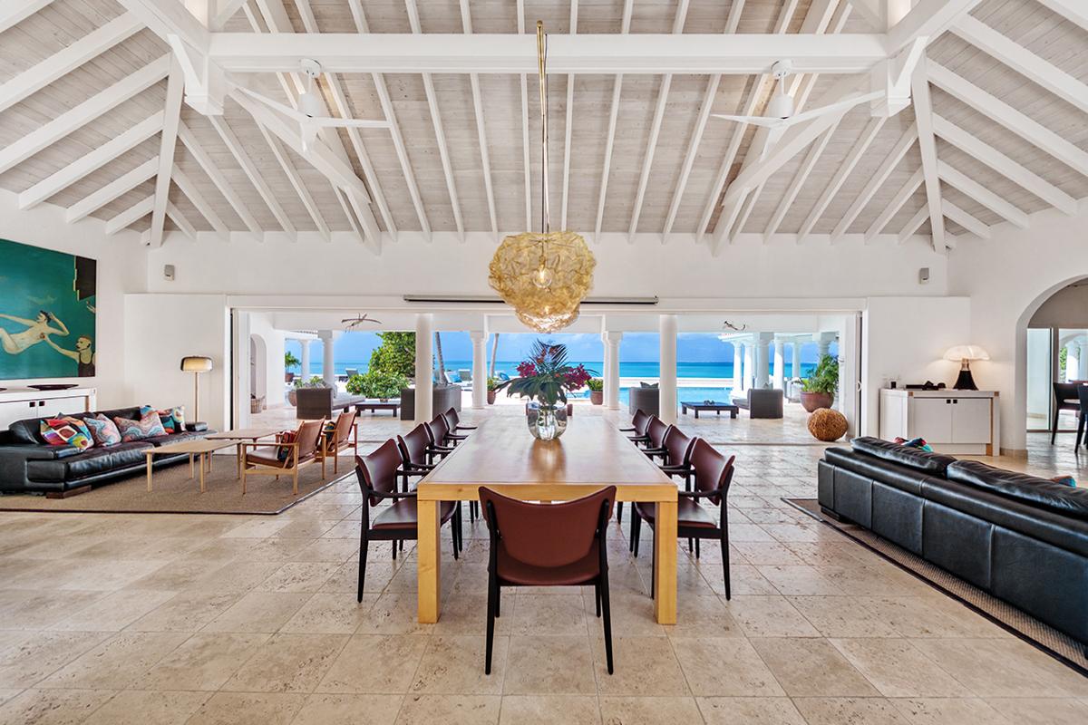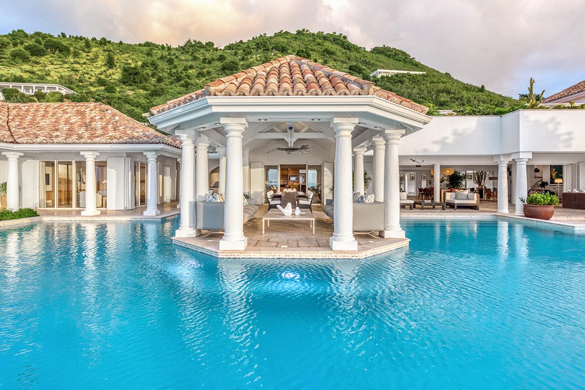 This St. Martin villa rental's principal feature is the oversized wrap-around pool and a central columned gazebo, perfect for al-fresco dining and lounging. The uninterrupted flow between the interior and exterior comes from large glass doors that slide seamlessly into the walls providing a vast living area and adjoining terrace with a stunning backdrop of sea and sky.