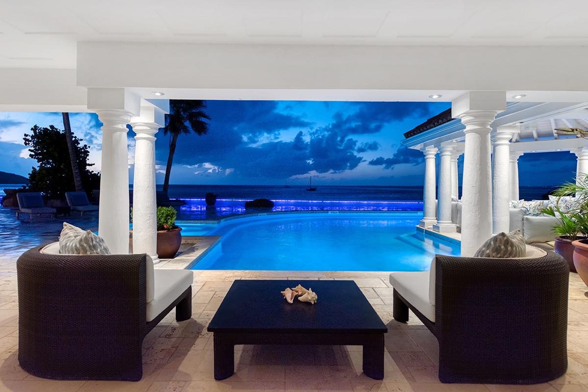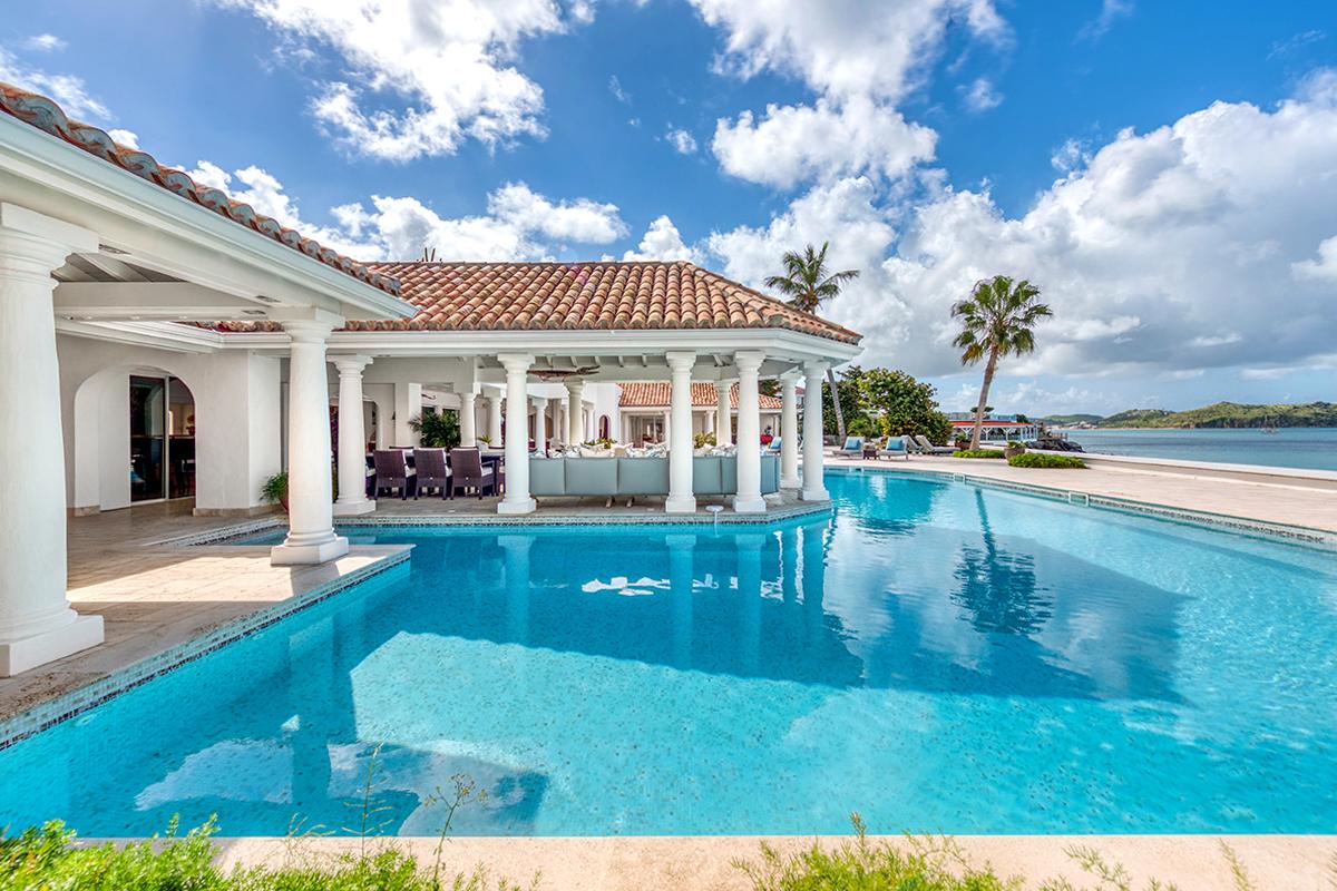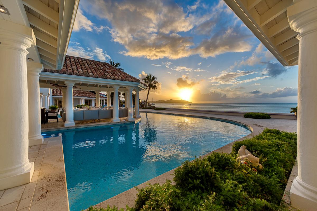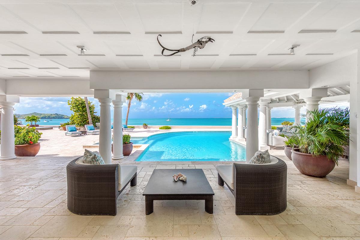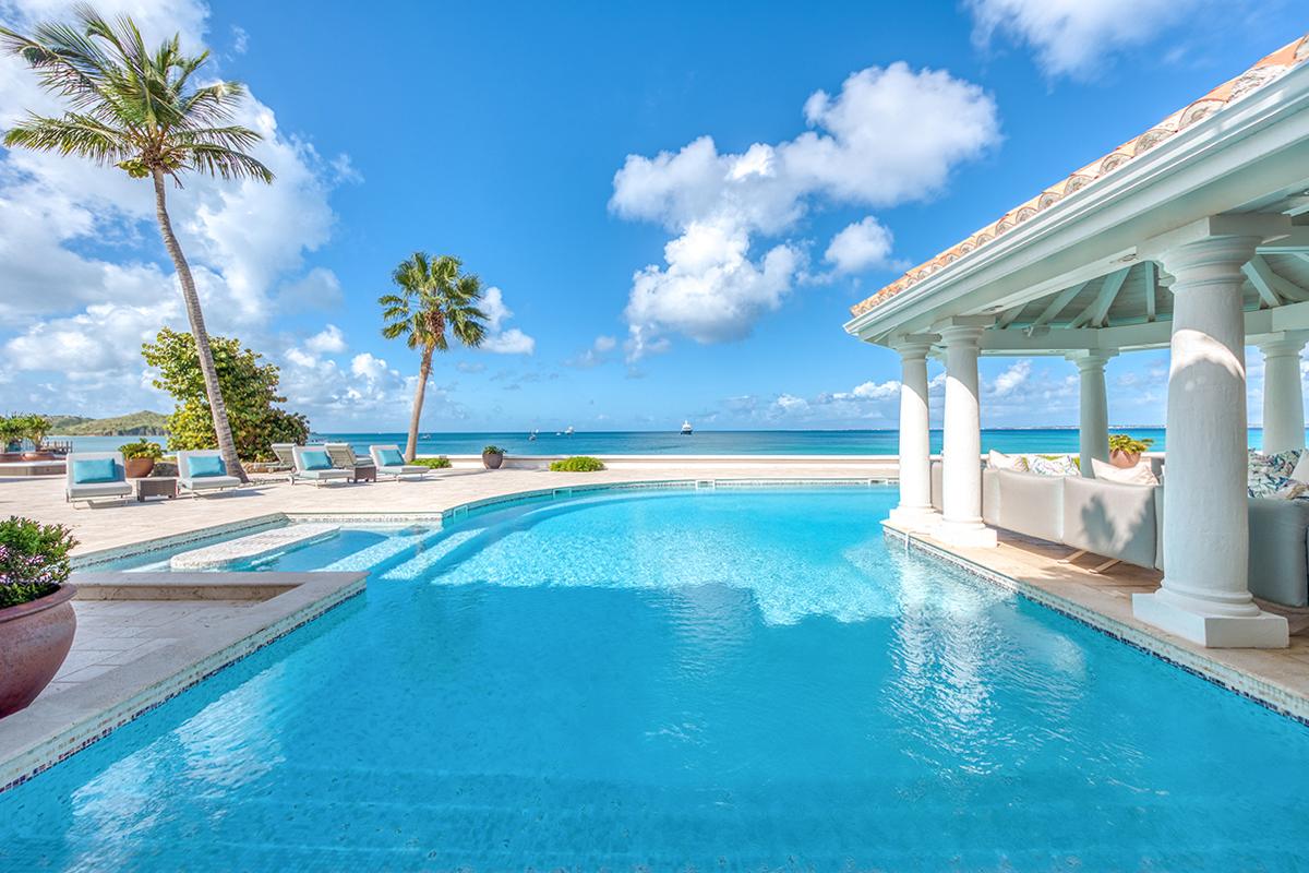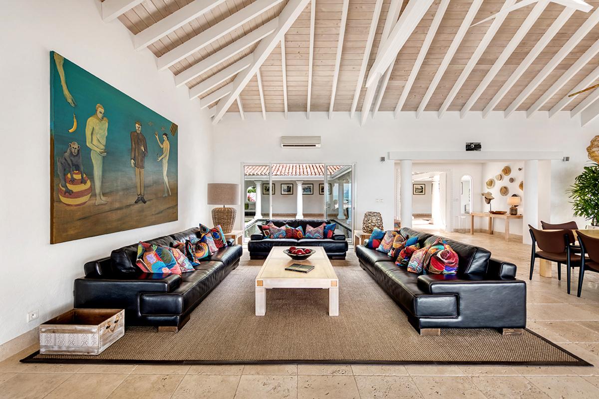 This St. Martin villa rental's principal feature is the oversized wrap-around pool and a central columned gazebo, perfect for al-fresco dining and lounging. The uninterrupted flow between the interior and exterior comes from large glass doors that slide seamlessly into the walls providing a vast living area and adjoining terrace with a stunning backdrop of sea and sky.