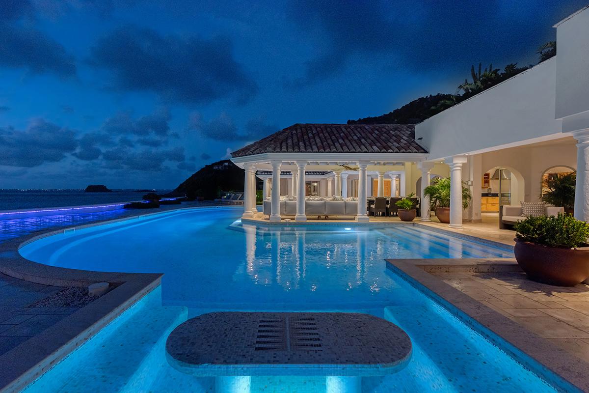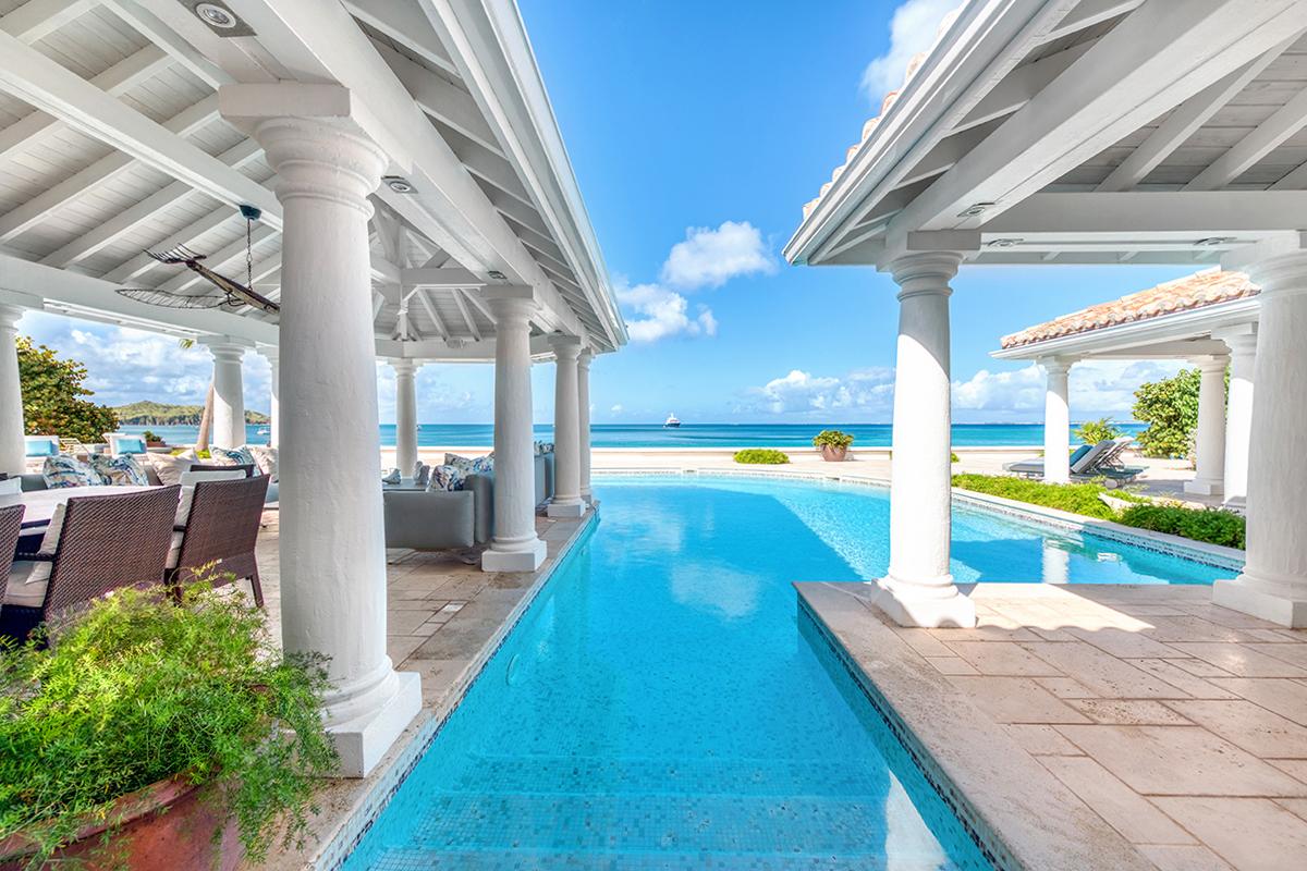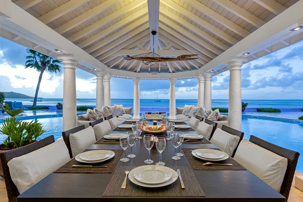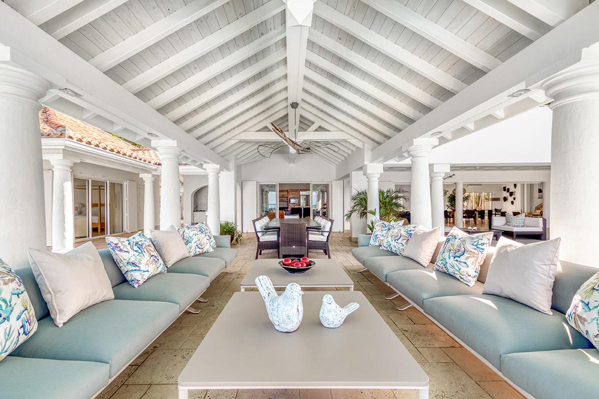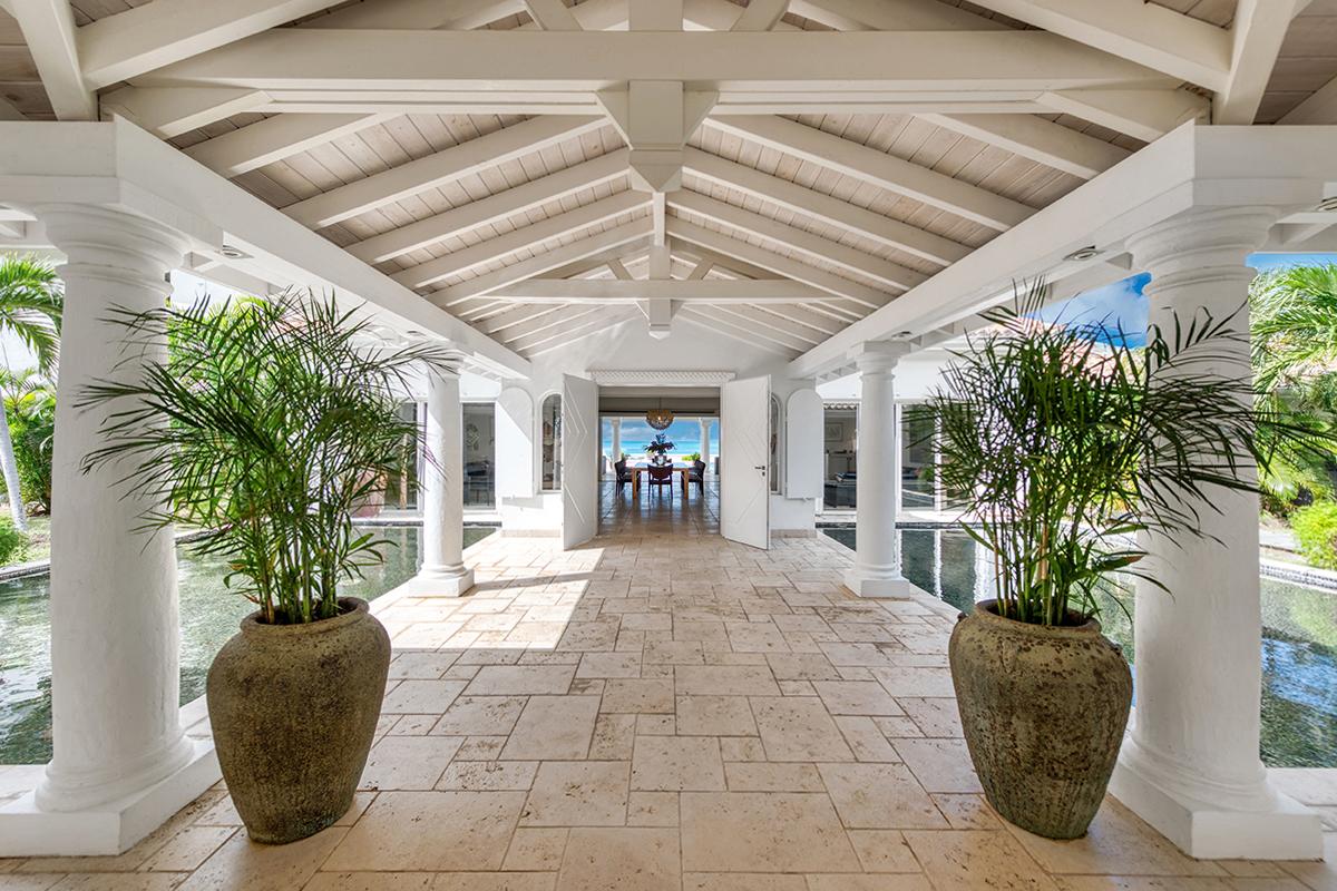This St. Martin villa rental's principal feature is the oversized wrap-around pool and a central columned gazebo, perfect for al-fresco dining and lounging. The uninterrupted flow between the interior and exterior comes from large glass doors that slide seamlessly into the walls providing a vast living area and adjoining terrace with a stunning backdrop of sea and sky.