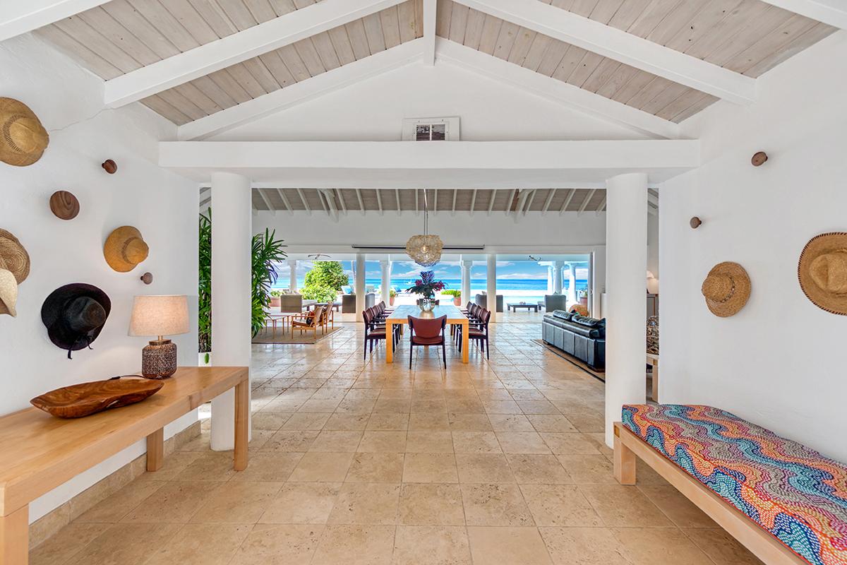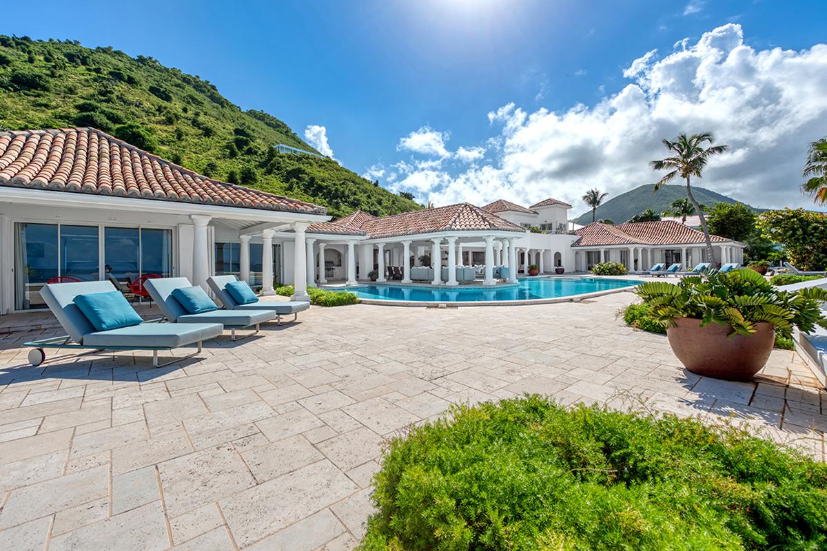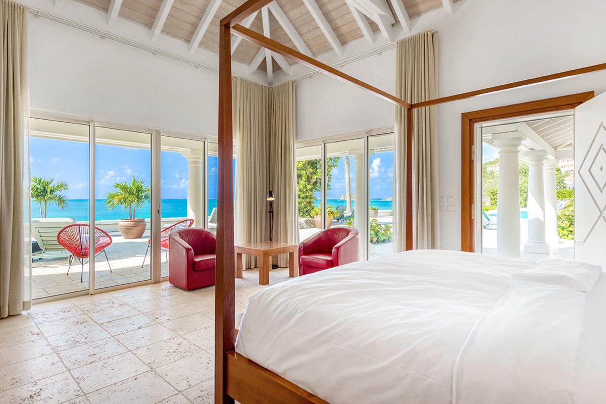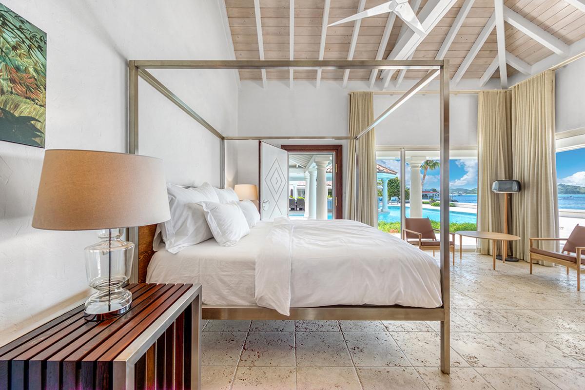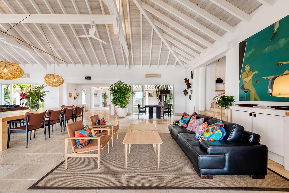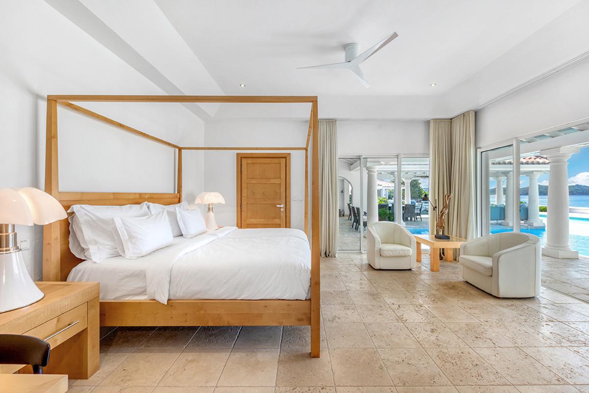 This St. Martin villa rental's principal feature is the oversized wrap-around pool and a central columned gazebo, perfect for al-fresco dining and lounging. The uninterrupted flow between the interior and exterior comes from large glass doors that slide seamlessly into the walls providing a vast living area and adjoining terrace with a stunning backdrop of sea and sky.