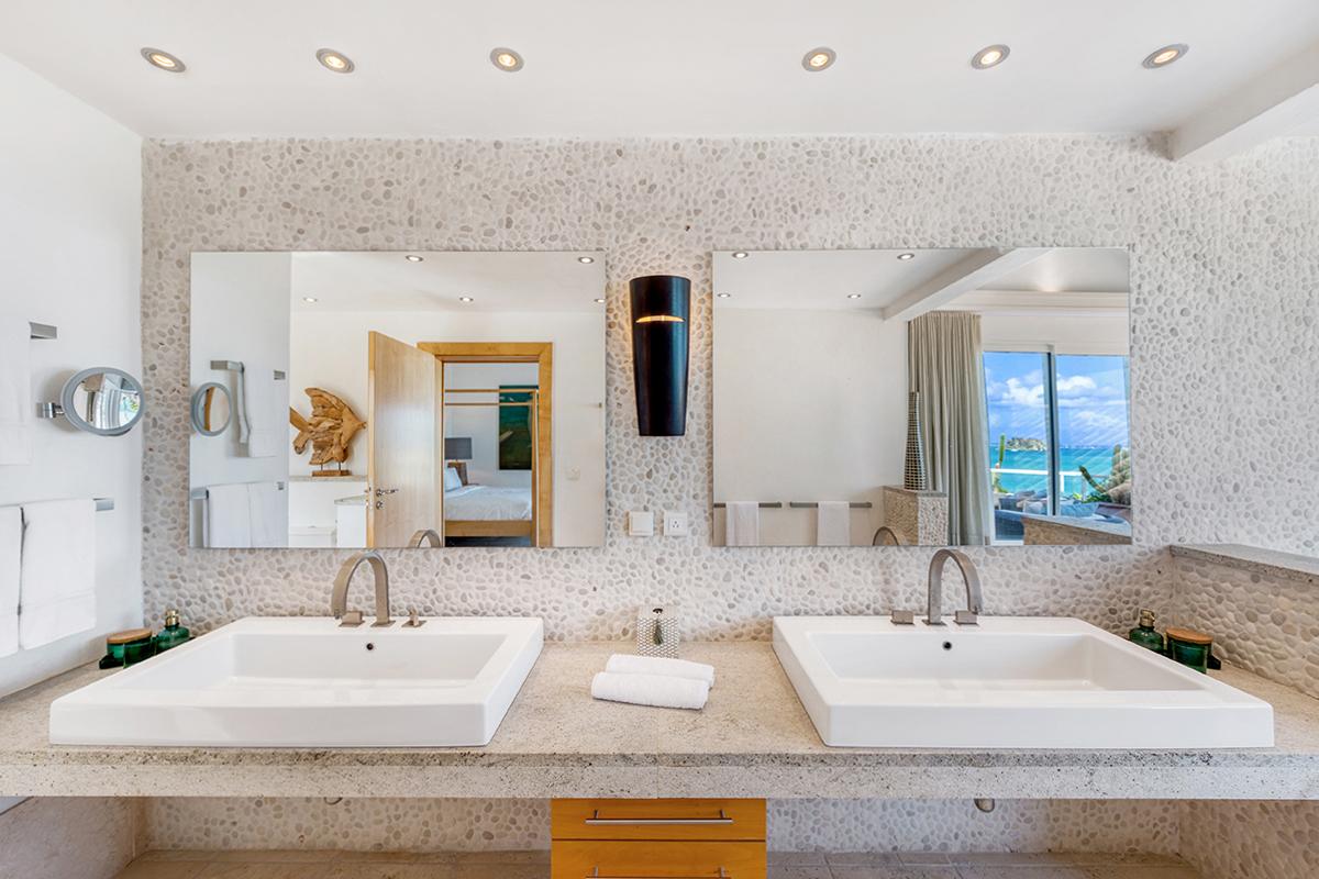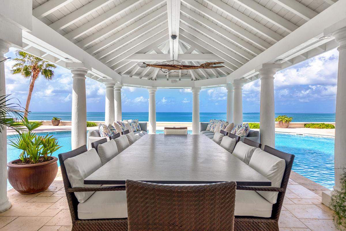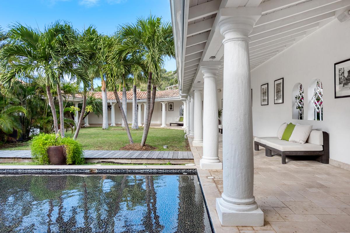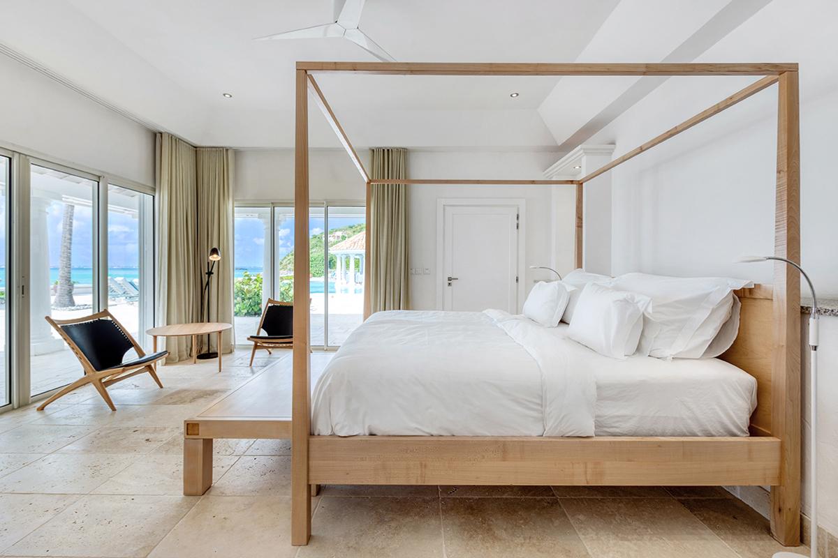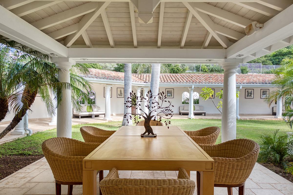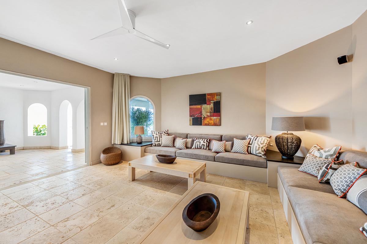 This St. Martin villa rental's principal feature is the oversized wrap-around pool and a central columned gazebo, perfect for al-fresco dining and lounging. The uninterrupted flow between the interior and exterior comes from large glass doors that slide seamlessly into the walls providing a vast living area and adjoining terrace with a stunning backdrop of sea and sky.