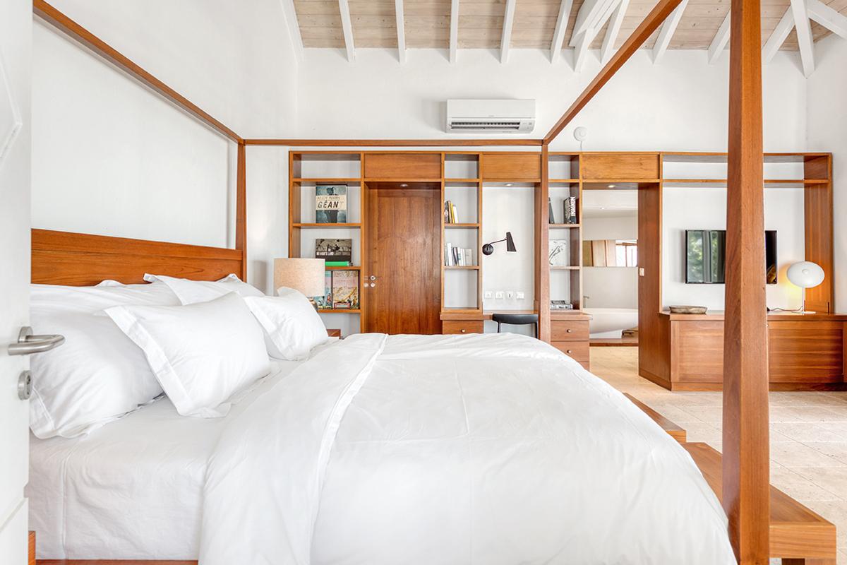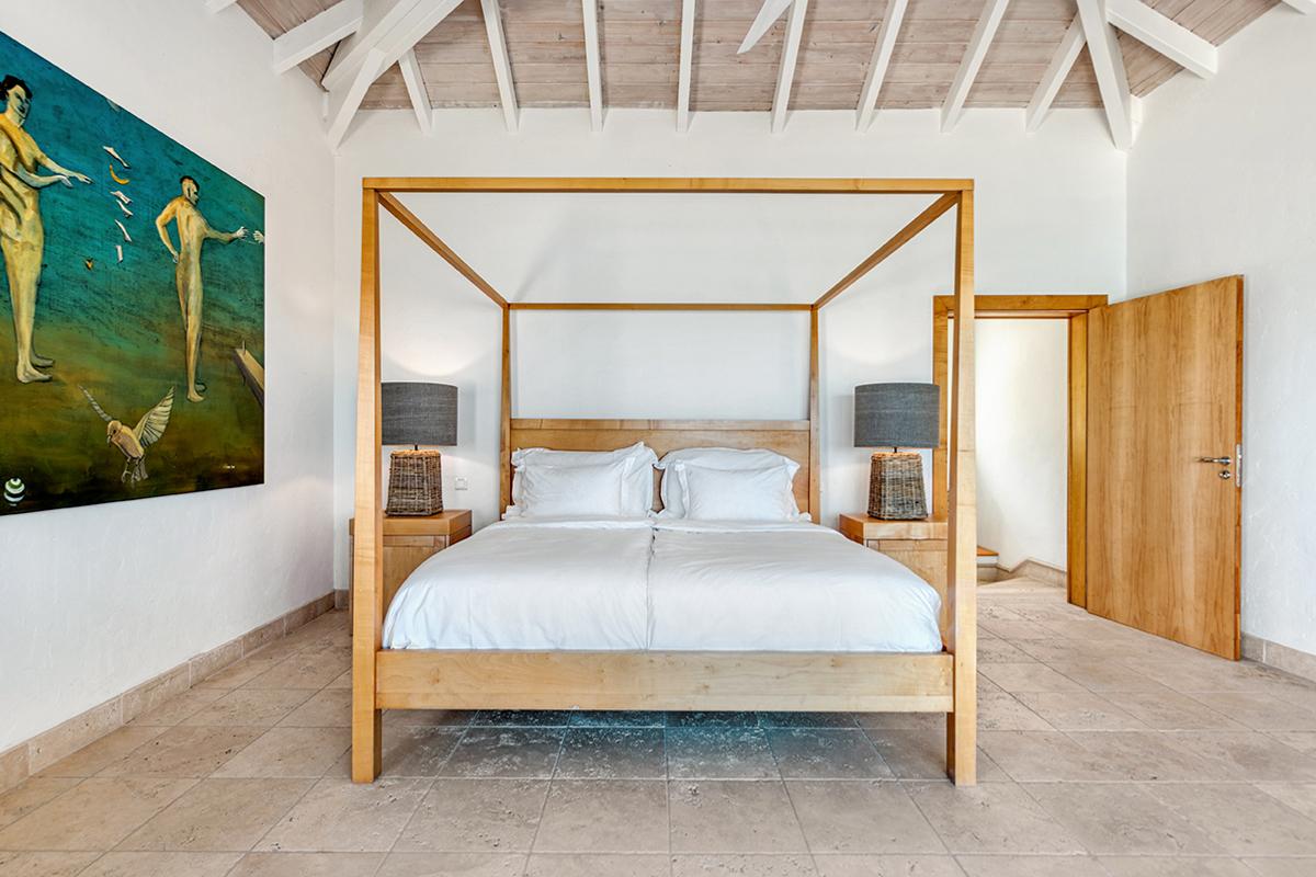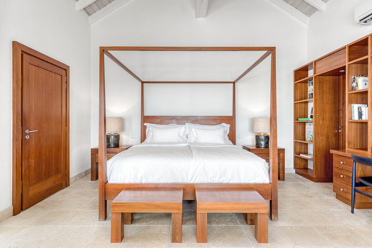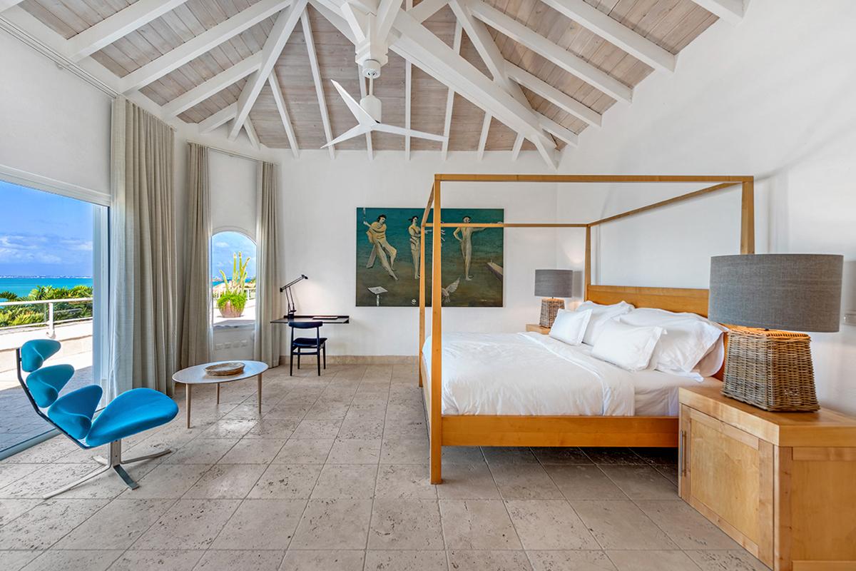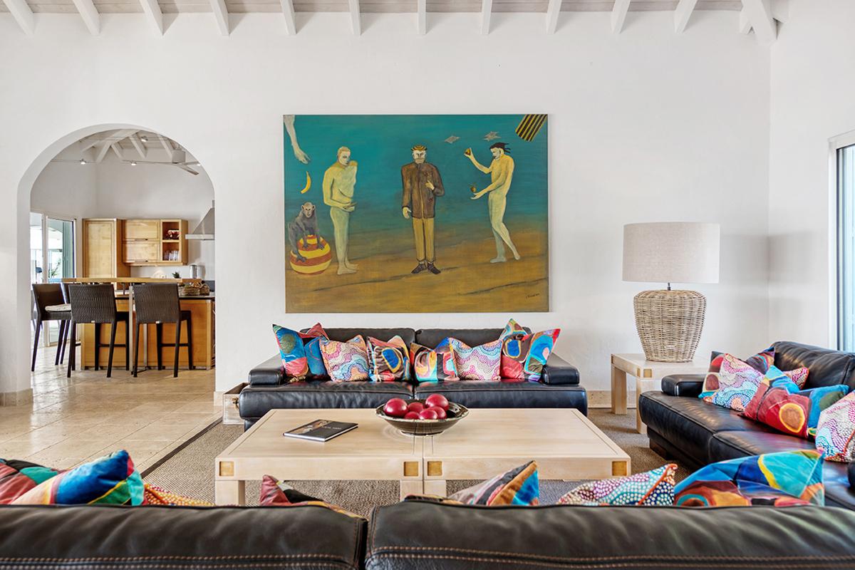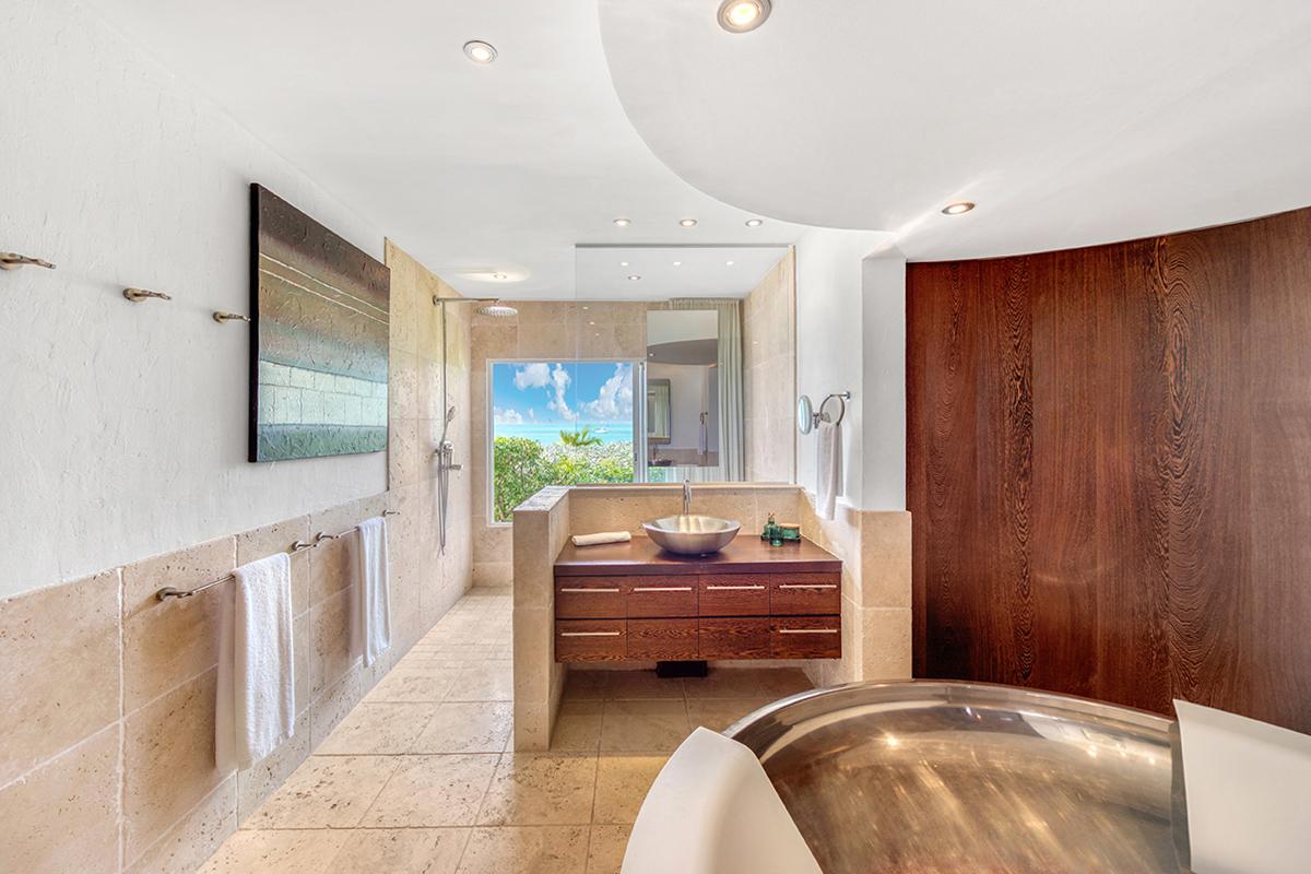 This St. Martin villa rental's principal feature is the oversized wrap-around pool and a central columned gazebo, perfect for al-fresco dining and lounging. The uninterrupted flow between the interior and exterior comes from large glass doors that slide seamlessly into the walls providing a vast living area and adjoining terrace with a stunning backdrop of sea and sky.