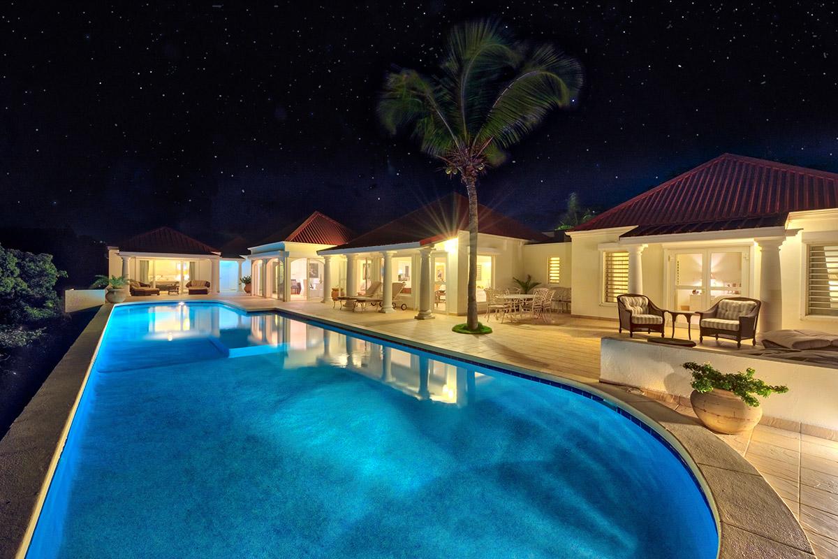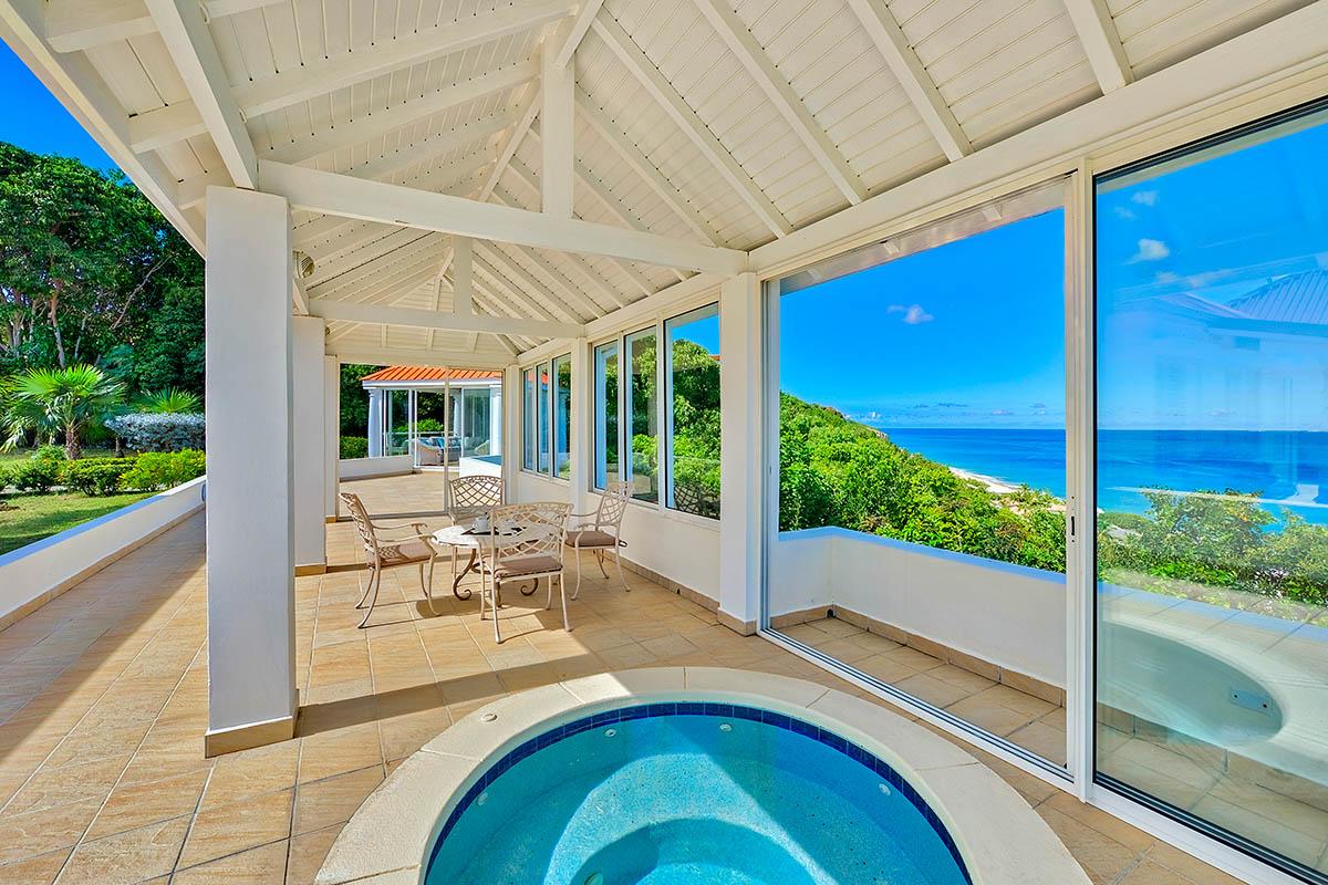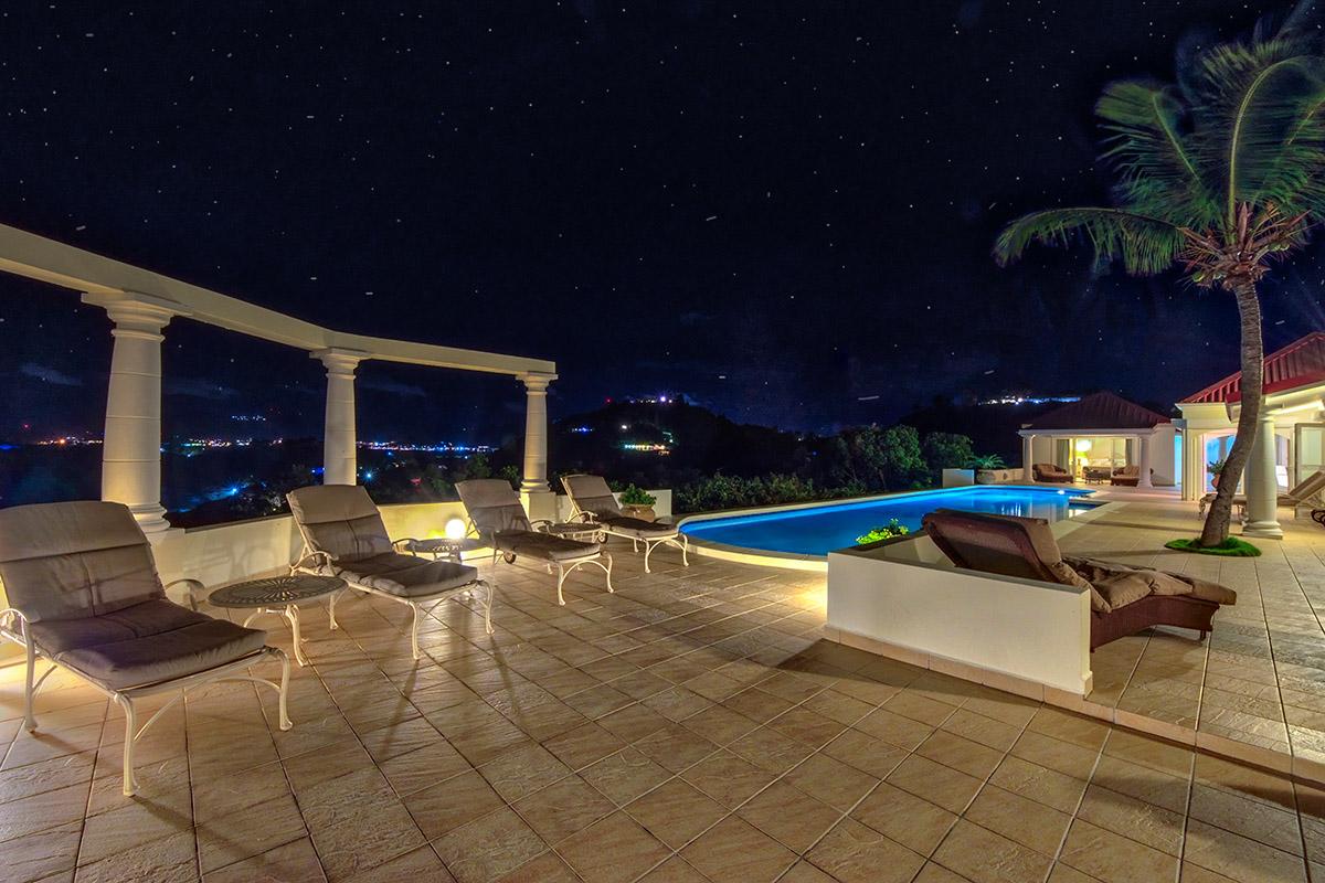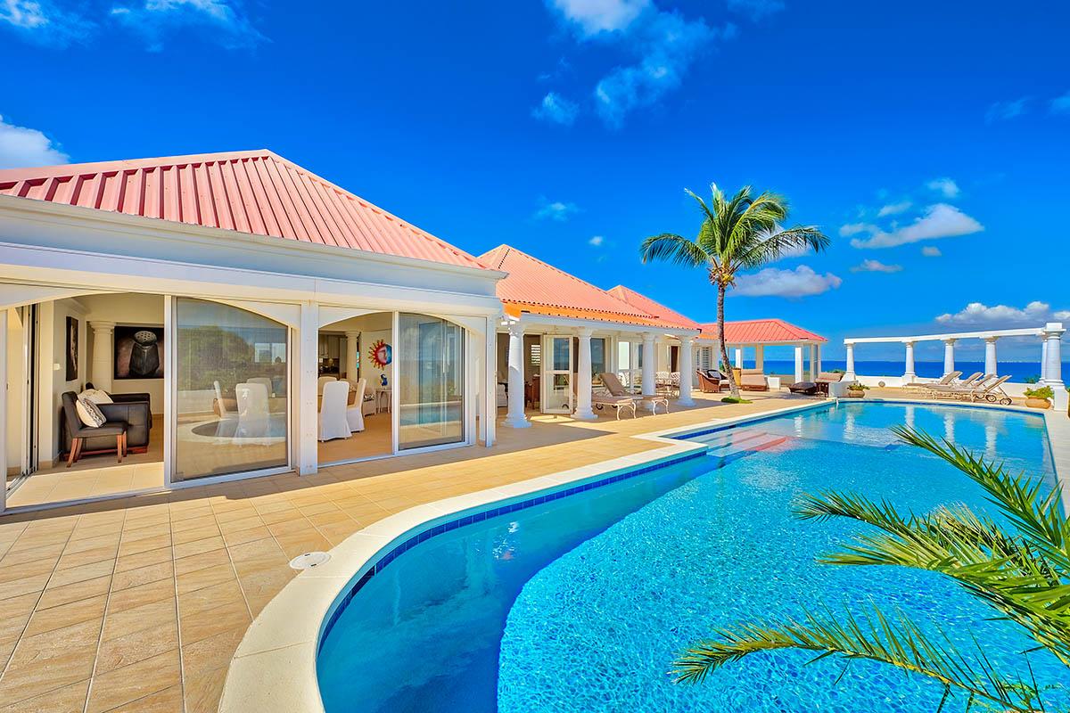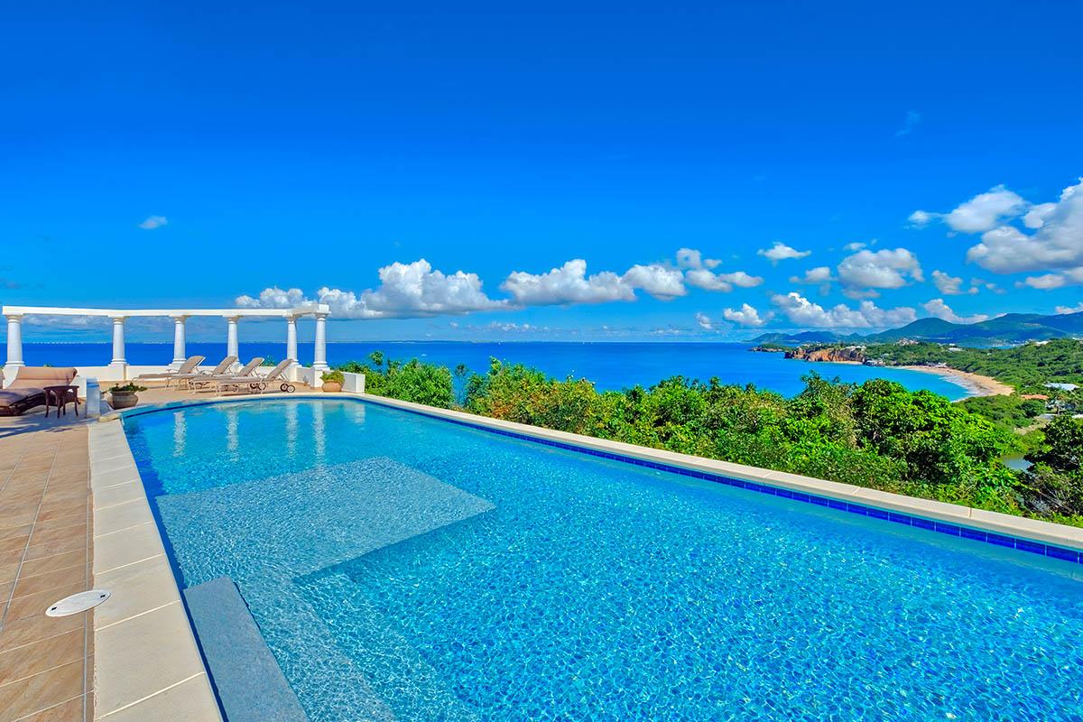 This brand new villa offers spectacular ocean view, a huge custom made kitchen with granite counter tops, a fantastic dining-living room with breathtaking views, a large plasma TV in sitting room with a collection of 200 DVDs and a charming gazebo with stunning views of Baie Rouge beach and Anguilla. This beautiful house turns to a super deluxe fully air conditioned four bedrooms hillside property. The heated pool has been enlarged twice its size, the patio area around the pool is very large and extends towards Bay Rouge. A large shade area has been built for this patio. The patio is extended to the pavilion. The fourth bedroom becomes a large bathroom and a new large bedroom has been added. New large furniture for the main living room and dining room. Plasma TV & DVD in each of the bedrooms. A large gym room has been added with complete equipment and a flat screen TV. A Jacuzzi has been installed in the patio. Free phone calls to USA & Canada (Vonage phone access) and Computer access with Internet high speed connection. Can be rented as a 2-3 & 4 bedroom villa!